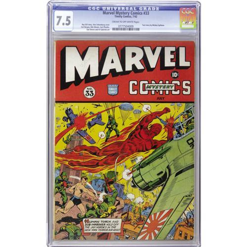 <B>Marvel Mystery Comics #33 (Timely, 1942) CGC VF- 7.5 Cream to off-white pages.</B></I> Our heroes continent-hopped back and forth between Europe and Asia on these Alex Schomburg covers. Here it's the Imperial Army's turn to be abused. Carl Burgos, Bob Oksner, Syd Shores, and Al Gabriele provided interior art, and there's a Mickey Spillane text story inside. Overstreet 2006 VF 8.0 value = $1,156. CGC census 10/06: 2 in 7.5, 3 higher.<BR><BR><b>Shipping:</b> Slabbed Comic (<a target="_blank" href="http://www.heritageauctions.com/common/shipping.php">view shipping information</a>)