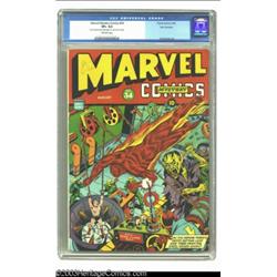 Marvel Mystery Comics #34 San Francisco pedigree (Timely, 1942) CGC VF+ 8.5 Off-white pages. Timely comics in general, and their superhero comics in particular, are so much fun to look at. The all have great action on the cover, and it always continues on the inside; you really get what you paid for. This issue has Bill Everett, Carl Burgos, Martin Goodman, and the Funnies Inc. office in the actual story, and they battle Adolf Hitler himself. World War II-era Timelys are always a sound investment, as the demand for nice copies like this will never meet the meager supply. CGC notes, "Very small amount of dried glue on cover and 1st wrap." Overstreet 2003 VF 8.0 value = $1,140; VF/NM 9/0 value = $1,622. Important notice: Heritage usually auctions material at the rate of 200-250 lots per hour. On some occasions eBay Live bid software or the Internet may not be able to keep up with the pace of the auction. We recommend placing a realistic absentee bid now as insurance to avoid disappointment. Occasionally the auctioneer may eliminate or reject an eBay Live bid, and the auctioneer may also reopen a lot after the close of the eBay live bidding (usually because we missed an audience bid), and may reject your bid even if it shows you as the winning bidder. By bidding via eBay Live, you agree that Heritage may award the lot to another bidder at its sole discretion under the circumstances described above or any other reasonable circumstances. Also please note that all Heritage lots purchased through eBay Live carry a 20% Buyer's Premium. Please make sure you read the Terms and Conditions before you bid.