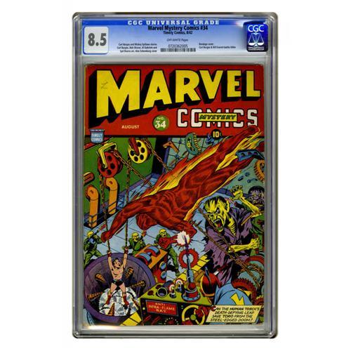 <B>Marvel Mystery Comics #34 (Timely, 1942) CGC VF+ 8.5 Off-white pages.</B></I> Bill Everett and Carl Burgos appear in a story in this issue and also battle Hitler! Also seen in the story are Timely publisher Martin Goodman and the office of Funnies Inc. (the studio that produced this issue for Timely and employed Everett, Burgos, and company). The Human Torch, the Sub-Mariner, the Angel, the Vision, and the Patriot are featured. Overstreet credits the cover to Alex Schomburg. Overstreet 2005 VF 8.0 value = $1,275; VF/NM 9.0 value = $1,963. CGC census 11/05: 2 in 8.5, 1 higher.
