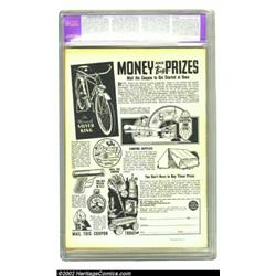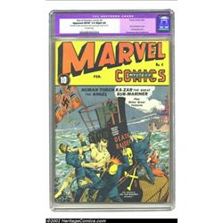 Marvel Mystery Comics #4 (Timely, 1940) CGC Apparent FN/VF 7.0 Slight (A) Off-white pages. This issue is significant for several reasons. The Sub-Mariner is featured on the cover for the first time, as is a Nazi flag. Schomburg moves closer to the frenetic style that collectors love him for, and incorporates a bondaged lass for the first time on this title. The yellow background on the logo was only used four times during the 92 issues of the title, and only once after issue #8. This is a bright, clean copy that has a nicer appearance than the "Apparent" grade CGC has assigned. At this writing, CGC has assigned a grade higher than Fine to only one unrestored book, and grades higher than "Apparent Fine" to only three copies, so this book is in very rare company. CGC notes "Slight" restoration, and notes "Restoration includes: very small color touch, tear seal, glue on spine of cover." Overstreet 2002 FN 6.0 value = $3,000; VF 8.0 value = $6,500. Important notice: We expect to be auctioning lots at the rate of 200-250 per hour. Sometimes eBay Premier live bid software cannot keep up with that pace, so we strongly recommend that you place a realistic proxy bid now as insurance to avoid disappointment. Also please note that all Heritage/CAA lots purchased through eBay Premier carry a 20% Buyer's Premium. Please make sure you read the Terms and Conditions.