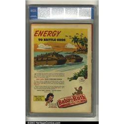 Marvel Mystery Comics #43 (Timely, 1943) CGC VF 8.0 Off-white pages. Pounding through a suspension bridge, Torch and Toro send a battalion of Nazis to their watery grave, as Allied planes zoom in and mop up. Schomburg's work on Marvel Mystery #40-#50 ranks as some of the most classic war covers produced during the Golden Age, and frequently turn up on collectors' want lists. A beautiful copy with a slight staple pull and dust shadow on the cover, but looks NM from the front. Overstreet 2002 VF 8.0 value = $795. Important notice: We expect to be auctioning lots at the rate of 200-250 per hour. Sometimes eBay Premier live bid software cannot keep up with that pace, so we strongly recommend that you place a realistic proxy bid now as insurance to avoid disappointment. Also please note that all Heritage/CAA lots purchased through eBay Premier carry a 20% Buyer's Premium.