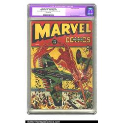 Marvel Mystery Comics #44 (Timely, 1943) CGC Apparent VG 4.0 Slight (P) Off-white pages. One of the hottest books of the run, Schomburg's Superplane cover has been known to cause whiplash when displayed at shows, and should be approached with extreme caution. The master outdoes himself again, creating an image that can be relished for hours. Notice the loads of men and equipment spilling out of the crippled plane as it flies over the Kremlin, as well as the men actually perched on the wings as they fire their weapons at the Human Torch. A solid copy that exhibits a spine roll and average wear, but nothing that detracts from this great image. Restoration includes a reinforcement of the cover. Overstreet 2002 GD 2.0 value = $141; FN 6.0 value = $423. Important notice: We expect to be auctioning lots at the rate of 200-250 per hour. Sometimes eBay Premier live bid software cannot keep up with that pace, so we strongly recommend that you place a realistic proxy bid now as insurance to avoid disappointment. Also please note that all Heritage/CAA lots purchased through eBay Premier carry a 20% Buyer's Premium. Please make sure you read the Terms and Conditions.