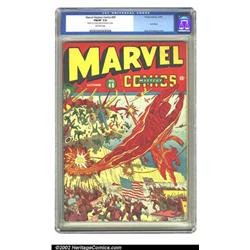 Marvel Mystery Comics #48 (Timely, 1943) CGC FN/VF 7.0 Off-white pages. Another classic busy cover by Alex Schomburg, showing the Human Torch ripping right through a chunk of earth, sending a pile of Nazis plummeting to their doom. The bottom cover is littered with Allies storming the beach, kicking and bayoneting a German along the way. The front cover appears VF/NM, and exhibits a light tint to the blacks, causing the light colors to appear more blended. Foxing and spine wear on the back cover puts the book in the FN/VF range. Overstreet 2002 FN 6.0 value = $381; VF 8.0 value = $795. Important notice: We expect to be auctioning lots at the rate of 200-250 per hour. Sometimes eBay Premier live bid software cannot keep up with that pace, so we strongly recommend that you place a realistic proxy bid now as insurance to avoid disappointment. Also please note that all Heritage/CAA lots purchased through eBay Premier carry a 20% Buyer's Premium. Please make sure you read the Terms and Conditions.
