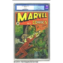 Marvel Mystery Comics #5 (Timely, 1940) CGC VG 4.0 Off-white pages. It's the second Human Torch cover, and Alex Schomburg's fancywork is a "classic" according to Overstreet and anyone else who knows what's what. The mighty triumvirate of Bill Everett, Carl Burgos, and Paul Gustavson provide interior art for this issue, which Overstreet and Gerber agree is a "scarce" issue. Overstreet 2003 VG 4.0 value = $3,600. Important notice: Heritage usually auctions material at the rate of 200-250 lots per hour. On some occasions eBay Live bid software or the Internet may not be able to keep up with the pace of the auction. We recommend placing a realistic absentee bid now as insurance to avoid disappointment. Occasionally the auctioneer may eliminate or reject an eBay Live bid, and the auctioneer may also reopen a lot after the close of the eBay live bidding (usually because we missed an audience bid), and may reject your bid even if it shows you as the winning bidder. By bidding via eBay Live, you agree that Heritage may award the lot to another bidder at its sole discretion under the circumstances described above or any other reasonable circumstances. Since eBay bids are not shown to us until we open the lot on the floor, we treat those bids just like floor bids. In most cases the floor responds before the eBay bid is presented to us, due to Internet lag time, so for consistency we have made it a policy that floor bids are always considered first over tie eBay live bids. Also please note that all Heritage lots purchased through eBay Live carry a 20% Buyer's Premium. Please make sure you read the Terms and Conditions before you bid.
