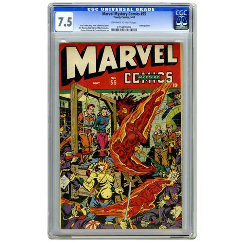 <B>Marvel Mystery Comics #55 (Timely, 1944) CGC VF- 7.5 Off-white to white pages.</B></I> Owners of nice Timelys are loath to part with them, so we're pleased to have this issue to offer to our bidders, the first time we've seen a copy of #55 in several years. The bondage cover by Alex Schomburg is a real winner. In addition to the Human Torch story, this issue has adventures of the Sub-Mariner, the Angel, the Patriot, and Miss America. Overstreet 2006 VF 8.0 value = $856. CGC census 4/06: 2 in 7.5, 8 higher.