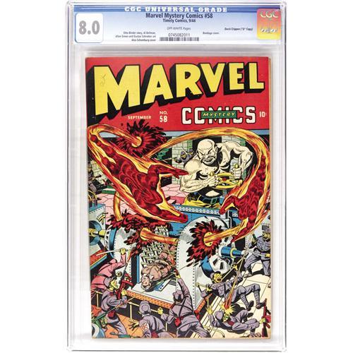 <B>Marvel Mystery Comics #58 Davis Crippen ("D" Copy) pedigree (Timely, 1944) CGC VF 8.0 Off-white pages.</B></I> Years have passed since we've seen this book in any grade, and this VF specimen is certainly a winner. The Alex Schomburg cover stands out in terms of the fiendishness of the torture device and the scariness of the overgrown executioner type. In addition to the Human Torch feature, this issue has adventures of the Sub-Mariner, the Angel, the Patriot, and Miss America. Overstreet 2006 VF 8.0 value = $856. CGC census 6/06: 1 in 8.0, 1 higher. <I>From the Crippen Collection.</B></I> <BR><BR><B>Important notice:</B> Heritage usually auctions material at the rate of 200-250 lots per hour. On some occasions eBay Live bid software or the Internet may not be able to keep up with the pace of the auction. We recommend placing a realistic absentee bid now as insurance to avoid disappointment. Occasionally the auctioneer may eliminate or reject an eBay Live bid, and the auctioneer may also reopen a lot after the close of the eBay live bidding (usually because we missed an audience bid), and may reject your bid even if it shows you as the winning bidder. By bidding via eBay Live, you agree that Heritage may award the lot to another bidder at its sole discretion under the circumstances described above or any other reasonable circumstances. Since eBay bids are not shown to us until we open the lot on the floor, we treat those bids just like floor bids. In most cases the floor responds before the eBay bid is presented to us, due to Internet lag time, so for consistency we have made it a policy that floor bids are always considered first over tie eBay live bids. Also please note that all Heritage lots purchased through eBay Live carry a 22.5% Buyer's Premium. Please make sure you read the Terms and Conditions before you bid. This lot is being auctioned in conjunction with a live floor auction by Heritage Auction Galleries. All final auction and invoice information will be supplied by Heritage Auction Galleries, and all other information should be considered preliminary. Lot:41001 <BR><BR><B>Winning Notification and Billing:</B> After the FINAL session in this auction is complete, Heritage will send e-mail and snail mail invoices. This process normally takes several days. All final auction and invoice information will be supplied by Heritage Auction Galleries, and all other information should be considered preliminary. <BR><BR>This auction will be conducted on a live auction floor and over the Internet through eBay Live. If you choose to place an absentee bid, please take a moment to <font color='#0000ff'><u><a href='http://pages.ebay.com/liveauctions/help/before/laabsentee.html'>learn how eBay Live absentee bidding works</a></u></font><font color='#000000'>