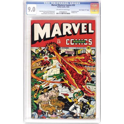 <B>Marvel Mystery Comics #59 Davis Crippen ("D" Copy) pedigree (Timely, 1944) CGC VF/NM 9.0 Off-white to white pages.</B></I> Alex Schomburg's cover featuring the Human Torch and Toro is creepy enough considering all of the poison gas, and inside the comic there's even a decapitation panel. The featured characters here, each appearing in his or her own story, are the Human Torch, the Sub-Mariner, Miss America, the Angel, and the Patriot. Overstreet 2006 VF/NM 9.0 value = $1,353; NM- 9.2 value = $1,850. CGC census 6/06: 2 in 9.0, 1 higher. <I>From the Crippen Collection.</B></I> <BR><BR><B>Important notice:</B> Heritage usually auctions material at the rate of 200-250 lots per hour. On some occasions eBay Live bid software or the Internet may not be able to keep up with the pace of the auction. We recommend placing a realistic absentee bid now as insurance to avoid disappointment. Occasionally the auctioneer may eliminate or reject an eBay Live bid, and the auctioneer may also reopen a lot after the close of the eBay live bidding (usually because we missed an audience bid), and may reject your bid even if it shows you as the winning bidder. By bidding via eBay Live, you agree that Heritage may award the lot to another bidder at its sole discretion under the circumstances described above or any other reasonable circumstances. Since eBay bids are not shown to us until we open the lot on the floor, we treat those bids just like floor bids. In most cases the floor responds before the eBay bid is presented to us, due to Internet lag time, so for consistency we have made it a policy that floor bids are always considered first over tie eBay live bids. Also please note that all Heritage lots purchased through eBay Live carry a 22.5% Buyer's Premium. Please make sure you read the Terms and Conditions before you bid. This lot is being auctioned in conjunction with a live floor auction by Heritage Auction Galleries. All final auction and invoice information will be supplied by Heritage Auction Galleries, and all other information should be considered preliminary. Lot:41001 <BR><BR><B>Winning Notification and Billing:</B> After the FINAL session in this auction is complete, Heritage will send e-mail and snail mail invoices. This process normally takes several days. All final auction and invoice information will be supplied by Heritage Auction Galleries, and all other information should be considered preliminary. <BR><BR>This auction will be conducted on a live auction floor and over the Internet through eBay Live. If you choose to place an absentee bid, please take a moment to <font color='#0000ff'><u><a href='http://pages.ebay.com/liveauctions/help/before/laabsentee.html'>learn how eBay Live absentee bidding works</a></u></font><font color='#000000'>