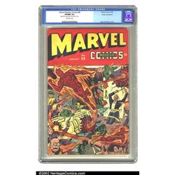 Marvel Mystery Comics #68 Cosmic Aeroplane pedigree (Timely, 1946) CGC VF/NM 9.0 Off-white pages. Schomburg just won't let go of those torture covers. Utilizing the drill schtick one more time, he pits a bunch of baddies against some dinner guests, starting with the guy in the tux, chained to the wall. Torch saves everyone once again--he must have this down to a science by now. A gorgeous copy that has a tiny color chip off of the top corner, but displays an immaculate spine. Overstreet 2002 NM 9.4 value = $1,150. Important notice: We expect to be auctioning lots at the rate of 200-250 per hour. Sometimes eBay Premier live bid software cannot keep up with that pace, so we strongly recommend that you place a realistic proxy bid now as insurance to avoid disappointment. Also please note that all Heritage/CAA lots purchased through eBay Premier carry a 20% Buyer's Premium. Please make sure you read the Terms and Conditions.