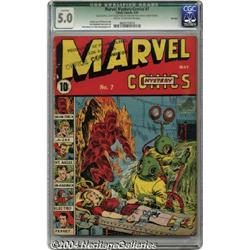 <B>Marvel Mystery Comics #7 File Copy (Timely, 1940) CGC Qualified VG/FN 5.0 Cream to off-white pages.</B></I> Publisher Martin Goodman believed in trying out lots of characters to see which ones caught on. This early Timely book has some that were still going strong 50 years later (Sub-Mariner and Ka-Zar) a couple that were enduring names if not characters (Human Torch, Angel, Electro), and a few who never made it big (like the Ferret). This copy bears the stamp of "Funnies Inc.," the shop that created most of the heroes mentioned above, and whose members Bill Everett, Carl Burgos, Paul Gustavson, and Irwin Hasen all contributed art to this issue. The cover is another great danger scene by Alex Schomburg. CGC notes, "Glue on spine, 12 tiny holes through cover and pages, from a bound volume." Overstreet 2004 GD 2.0 value = $690; VG 4.0 value = $1,380; FN 6.0 value = $2,070. <BR><BR><B>Important notice:</B> Heritage usually auctions material at the rate of 200-250 lots per hour. On some occasions eBay Live bid software or the Internet may not be able to keep up with the pace of the auction. We recommend placing a realistic absentee bid now as insurance to avoid disappointment. Occasionally the auctioneer may eliminate or reject an eBay Live bid, and the auctioneer may also reopen a lot after the close of the eBay live bidding (usually because we missed an audience bid), and may reject your bid even if it shows you as the winning bidder. By bidding via eBay Live, you agree that Heritage may award the lot to another bidder at its sole discretion under the circumstances described above or any other reasonable circumstances. Since eBay bids are not shown to us until we open the lot on the floor, we treat those bids just like floor bids. In most cases the floor responds before the eBay bid is presented to us, due to Internet lag time, so for consistency we have made it a policy that floor bids are always considered first over tie eBay live bids. Also please note that all Heritage lots purchased through eBay Live carry a 20% Buyer's Premium. Please make sure you read the Terms and Conditions before you bid.