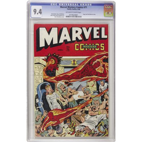 <B>Marvel Mystery Comics #71 (Timely, 1946) CGC NM 9.4 Off-white to white pages. </B></I>Scintillating copy is the perfect accent to another action-fest cover by Alex Schomburg. Human Torch and Toro, Angel, and the Sub-Mariner are featured. Overstreet 2006 NM- 9.2 value = $1,600. CGC census 12/06: 1 in 9.4, 1 higher.<BR><BR><b>Shipping:</b> Slabbed Comic (<a target="_blank" href="http://www.heritageauctions.com/common/shipping.php">view shipping information</a>)