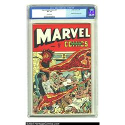 Marvel Mystery Comics #71 (Timely, 1946) CGC VF- 7.5 Off-white pages. Another example of the difficulty in finding this title in better condition than this: of the nine copies CGC has graded to date of issue #71, two copies earned Fine or less, and a mere three copies managed 9.2 or better. On color presentation alone, the Schomburg hypo cover would grade higher, but the spine demonstrates just enough wear, more noticeable from the back cover view, to explain CGC's assessment. Overstreet 2002 VF 8.0 value = $735. Important notice: We expect to be auctioning lots at the rate of 200-250 per hour. Sometimes eBay Premier live bid software cannot keep up with that pace, so we strongly recommend that you place a realistic proxy bid now as insurance to avoid disappointment. Also please note that all Heritage/CAA lots purchased through eBay Premier carry a 20% Buyer's Premium. Please make sure you read the Terms and Conditions.