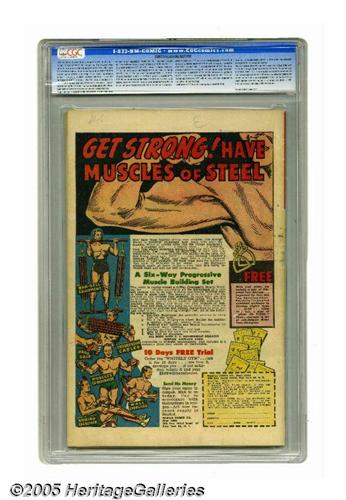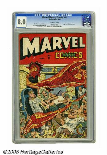 <B>Marvel Mystery Comics #71 (Timely, 1946) CGC VF 8.0 Off-white pages.</B></I> Alex Schomburg not only delivered an exciting cover scene here, he gave us readers something to ponder: are those Egyptian goons reviving Cleopatra, or drugging the archeologist's lovely assistant, or what exactly? When you've figured that out, move on to the superhero tales inside, with the Human Torch, the Sub-Mariner, Miss America, the Patriot, and the Angel all appearing. Overstreet 2005 VF 8.0 value = $719. CGC census 6/05: 1 in 8.0, 5 higher.