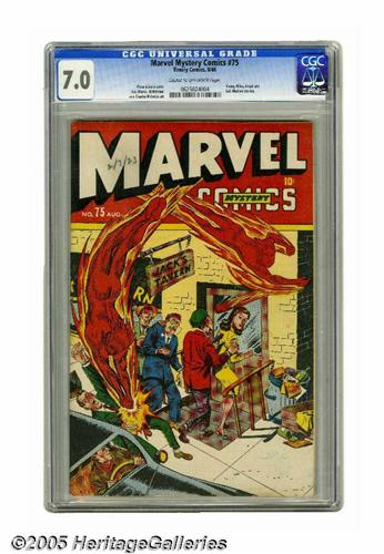 <B>Marvel Mystery Comics #75 (Timely, 1946) CGC FN/VF 7.0 Cream to off-white pages.</B></I> This post-war cover by Vince Alascia demonstrates that the Human Torch and Toro still had plenty to do in peacetime -- like busting up "Jack's Tavern," which sounds like a den of iniquity if ever there was one! The Sub-Mariner, Miss America, the Young Allies, and the Angel also appear. Overstreet 2005 FN 6.0 value = $345; VF 8.0 value = $719. CGC census 6/05: 4 in 7.0, 8 higher.