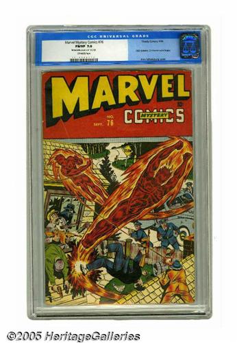 <B>Marvel Mystery Comics #76 (Timely, 1946) CGC FN/VF 7.0 Off-white pages.</B></I> Alex Schomburg's last cover for the title marked the end of a spectacular run of over 50 covers on Timely's flagship series. In this issue a 10-chapter Miss America serial begins. CGC notes, "Name/address stamp on 1st page." Overstreet 2005 FN 6.0 value = $345; VF 8.0 value = $719. CGC census 7/05: 1 in 7.0, 7 higher.