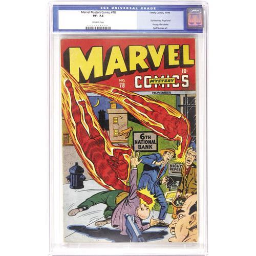 <B>Marvel Mystery Comics #78 (Timely, 1946) CGC VF- 7.5 Off-white pages.</B></I> The fiery duo of the Human Torch and Toro is joined by the Sub-Mariner, Miss America, the Young Allies, and the Angel in this issue. The cover is by Charles Nicholas. Overstreet 2006 VF 8.0 value = $744. CGC census 5/06: 5 in 7.5, 8 higher. <I>From the collection of Patrick Marchbanks.</B></I> <BR><BR><B>Important notice:</B> Heritage usually auctions material at the rate of 200-250 lots per hour. On some occasions eBay Live bid software or the Internet may not be able to keep up with the pace of the auction. We recommend placing a realistic absentee bid now as insurance to avoid disappointment. Occasionally the auctioneer may eliminate or reject an eBay Live bid, and the auctioneer may also reopen a lot after the close of the eBay live bidding (usually because we missed an audience bid), and may reject your bid even if it shows you as the winning bidder. By bidding via eBay Live, you agree that Heritage may award the lot to another bidder at its sole discretion under the circumstances described above or any other reasonable circumstances. Since eBay bids are not shown to us until we open the lot on the floor, we treat those bids just like floor bids. In most cases the floor responds before the eBay bid is presented to us, due to Internet lag time, so for consistency we have made it a policy that floor bids are always considered first over tie eBay live bids. Also please note that all Heritage lots purchased through eBay Live carry a 22.5% Buyer's Premium. Please make sure you read the Terms and Conditions before you bid. This lot is being auctioned in conjunction with a live floor auction by Heritage Auction Galleries. All final auction and invoice information will be supplied by Heritage Auction Galleries, and all other information should be considered preliminary. Lot:41001 <BR><BR><B>Winning Notification and Billing:</B> After the FINAL session in this auction is complete, Heritage will send e-mail and snail mail invoices. This process normally takes several days. All final auction and invoice information will be supplied by Heritage Auction Galleries, and all other information should be considered preliminary. <BR><BR>This auction will be conducted on a live auction floor and over the Internet through eBay Live. If you choose to place an absentee bid, please take a moment to <font color='#0000ff'><u><a href='http://pages.ebay.com/liveauctions/help/before/laabsentee.html'>learn how eBay Live absentee bidding works</a></u></font><font color='#000000'>