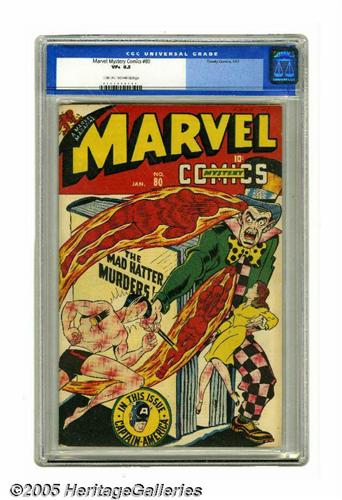 <B>Marvel Mystery Comics #80 (Timely, 1947) CGC VF+ 8.5 Light tan to off-white pages.</B></I> Captain America makes his first appearance in this title. The cover is by Charles Nicholas; the interior artists include Syd Shores, Ken Bald, and Al Gabriele. Overstreet 2005 VF 8.0 value = $875; VF/NM 9.0 value = $1,350. CGC census 7/05: 2 in 8.5, 2 higher.