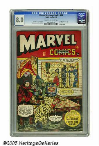 <B>Marvel Mystery Comics #85 (Timely, 1948) CGC VF 8.0 Cream to off-white pages.</B></I> Darn that liquid asbestos! The Human Torch finds himself in trouble again due to a good dousing of the stuff on this busy Timely cover by Syd Shores, which depicts a hanging among the many happenings here. Bill Everett is listed as one of this issue's artists; Miss America makes her last appearance, while Blonde Phantom begins. This keeper copy is currently ranked second-best, condition-wise, by CGC. Overstreet 2005 VF 8.0 value = $613. CGC census 6/05: 1 in 8.0, 2 higher.