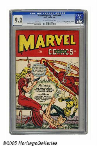 <B>Marvel Mystery Comics #88 (Timely, 1948) CGC NM- 9.2 Off-white to white pages.</B></I> After plenty of action covers, the Marvel gang -- Blonde Phantom, Human Torch, Sun Girl (appearing for the first time in this title), and Sub-Mariner -- decide to take it easy and relax around the pool! Where was Captain America, outside grilling burgers? This fun cover is by Sol Brodsky; Mike Sekowsky, Syd Shores, Ken Bald, and Al Gabriele make it happen inside. Deep red and bright yellow colors really make this cover pop. Overstreet 2005 NM- 9.2 value = $1,375. CGC census 7/05: 3 in 9.2, none higher.