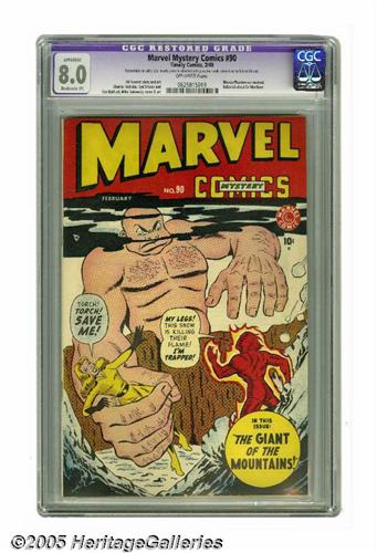 <B>Marvel Mystery Comics #90 (Timely, 1949) CGC Apparent VF 8.0 Moderate (P) Off-white pages.</B></I> This later issue features an editorial concerning Dr. Wertham, of <B>Seduction of the Innocent</B></I> infamy. Blonde Phantom is unmasked; artists include Bill Everett and Ken Bald. CGC notes: "Restoration includes: color touch, piece re-attached with glue, tear seals, cover & centerfold reinforced." Overstreet 2005 GD 2.0 value = $131; VG 4.0 value = $262; FN 6.0 value = $393; VF 8.0 value = $819.