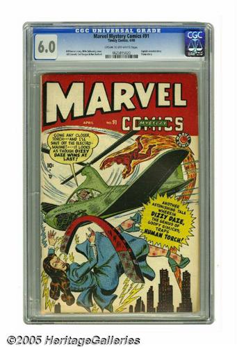 <B>Marvel Mystery Comics #91 (Timely, 1949) CGC FN 6.0 Cream to off-white pages.</B></I> This next-to-last issue is considered scarce by Overstreet. The Human Torch matches wits with Dizzy Daze, the "Genius of Goofy Gimicks" (sic) on the cover; inside, there's Captain America, Venus, and the last Sub-Mariner and Blonde Phantom stories in this title. This is a solid, attractive copy. Overstreet 2005 FN 6.0 value = $393. CGC census 6/05: 1 in 6.0, 1 higher.