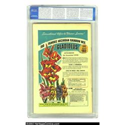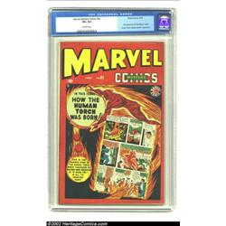 Marvel Mystery Comics #92 (Timely, 1949) CGC VF+ 8.5 Off-white pages. This was the final issue of the illustrious title, but Timely/Atlas managed to keep the series going another ten years, beginning with Marvel Tales #93. Spotlights of the issue were the first appearance of the Witness in this title, a feature story retelling the origin of the Human Torch and the death of his creator Professor Horton, and a Captain America appearance. This is the second-highest grade CGC has given to a copy of the issue, behind one lone 9.2 entry. Like many "final" title issues, this book is harder to find than some issues immediately preceding, rating an "uncommon" designation from Gerber. Overstreet 2002 VF 8.0 value = $1,763; NM 9.4 value = $3,100. Important notice: We expect to be auctioning lots at the rate of 200-250 per hour. Sometimes eBay Premier live bid software cannot keep up with that pace, so we strongly recommend that you place a realistic proxy bid now as insurance to avoid disappointment. Also please note that all Heritage/CAA lots purchased through eBay Premier carry a 20% Buyer's Premium. Please make sure you read the Terms and Conditions.
