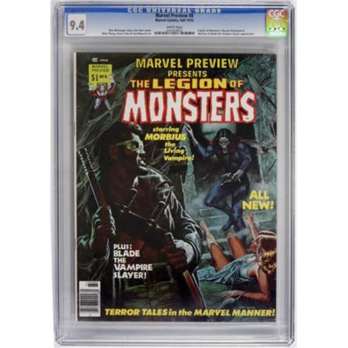 <B>Marvel Preview #8 (Marvel, 1976) CGC NM 9.4 White pages.</B></I> Legion of Monsters. Morbius and Blade the Vampire Slayer stories. Ken Barr cover. Mike Ploog, Gene Colan, and Val Mayerik art. Vicente Alcazar frontispiece Overstreet 2007 NM- 9.2 value = $26. CGC census 10/07: 3 in 9.4, 2 higher.<BR><BR><b>Shipping:</b> Comics - Slabbed (certified) (<a target="_blank" href="http://www.heritageauctions.com/common/shipping.php">view shipping information</a>)