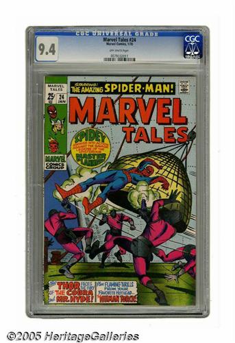 <B>Marvel Tales #24 (Marvel, 1970) CGC NM 9.4 Off-white pages.</B></I> Spider-Man, Thor, and Human Torch reprints. Steve Ditko, Jack Kirby, and Dick Ayers art. Overstreet 2005 NM- 9.2 value = $20. CGC census 3/05: 4 in 9.4, none higher.