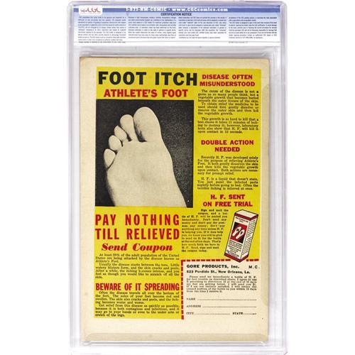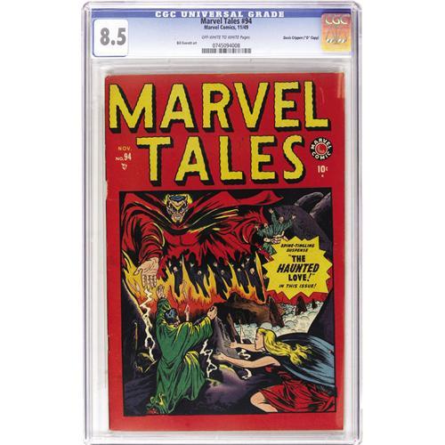 <B>Marvel Tales #94 Davis Crippen ("D" Copy) pedigree (Atlas, 1949) CGC VF+ 8.5 Off-white to white pages.</B></I> Formerly <B>Marvel Mystery Comics</B></I>, this second issue post-title change has interior art by Bill Everett. This is one of only two copies certified by CGC to date, the other grading at FN 6.0. Overstreet 2006 VF 8.0 value = $588; VF/NM 9.0 value = $932. CGC census 7/06: 1 in 8.5, none higher. <I>From the Crippen Collection.</B></I> <BR><BR><B>Important notice:</B> Heritage usually auctions material at the rate of 200-250 lots per hour. On some occasions eBay Live bid software or the Internet may not be able to keep up with the pace of the auction. We recommend placing a realistic absentee bid now as insurance to avoid disappointment. Occasionally the auctioneer may eliminate or reject an eBay Live bid, and the auctioneer may also reopen a lot after the close of the eBay live bidding (usually because we missed an audience bid), and may reject your bid even if it shows you as the winning bidder. By bidding via eBay Live, you agree that Heritage may award the lot to another bidder at its sole discretion under the circumstances described above or any other reasonable circumstances. Since eBay bids are not shown to us until we open the lot on the floor, we treat those bids just like floor bids. In most cases the floor responds before the eBay bid is presented to us, due to Internet lag time, so for consistency we have made it a policy that floor bids are always considered first over tie eBay live bids. Also please note that all Heritage lots purchased through eBay Live carry a 22.5% Buyer's Premium. Please make sure you read the Terms and Conditions before you bid. This lot is being auctioned in conjunction with a live floor auction by Heritage Auction Galleries. All final auction and invoice information will be supplied by Heritage Auction Galleries, and all other information should be considered preliminary. Lot:41001 <BR><BR><B>Winning Notification and Billing:</B> After the FINAL session in this auction is complete, Heritage will send e-mail and snail mail invoices. This process normally takes several days. All final auction and invoice information will be supplied by Heritage Auction Galleries, and all other information should be considered preliminary. <BR><BR>This auction will be conducted on a live auction floor and over the Internet through eBay Live. If you choose to place an absentee bid, please take a moment to <font color='#0000ff'><u><a href='http://pages.ebay.com/liveauctions/help/before/laabsentee.html'>learn how eBay Live absentee bidding works</a></u></font><font color='#000000'>