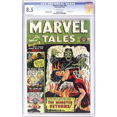 <B>Marvel Tales #96 (Atlas, 1950) CGC VF+ 8.5 Off-white pages.</B></I> Syd Shores contributed a great bondage cover to this issue. Mike Sekowsky art is also featured. Overstreet 2006 VF 8.0 value = $406; VF/NM 9.0 value = $641. CGC census 5/06: 1 in 8.5, 2 higher. <BR><BR><B>Important notice:</B> Heritage usually auctions material at the rate of 200-250 lots per hour. On some occasions eBay Live bid software or the Internet may not be able to keep up with the pace of the auction. We recommend placing a realistic absentee bid now as insurance to avoid disappointment. Occasionally the auctioneer may eliminate or reject an eBay Live bid, and the auctioneer may also reopen a lot after the close of the eBay live bidding (usually because we missed an audience bid), and may reject your bid even if it shows you as the winning bidder. By bidding via eBay Live, you agree that Heritage may award the lot to another bidder at its sole discretion under the circumstances described above or any other reasonable circumstances. Since eBay bids are not shown to us until we open the lot on the floor, we treat those bids just like floor bids. In most cases the floor responds before the eBay bid is presented to us, due to Internet lag time, so for consistency we have made it a policy that floor bids are always considered first over tie eBay live bids. Also please note that all Heritage lots purchased through eBay Live carry a 22.5% Buyer's Premium. Please make sure you read the Terms and Conditions before you bid. This lot is being auctioned in conjunction with a live floor auction by Heritage Auction Galleries. All final auction and invoice information will be supplied by Heritage Auction Galleries, and all other information should be considered preliminary. Lot:41001 <BR><BR><B>Winning Notification and Billing:</B> After the FINAL session in this auction is complete, Heritage will send e-mail and snail mail invoices. This process normally takes several days. All final auction and invoice information will be supplied by Heritage Auction Galleries, and all other information should be considered preliminary. <BR><BR>This auction will be conducted on a live auction floor and over the Internet through eBay Live. If you choose to place an absentee bid, please take a moment to <font color='#0000ff'><u><a href='http://pages.ebay.com/liveauctions/help/before/laabsentee.html'>learn how eBay Live absentee bidding works</a></u></font><font color='#000000'>