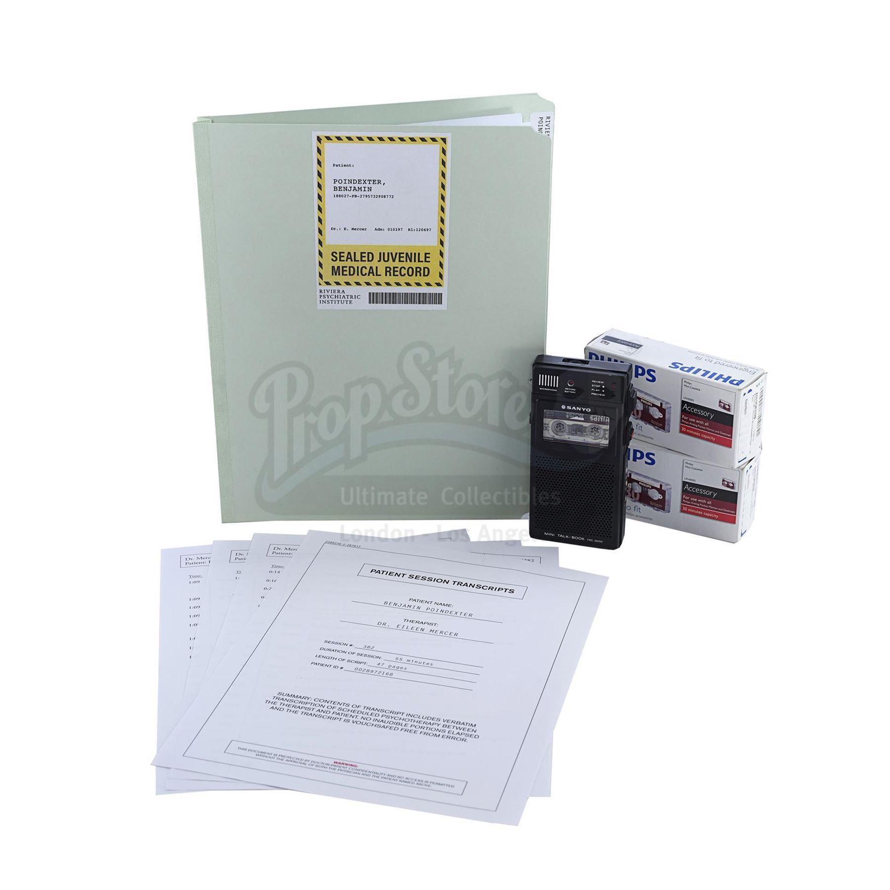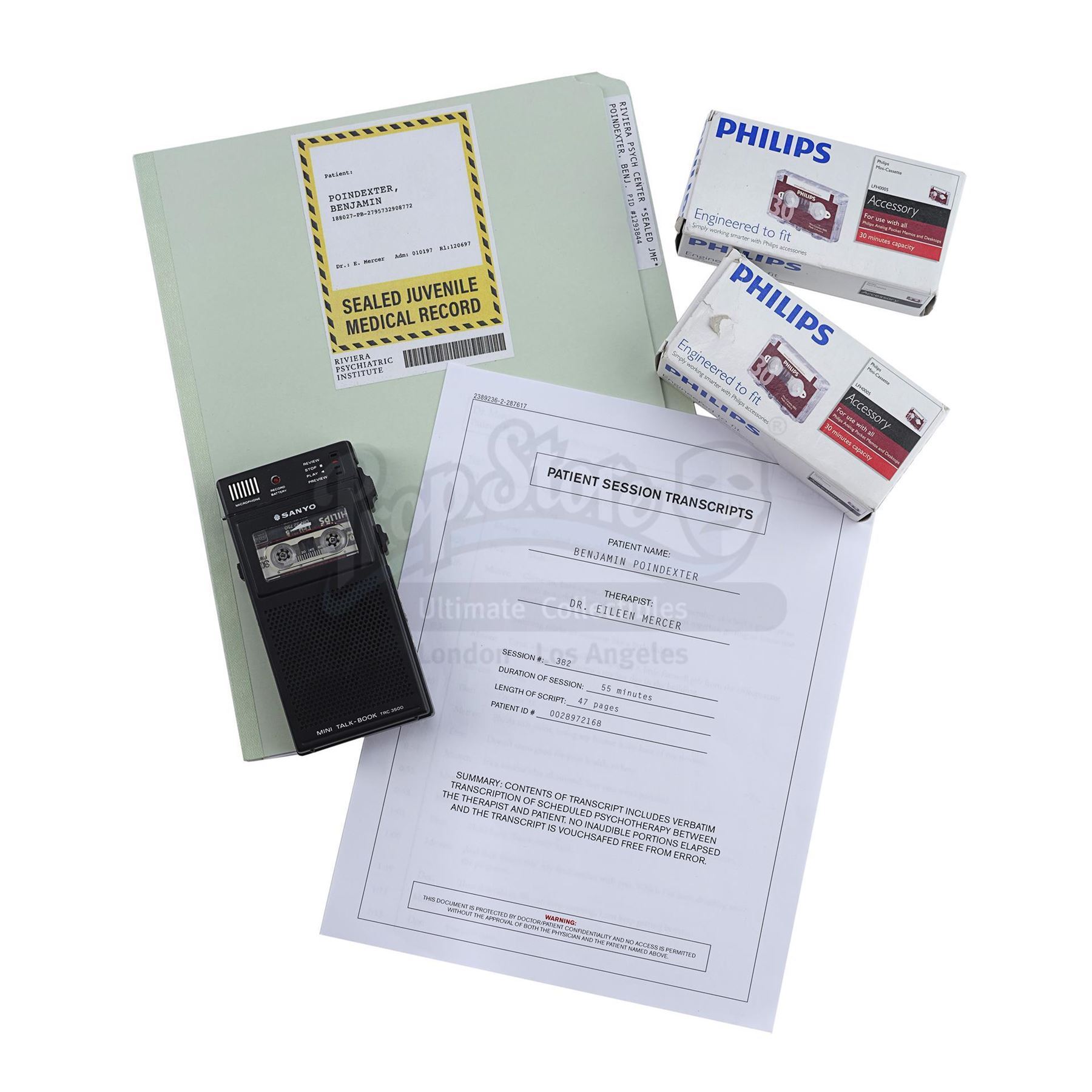 Benjamin 'Dex' Poindexter's recorder and tapes with medical records and transcripts from the episodes 'The Perfect Game' (305) and 'The Devil You Know' (306) of Marvel's Daredevil. In the episodes, Wilson Fisk looks over Dr. Mercer's notes on young Poindexter's increasing psychopathology. Later, the adult Poindexter listens to tapes from his childhood therapy sessions. This lot consists of a green folder labeled 'POINDEXTER, BENJAMIN', four sheets of records, four pages of a patient session transcript between Poindexter and Mercer, and a battery-powered metal tape recorder with 20 microcassettes. The lot is in excellent overall condition with minor signs of wear from production. This item contains electronic and mechanical components. While every effort is made to describe them accurately, no guarantee or warranty is made as to the functionality, lifespan or safety of those components. It is entirely incumbent on the new owner to satisfy themselves as to their safe use and maintenance.