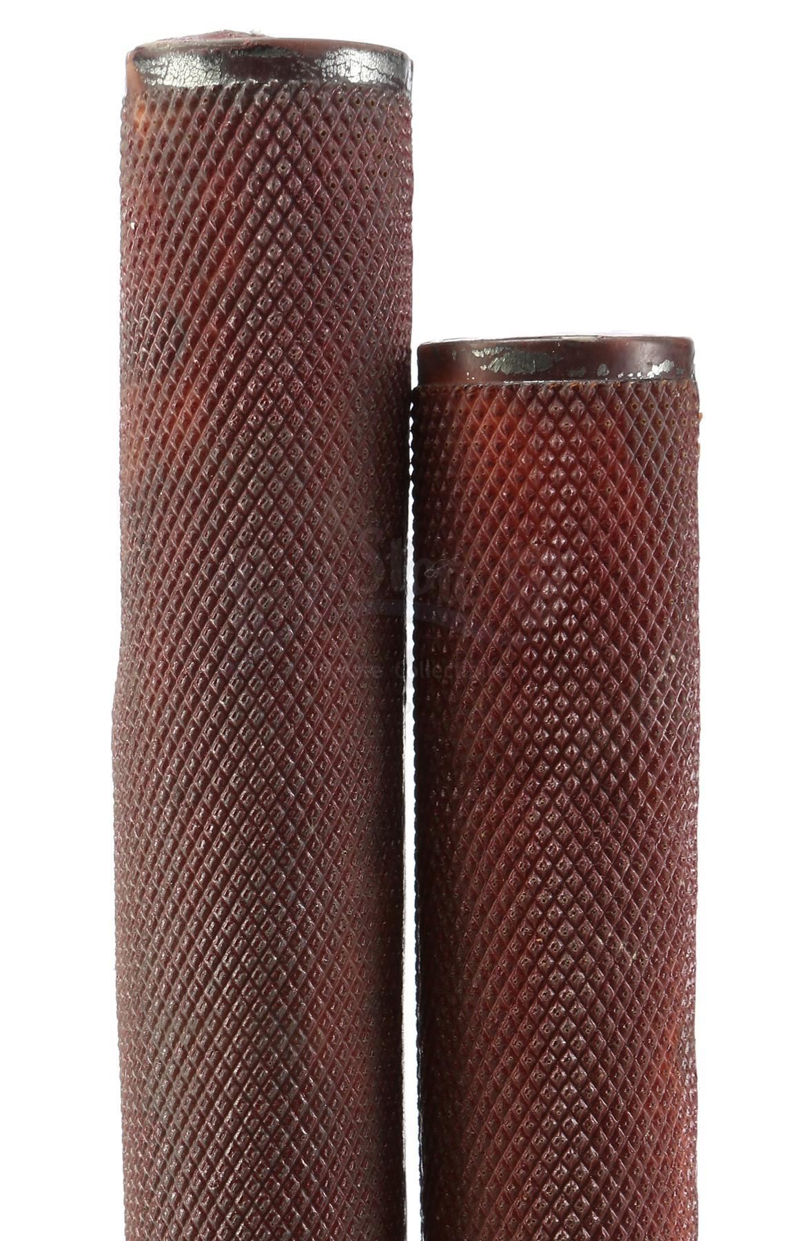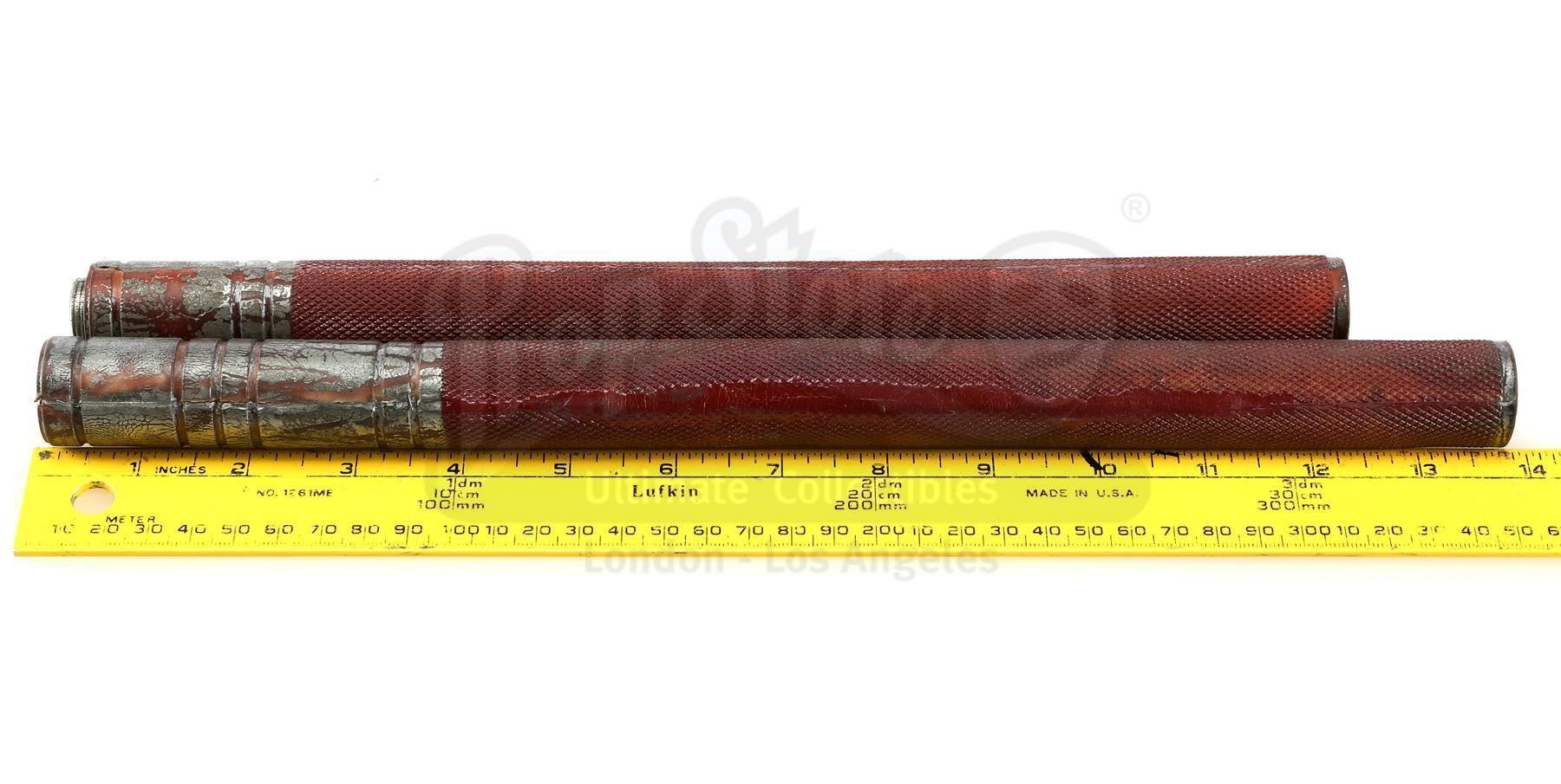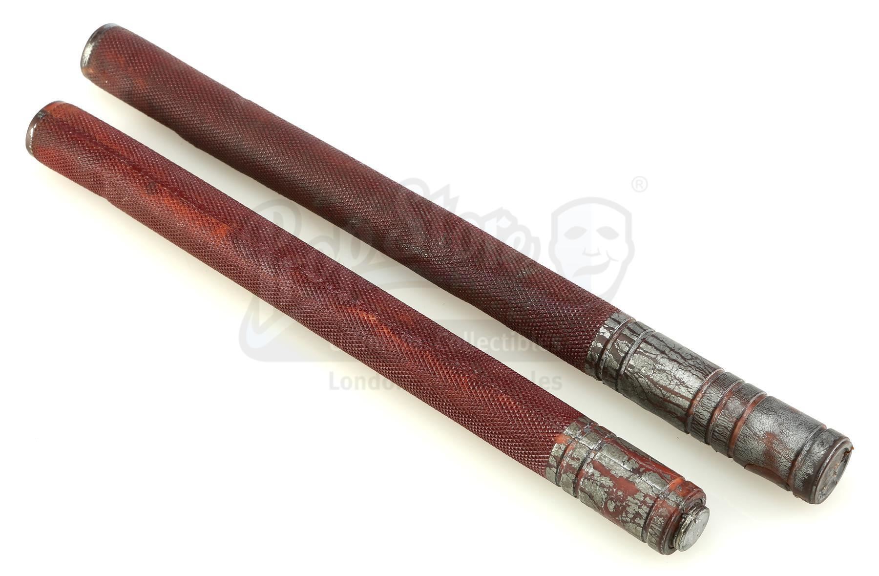 Benjamin 'Dex' Poindexter's stunt separated foam rubber billy clubs from Season 3 of Marvel's Daredevil. Poindexter uses his billy clubs to impersonate masked vigilante Daredevil throughout the season under the direction of Wilson Fisk. This lot consists of a pair of crimson and gunmetal gray foam rubber billy clubs with ridged sides for gripping and metal inserts for structure. The lot is in fair overall condition with wear from production, including significant scuffing and paint chipping.