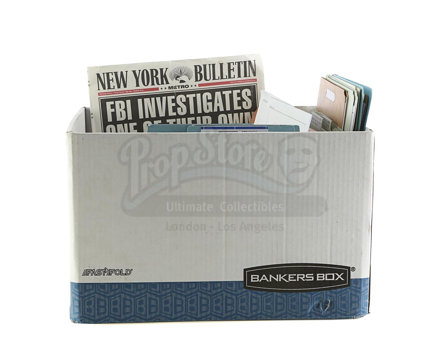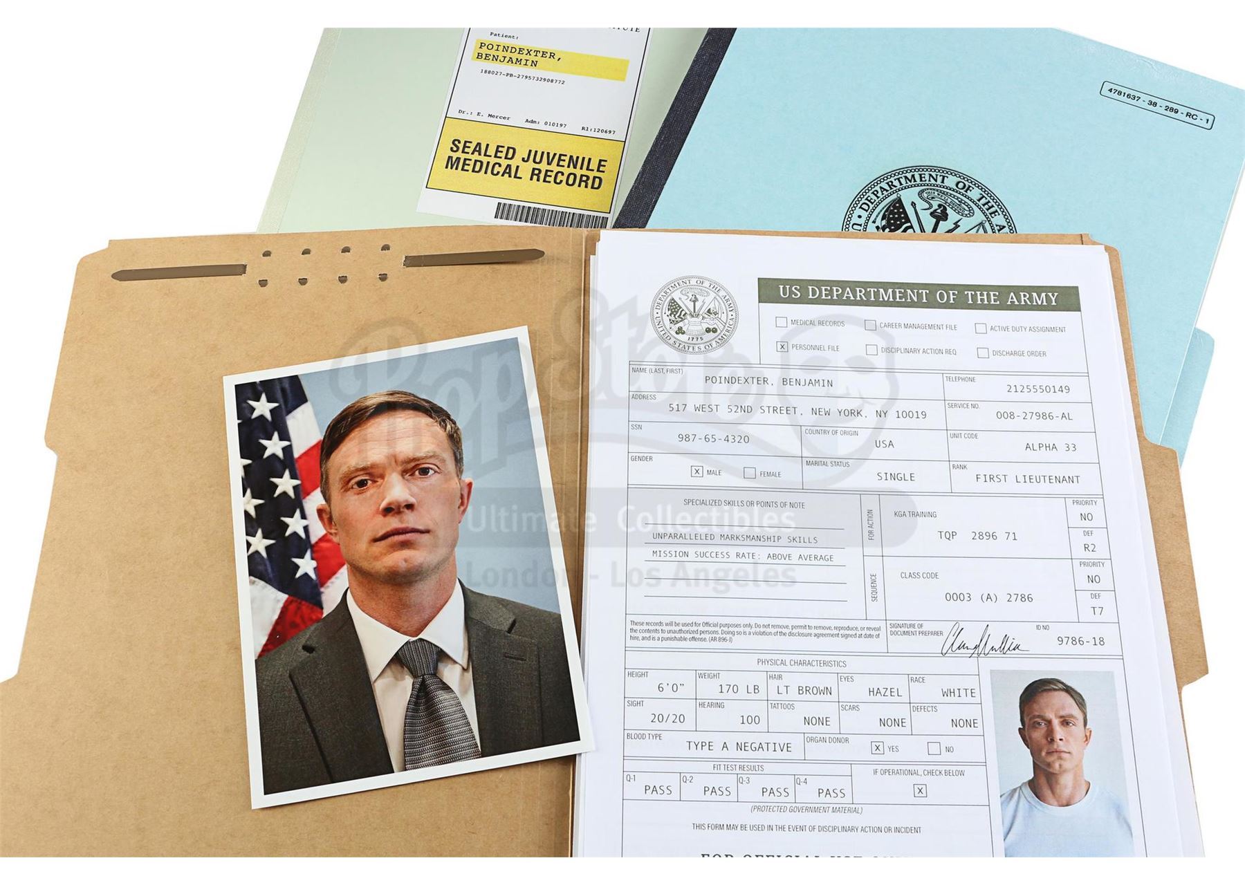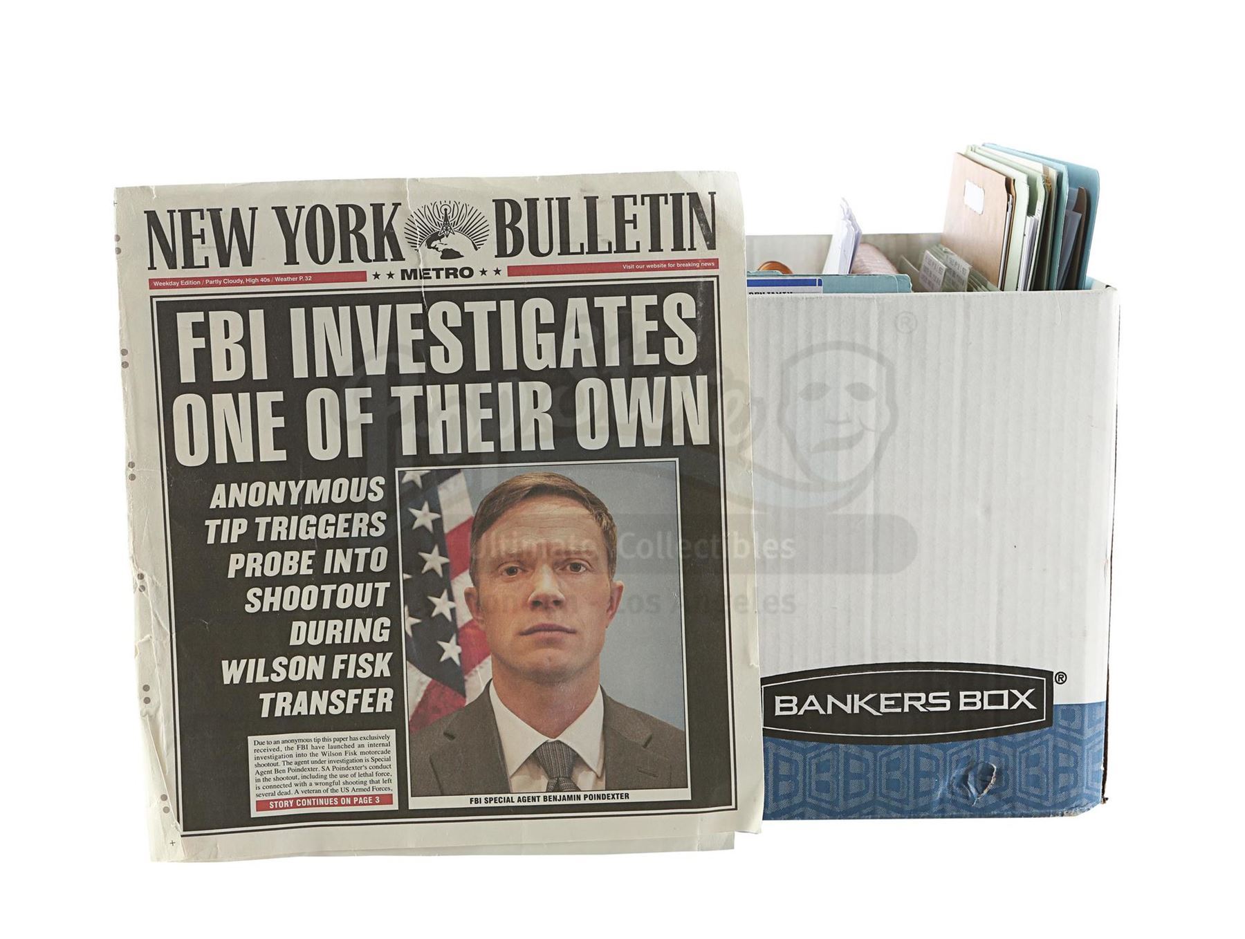 Dr. Eileen Mercer's files on Benjamin 'Dex' Poindexter with Poindexter's newspaper from the episodes 'The Perfect Game' (305) and 'The Devil You Know' (306), respectively, of Marvel's Daredevil. In the episodes, Mercer compiles psychiatric files on young Poindexter, who later sees a newspaper article that is specifically critical of him. This lot consists of a variety of files, folders, and miniature audio tapes labeled for Mercer and Poindexter, including Poindexter's medical record, psych evaluation, and session transcripts, as well as a New York Bulletin newspaper cover headlined 'FBI Investigates One of Their Own'. The lot is in good overall condition with some crinkling and creasing to the newspaper from production.