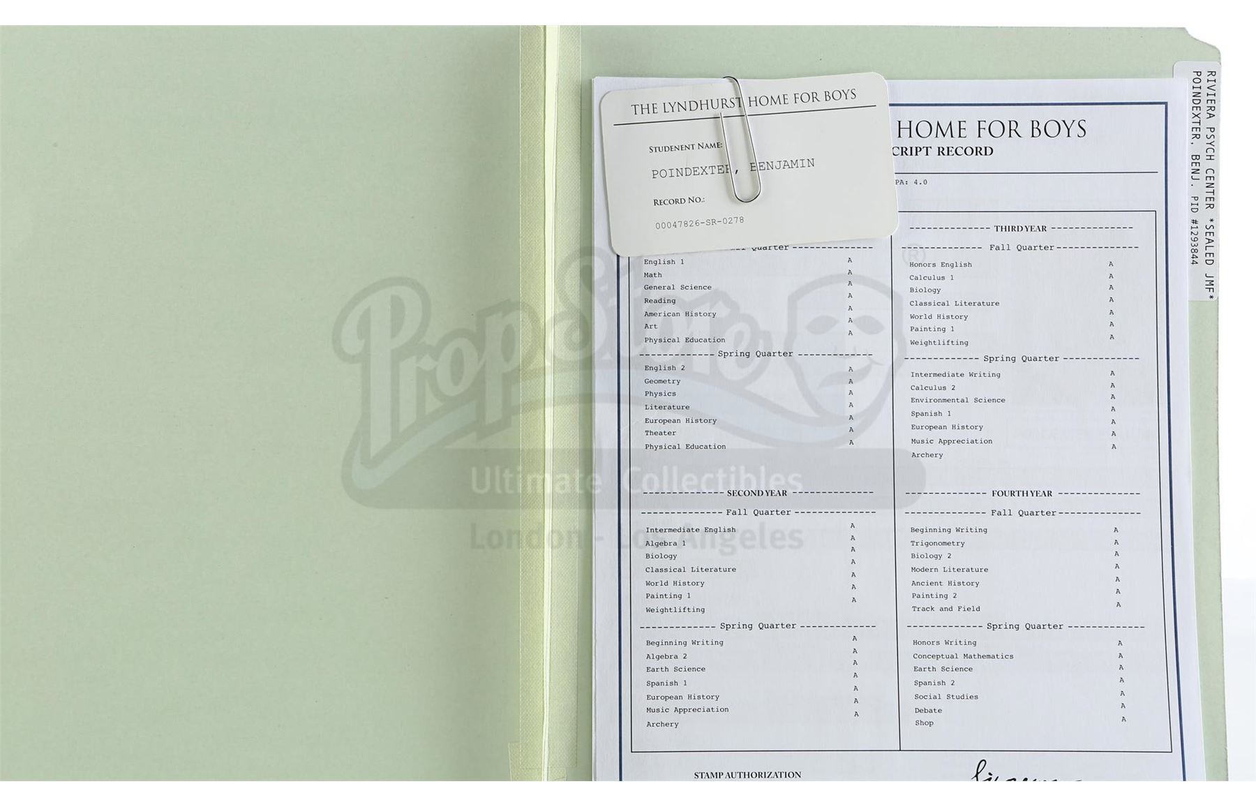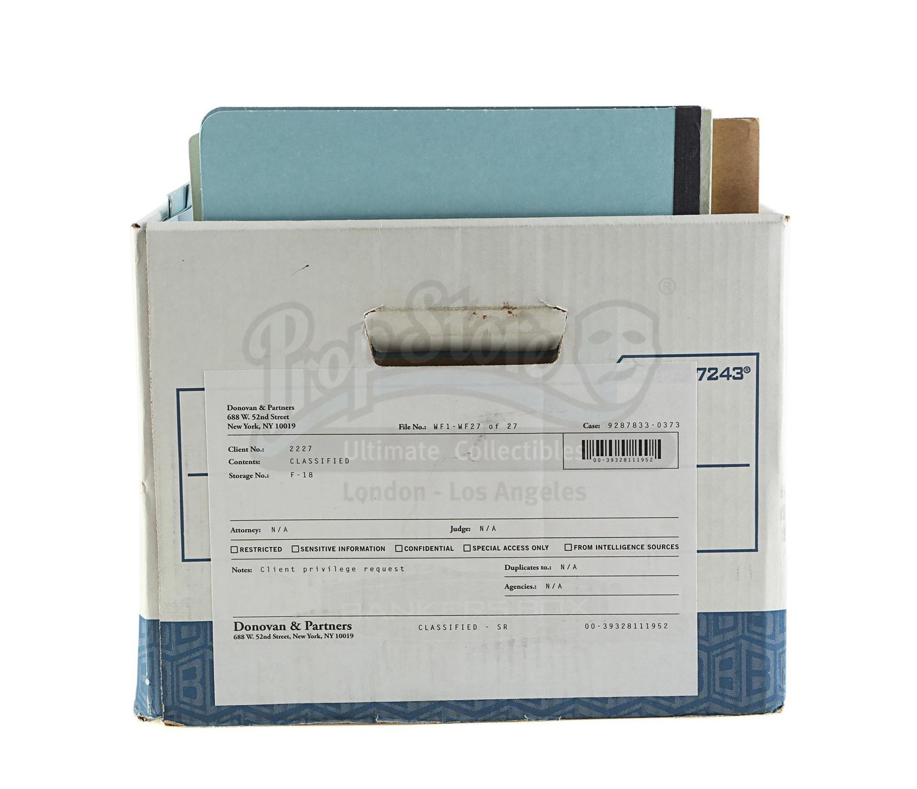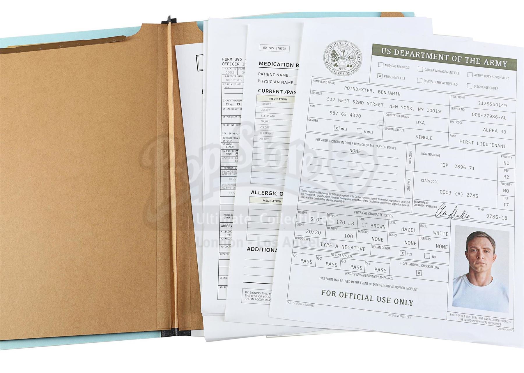 Dr. Eileen Mercer's files on Benjamin 'Dex' Poindexter with Poindexter's newspaper from the episodes 'The Perfect Game' (305) and 'The Devil You Know' (306), respectively, of Marvel's Daredevil. In the episodes, Mercer compiles psychiatric files on young Poindexter, who later sees a newspaper article that is specifically critical of him. This lot consists of a variety of files, folders, and miniature audio tapes labeled for Mercer and Poindexter, including Poindexter's medical record, psych evaluation, and session transcripts, as well as a New York Bulletin newspaper cover headlined 'FBI Investigates One of Their Own'. The lot is in good overall condition with some crinkling and creasing to the newspaper from production.