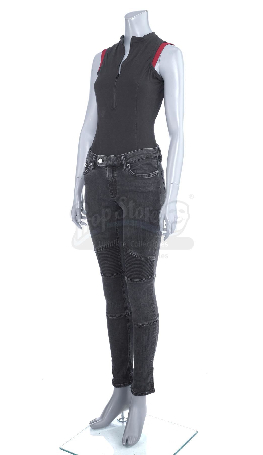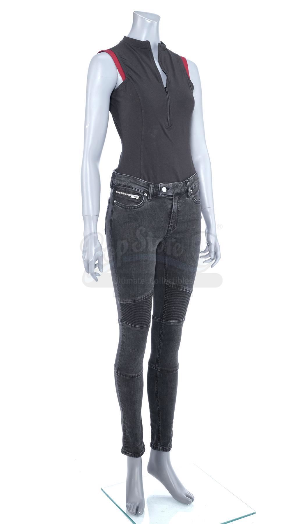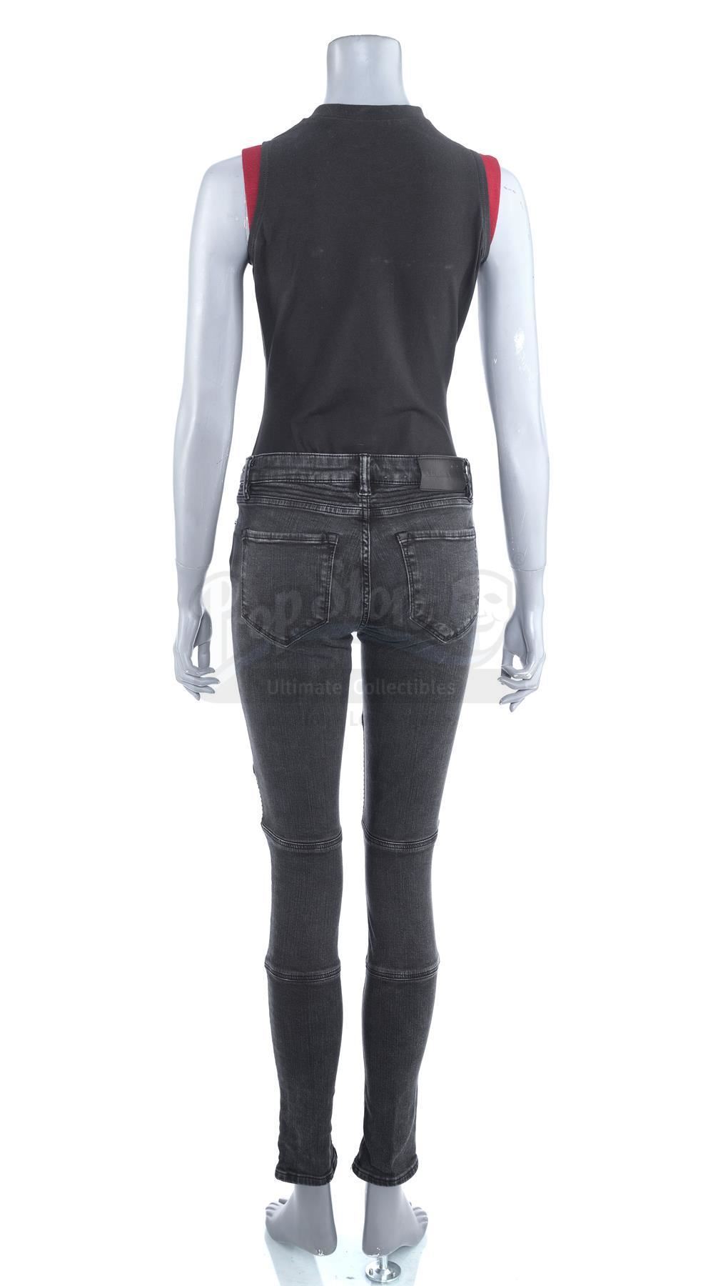 Elektra Natchios' stunt tunnel discovery costume and sai prototypes from the episode 'Semper Fidelis' (207) of Marvel's Daredevil. In the episode, Natchios wears her costume when she and Matt Murdock come upon a tunnel being dug by the Yakuza. This lot consists of a black and red cotton and spandex leotard labeled '#106', a pair of matching stunt gloves, a pair of black pleated jeans, and a pair of 3D printed, unpainted white nylon production-made sai prototypes. The lot is in good overall condition with some signs of wear from production.