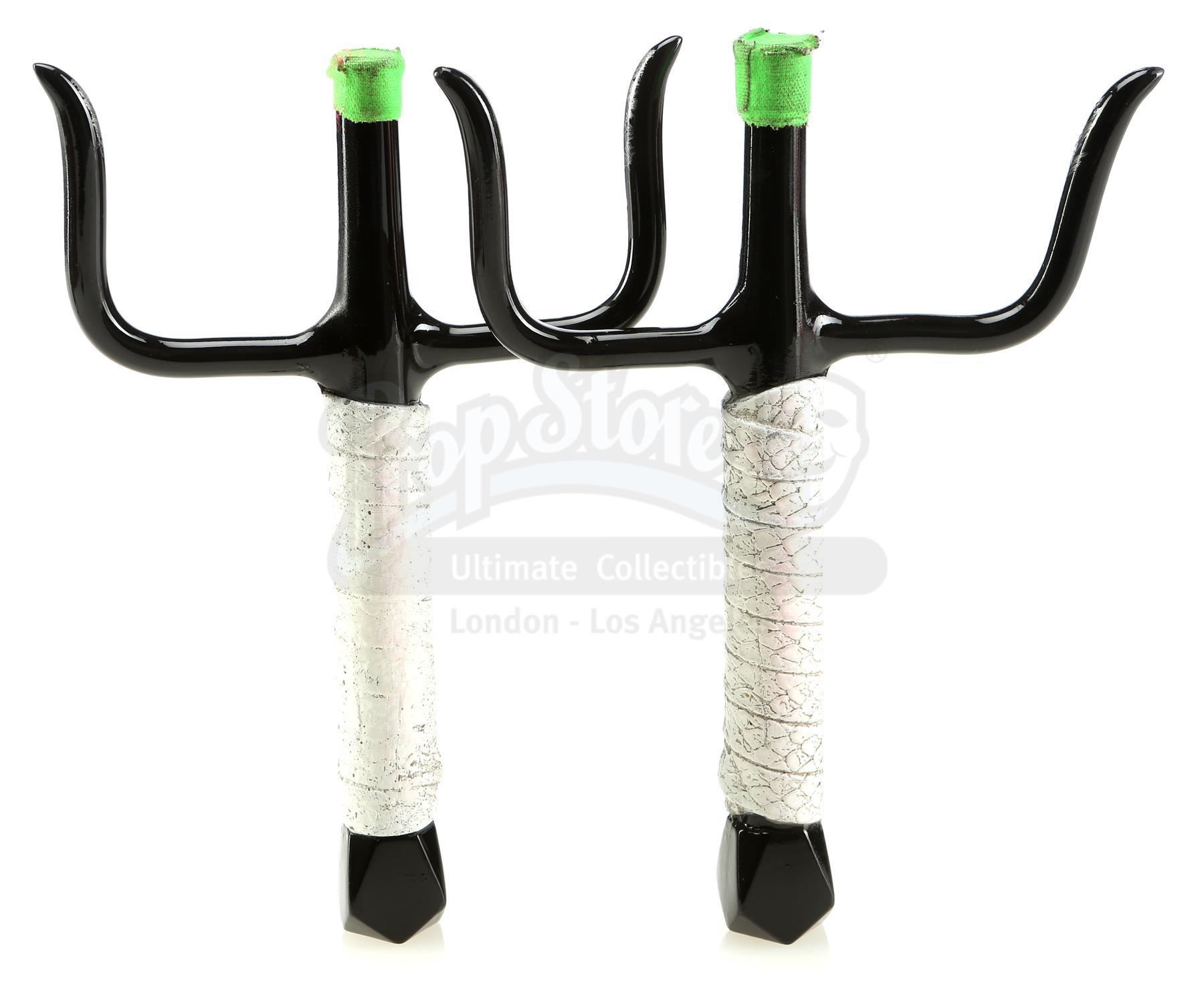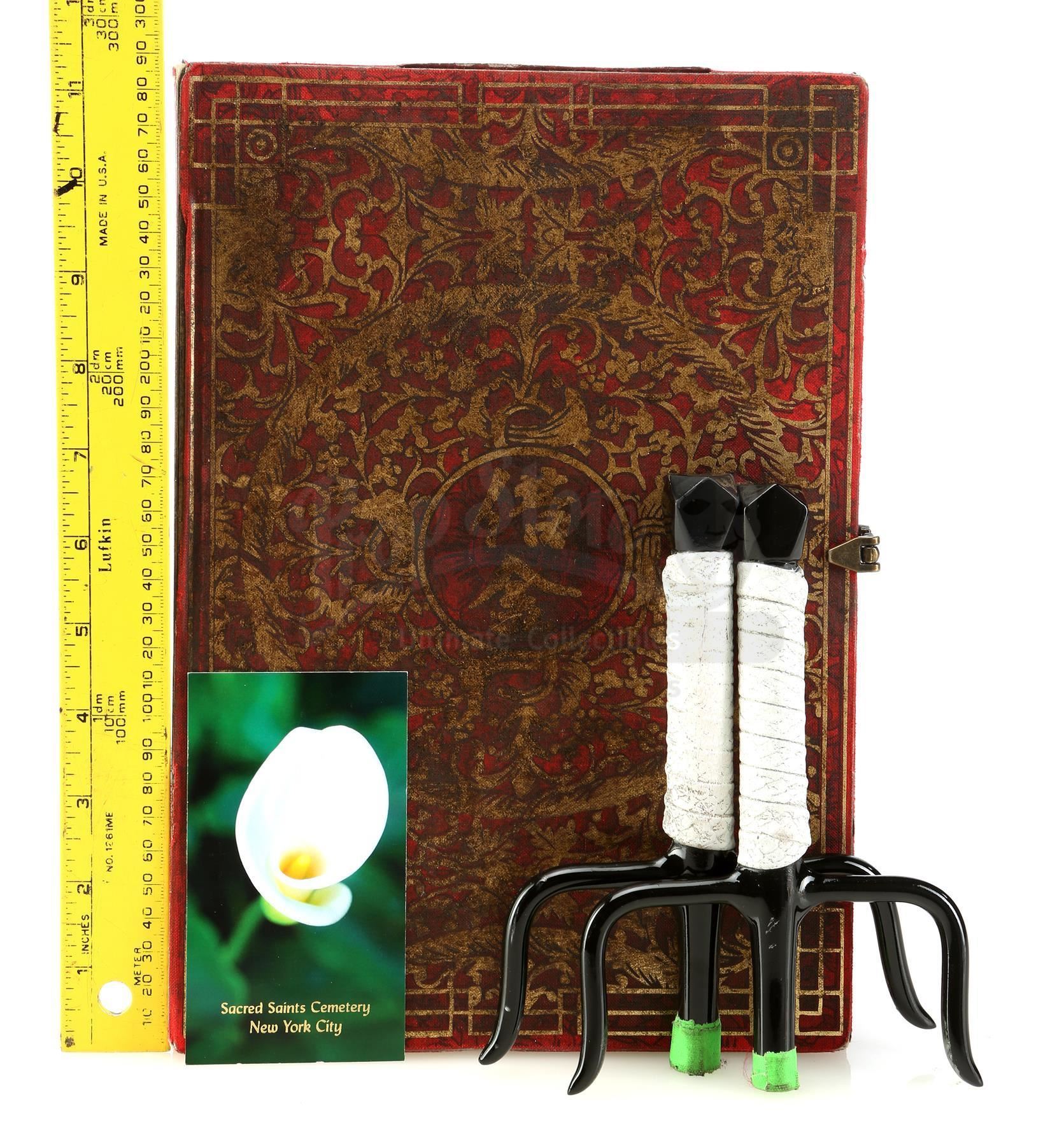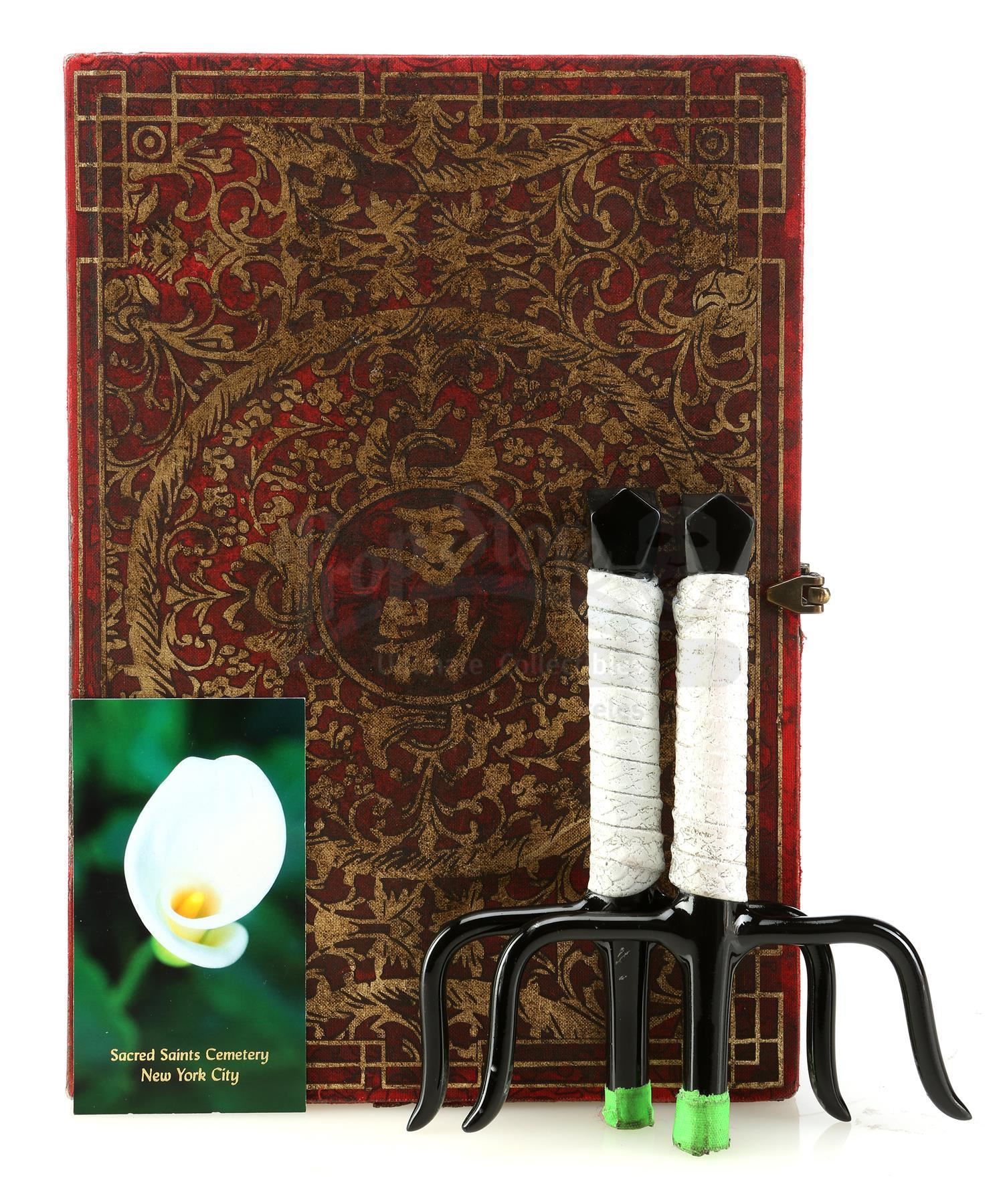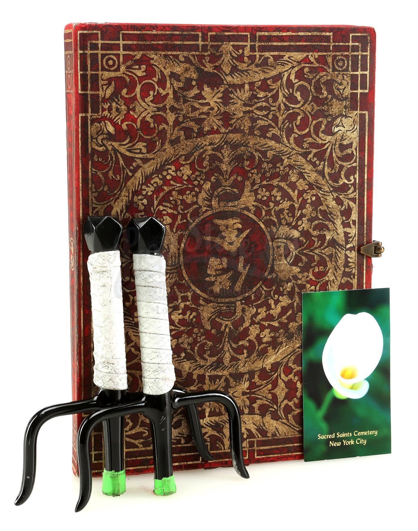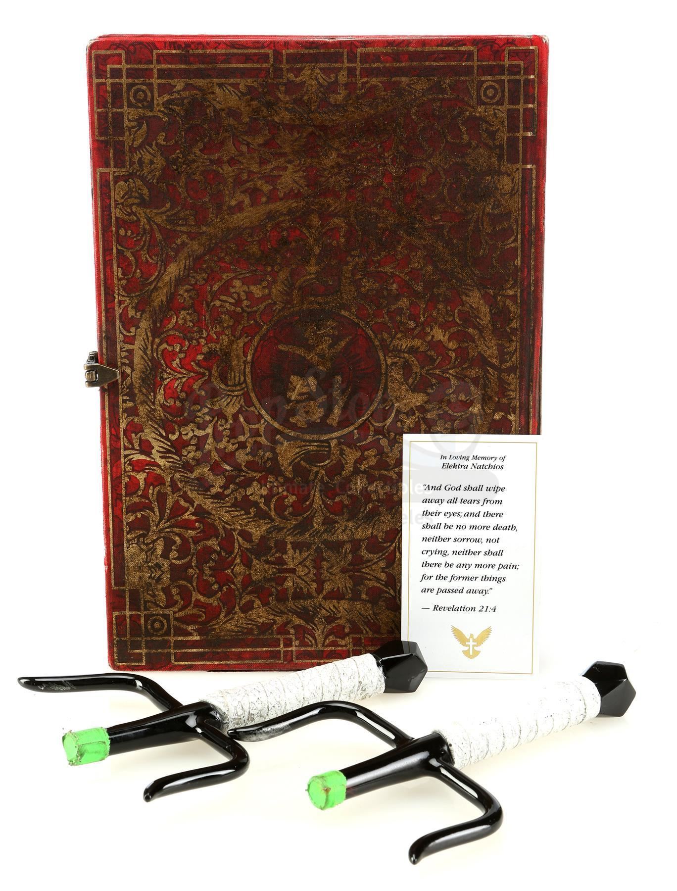 Elektra Natchios' VFX sais, Roxxon logbook, and funeral program from Season 2 of Marvel's Daredevil. Trained assassin Natchios wields her signature sais throughout the season as she works with Matt Murdock to infiltrate Roxxon Oil and defeat the Yakuza before her untimely death. This lot consists of a red and yellow leatherette-bound logbook with 114 pages of notes, a glossy green, white, and yellow printed paper funeral program, and a pair of black steel sais with white leather hilts and green VFX tape applied over the blades by production. The lot is in good overall condition with some wear from production throughout.