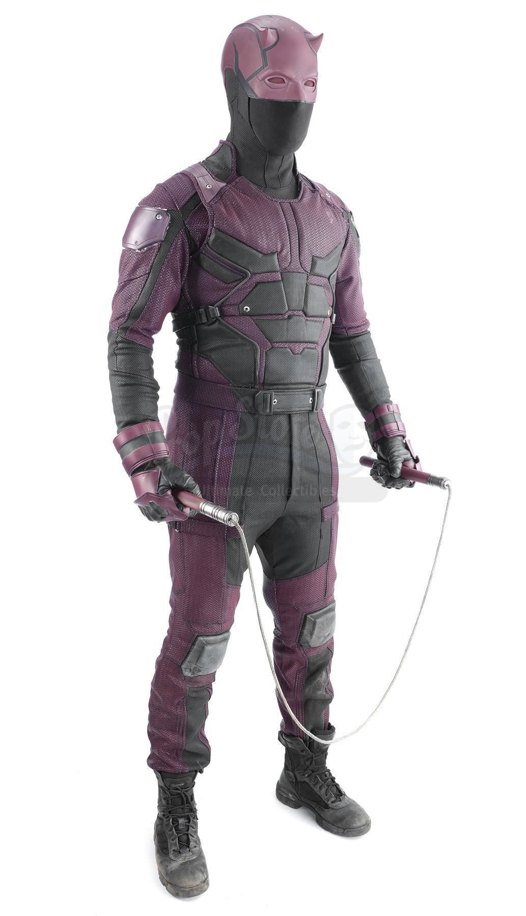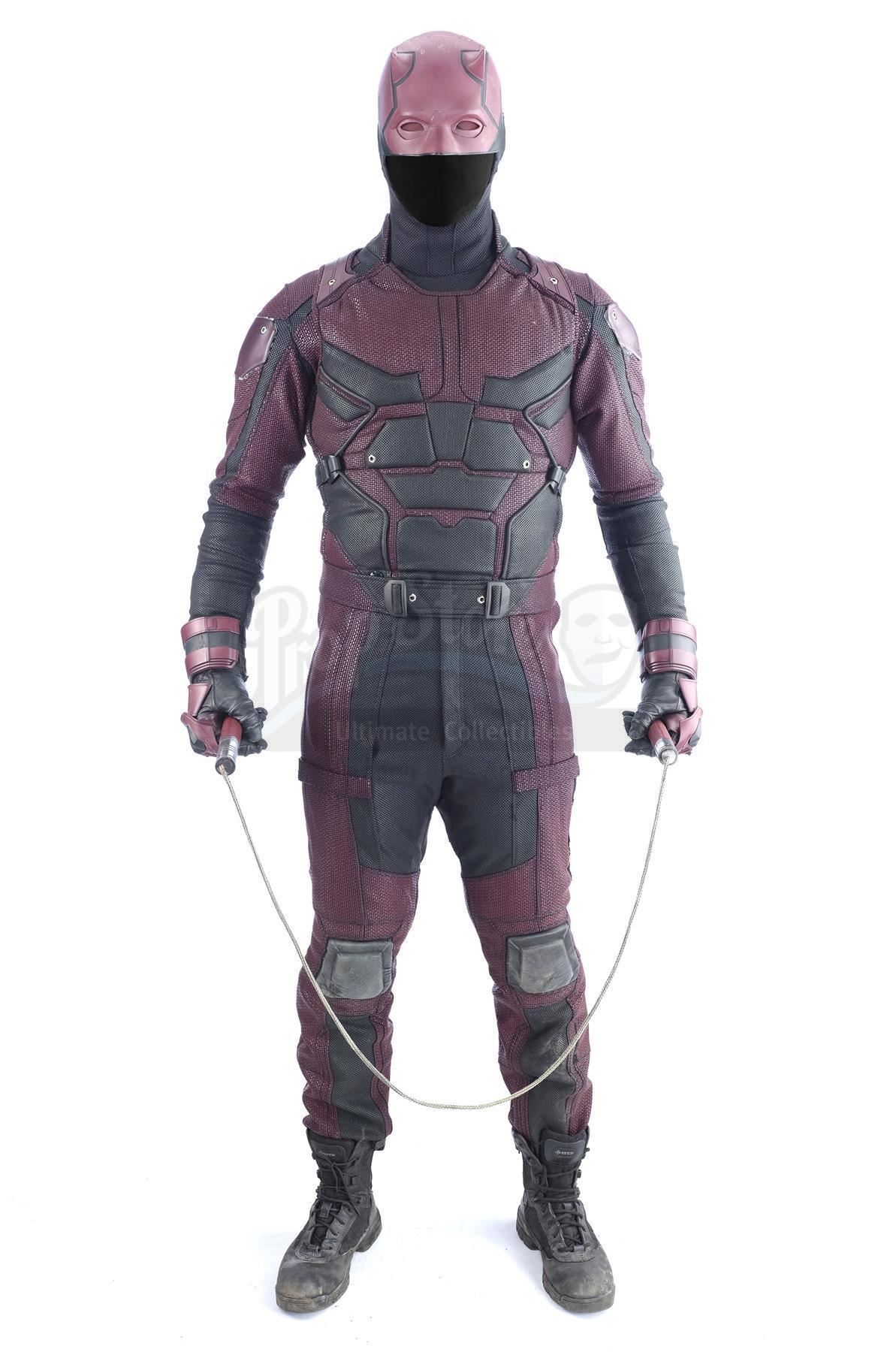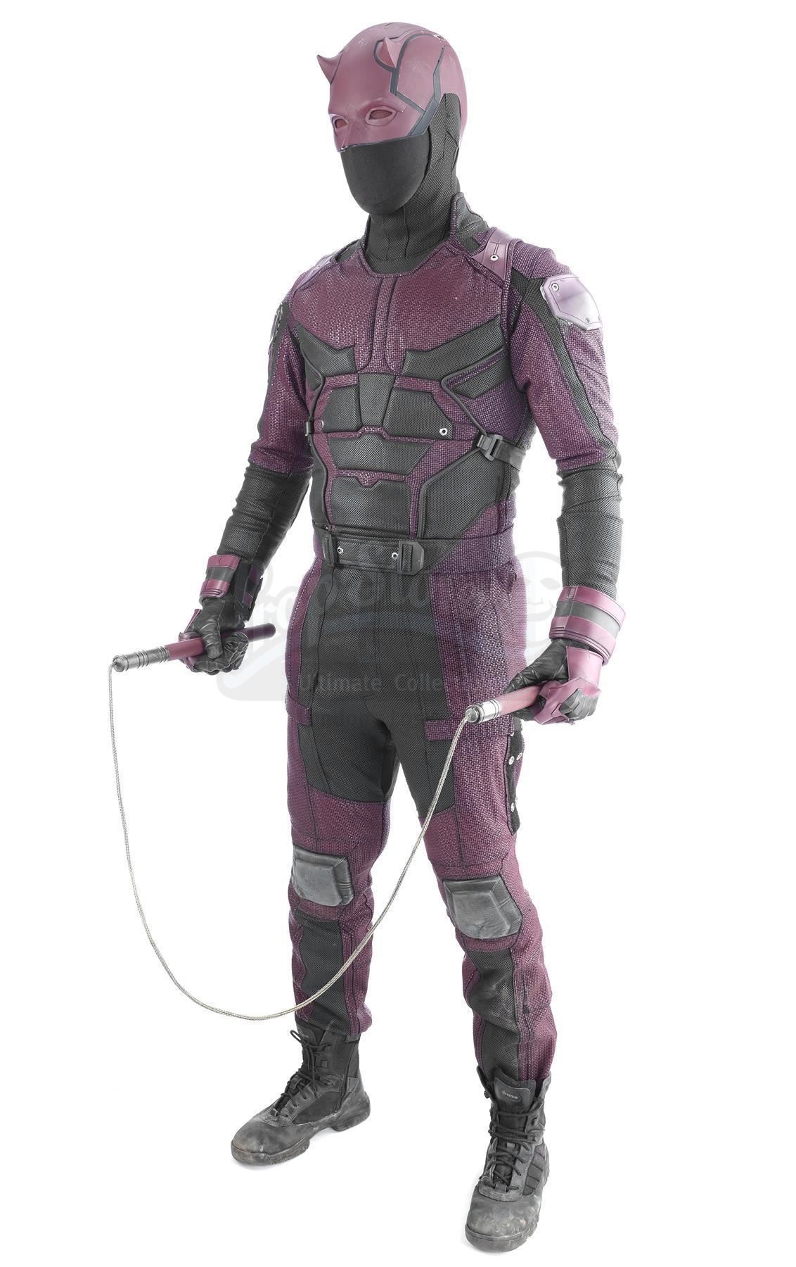 Matt Murdock's stunt second iteration red Daredevil suit from Season 2 of Marvel's Daredevil and Season 1 of Marvel's The Defenders. Murdock dons his signature red and black costume and horned cowl as the blind vigilante hero Daredevil throughout both seasons. This lot consists of a crimson flexible urethane cowl with black details and mesh eye holes marked 'Charlie', a matching spandex and polyester blend stunt compression suit, a matching polyester and nylon stunt vest with harness holes on the reverse, a detachable black spandex hood, a black spandex blend stunt zip-up muscle shirt, a pair of segmented rubber and leather stunt gloves with fastening strip closures, a pair of black leather lace-up stunt boots, and a pair of crimson and gunmetal gray foam rubber and metal billy clubs with ridged sides and a rope connecting the clubs end-to-end. This lot is in good overall condition with visible signs of wear from production throughout.