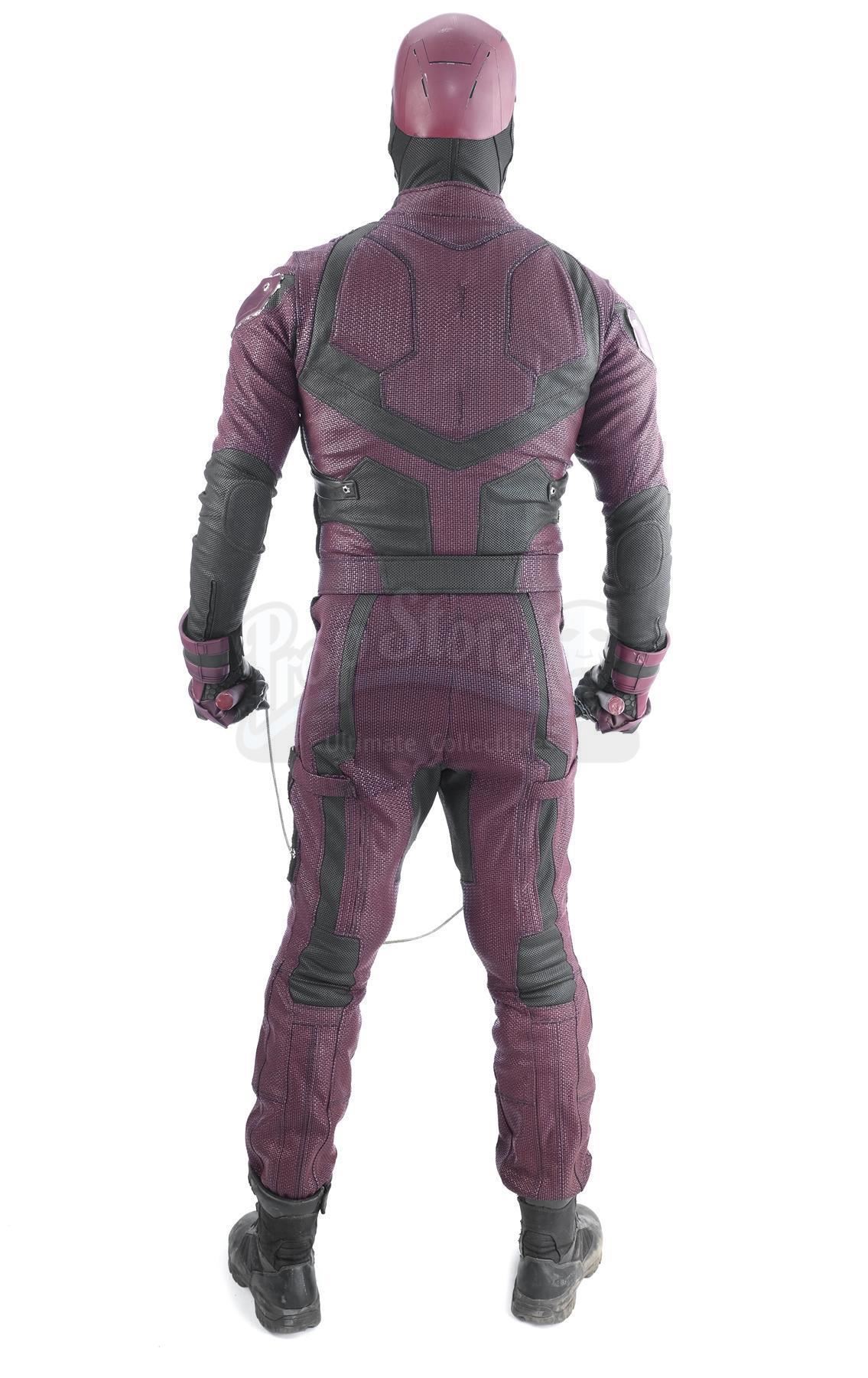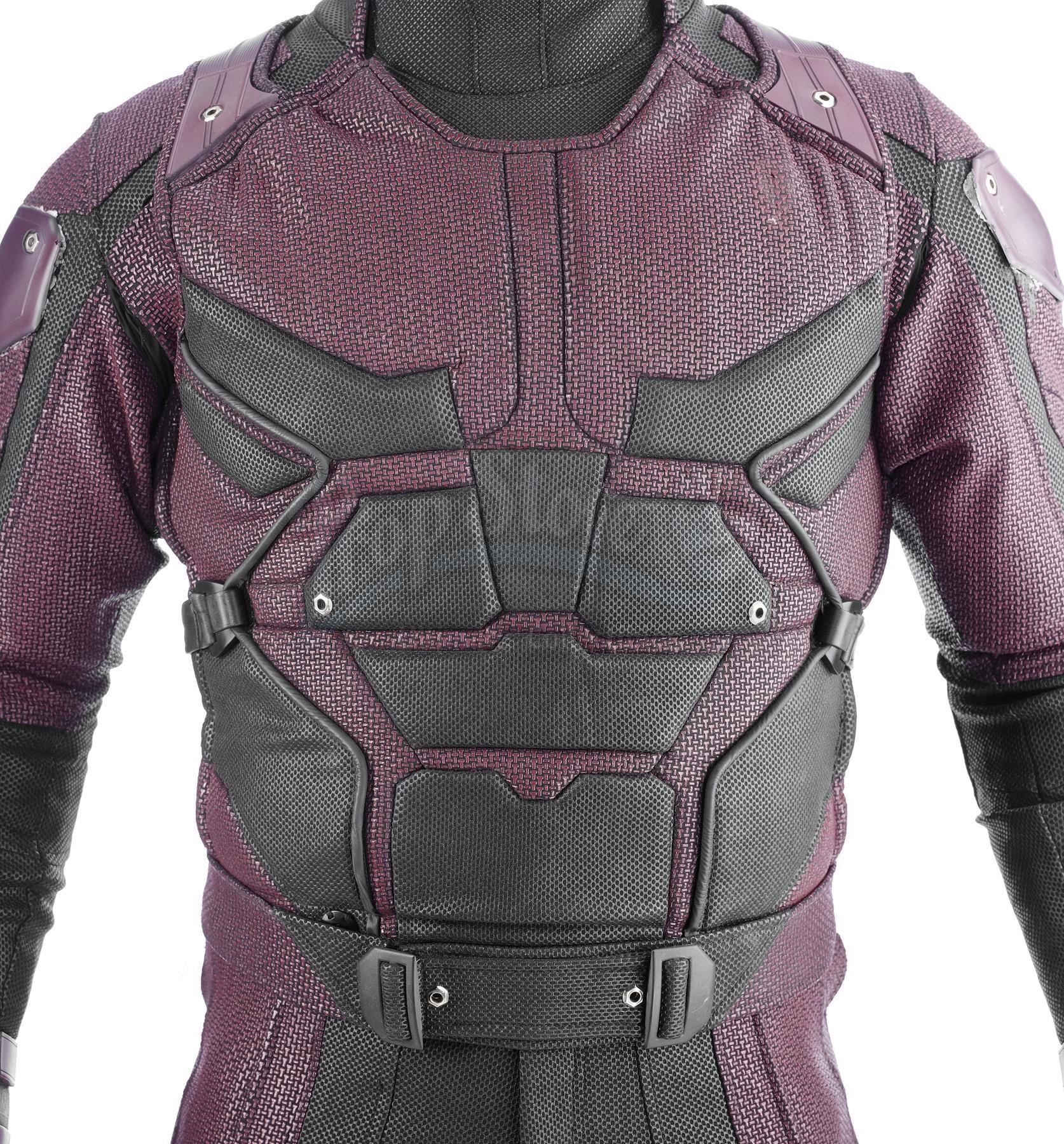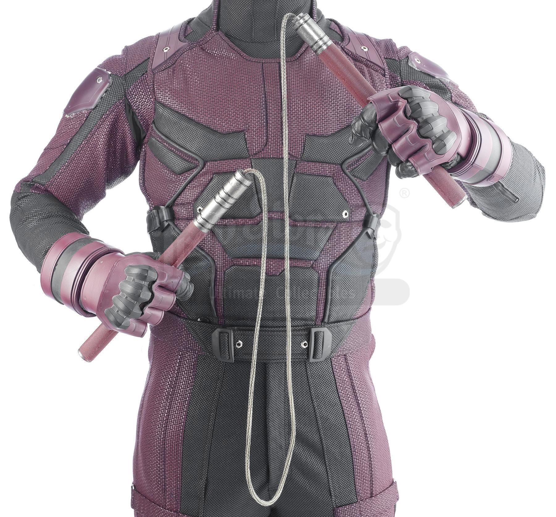 Matt Murdock's stunt second iteration red Daredevil suit from Season 2 of Marvel's Daredevil and Season 1 of Marvel's The Defenders. Murdock dons his signature red and black costume and horned cowl as the blind vigilante hero Daredevil throughout both seasons. This lot consists of a crimson flexible urethane cowl with black details and mesh eye holes marked 'Charlie', a matching spandex and polyester blend stunt compression suit, a matching polyester and nylon stunt vest with harness holes on the reverse, a detachable black spandex hood, a black spandex blend stunt zip-up muscle shirt, a pair of segmented rubber and leather stunt gloves with fastening strip closures, a pair of black leather lace-up stunt boots, and a pair of crimson and gunmetal gray foam rubber and metal billy clubs with ridged sides and a rope connecting the clubs end-to-end. This lot is in good overall condition with visible signs of wear from production throughout.