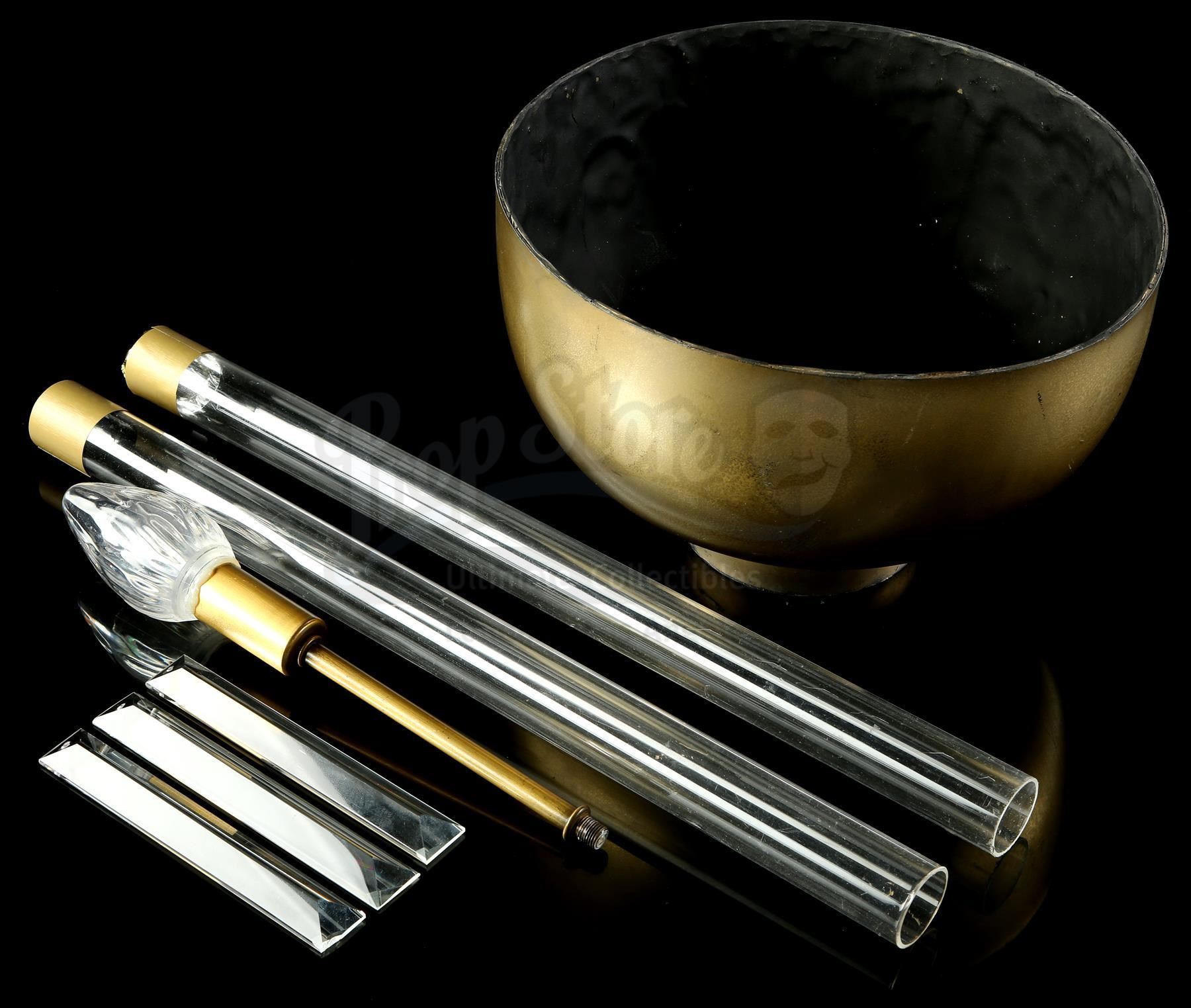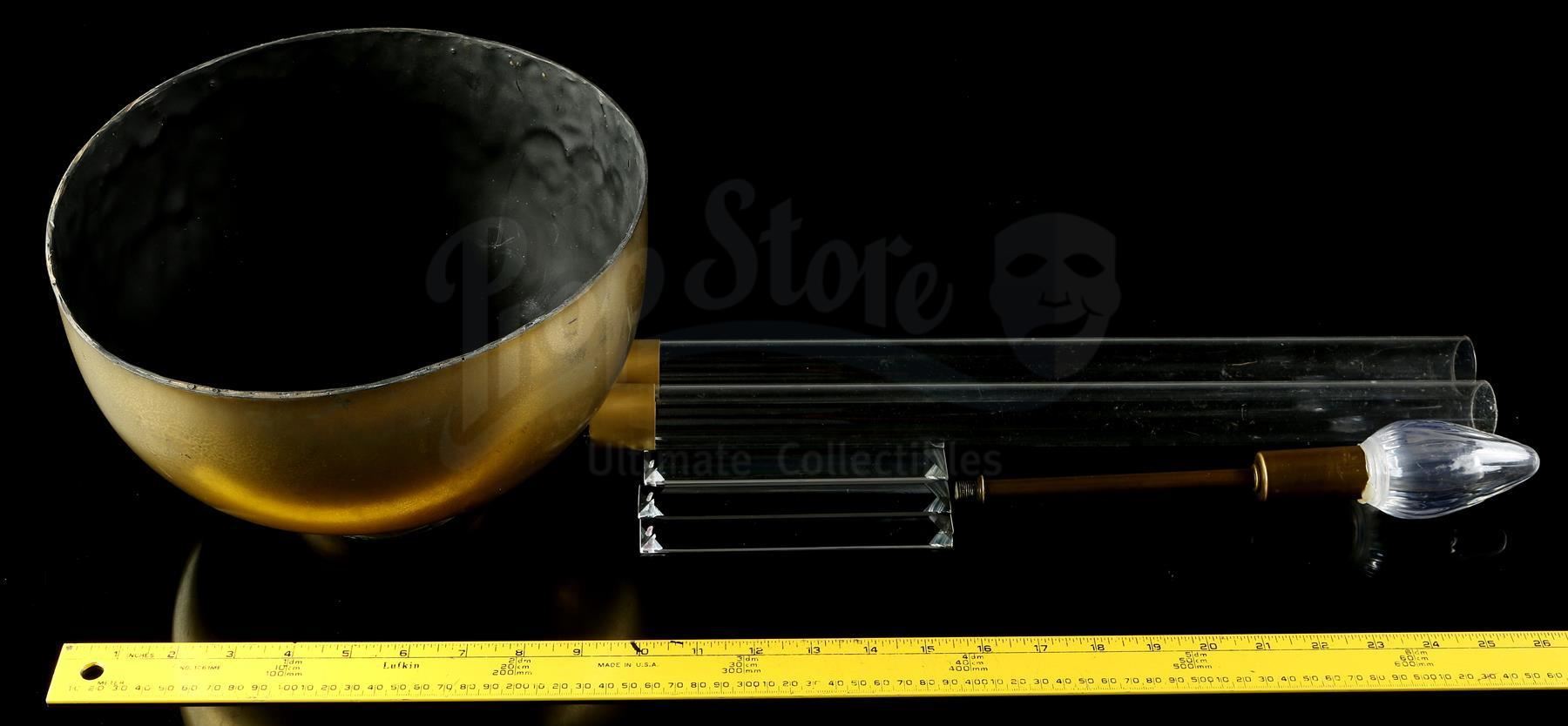 A set of Matt Murdock and Benjamin 'Dex' Poindexter's chandelier weapons and accessories from the episodes 'Upstairs/Downstairs' (308) and 'A New Napkin' (313) of Marvel's Daredevil. In the episodes, Poindexter throws chandelier pieces at Murdock and Agent Rahul 'Ray' Nadeem. Later, Murdock uses similar pieces to deflect more of Poindexter's projectiles. This lot consists of two clear urethane poles with gold tape-wrapped tips, three glass crystals with a small hole on each for chandelier mounting, a chandelier light piece consisting of a brass-color stem with a twisted candle-shaped bulb, and a brass-color foam rubber stunt bowl. The lot is in good overall condition with some signs of wear from production, including warping to the bowl.