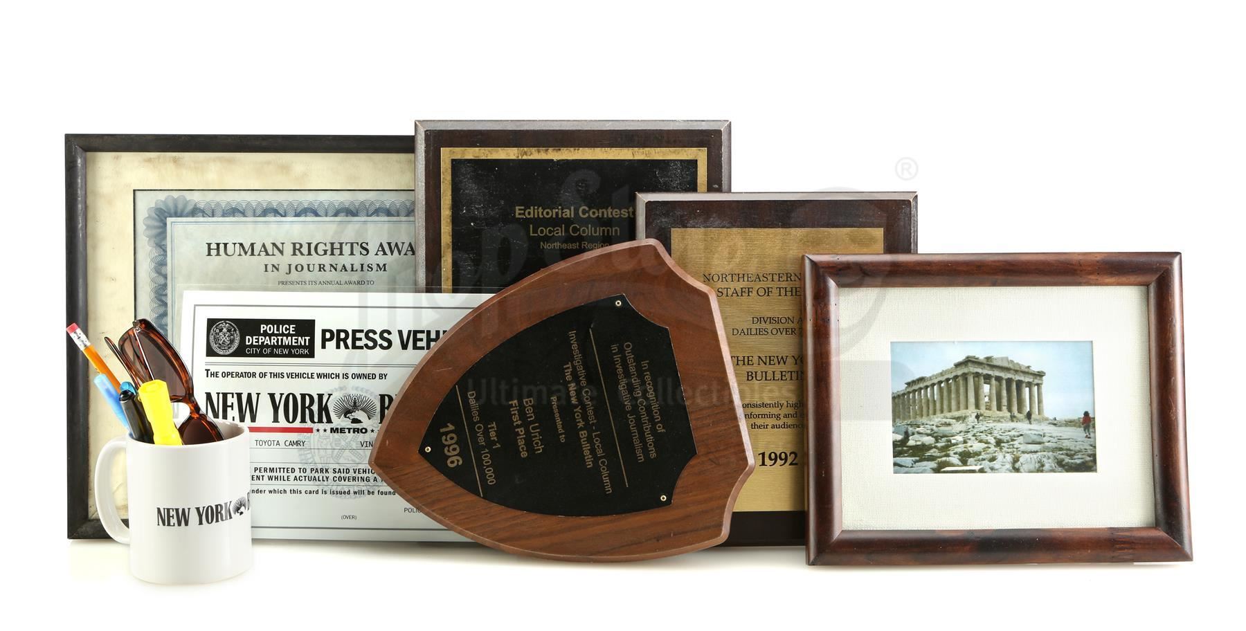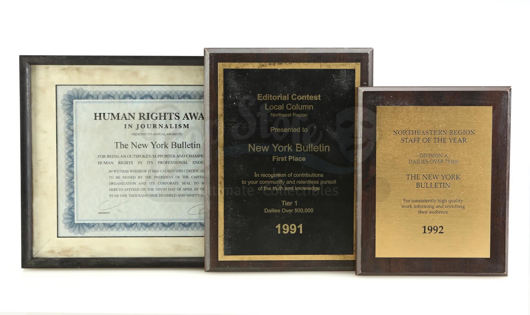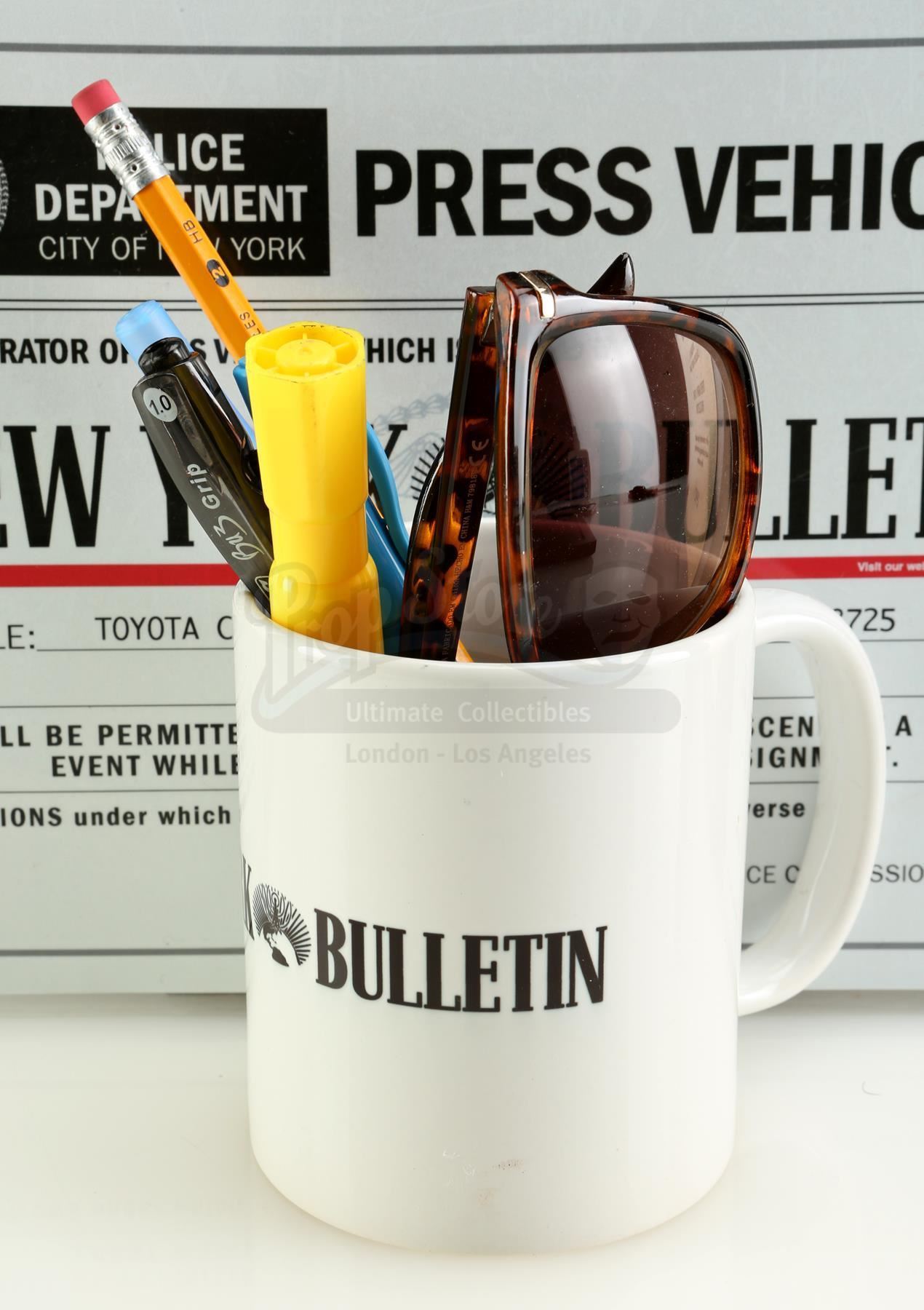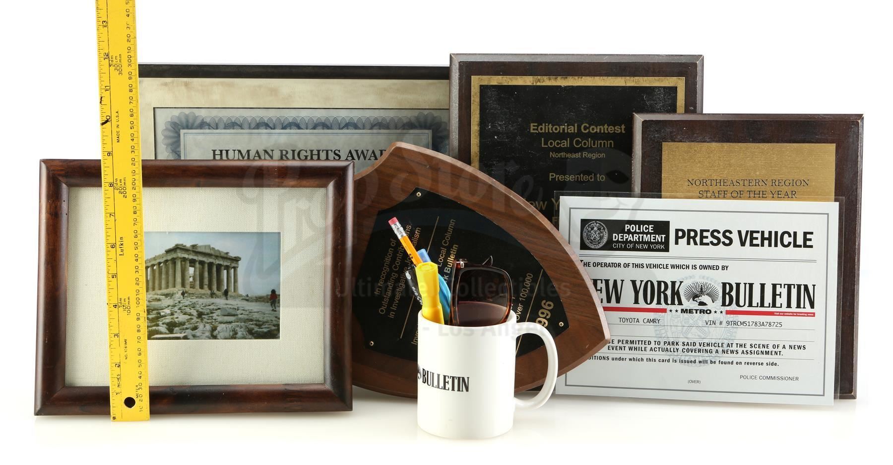 A set of New York Bulletin items from Seasons 1 through 3 of Marvel's Daredevil. Ben Urich, Mitchell Ellison, and Karen Page work to bring the truth to the people of New York from their offices at the Bulletin throughout the series. This lot of branded New York Bulletin items consists of a coffee mug containing a pencil, highlighter, pens, and a pair of sunglasses, as well as a laminated press vehicle pass, three wood-backed award plaques, including one for Urich, a framed Human Rights Award, and a framed photo of the Parthenon. The lot is in excellent overall condition with minimal wear from production.