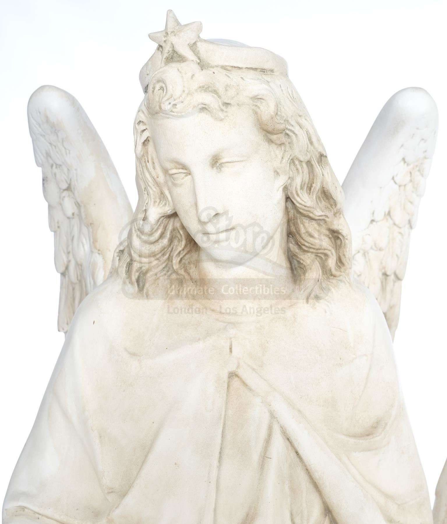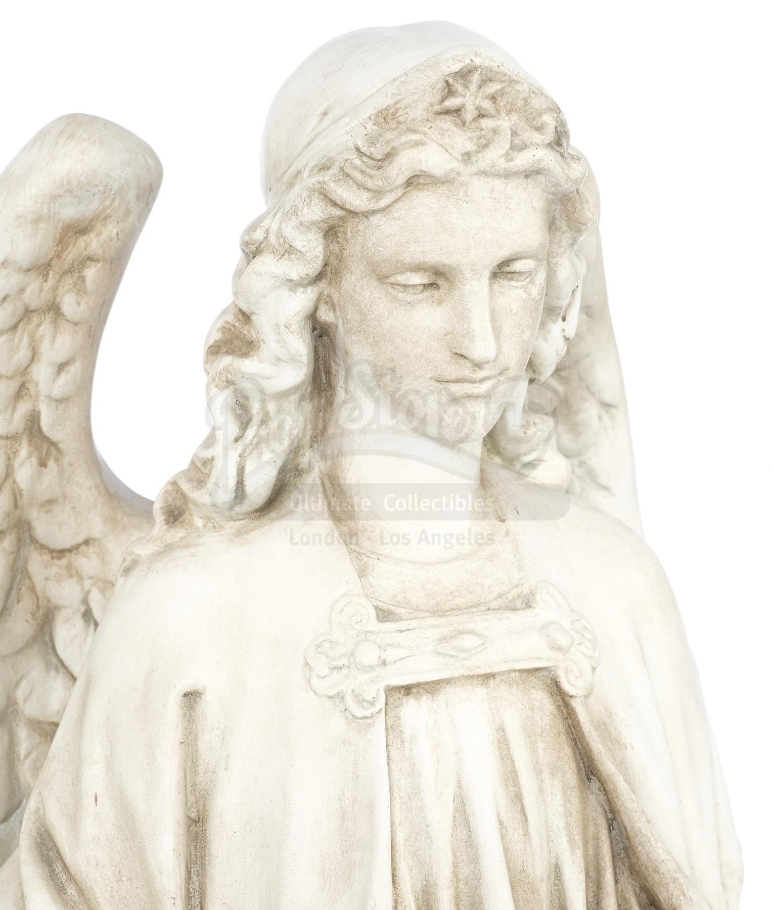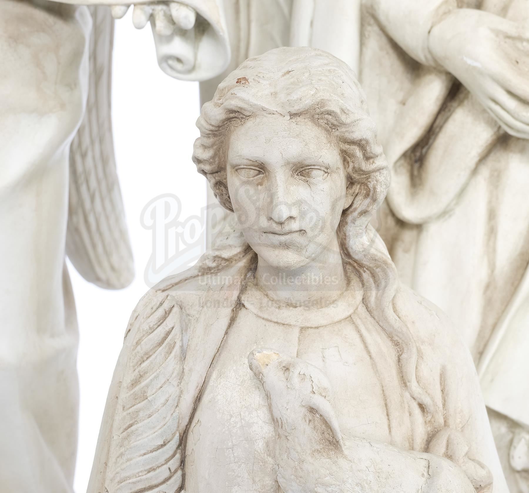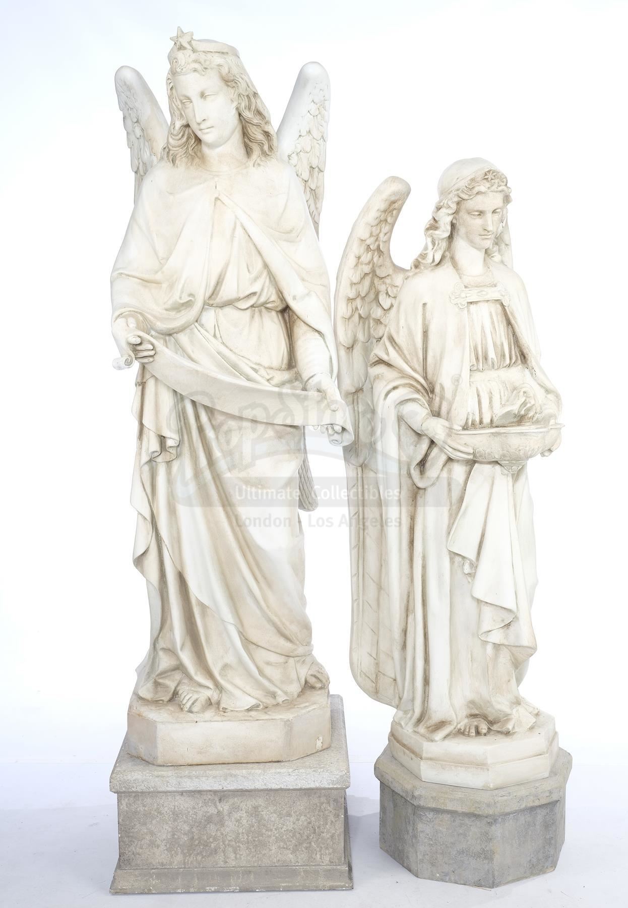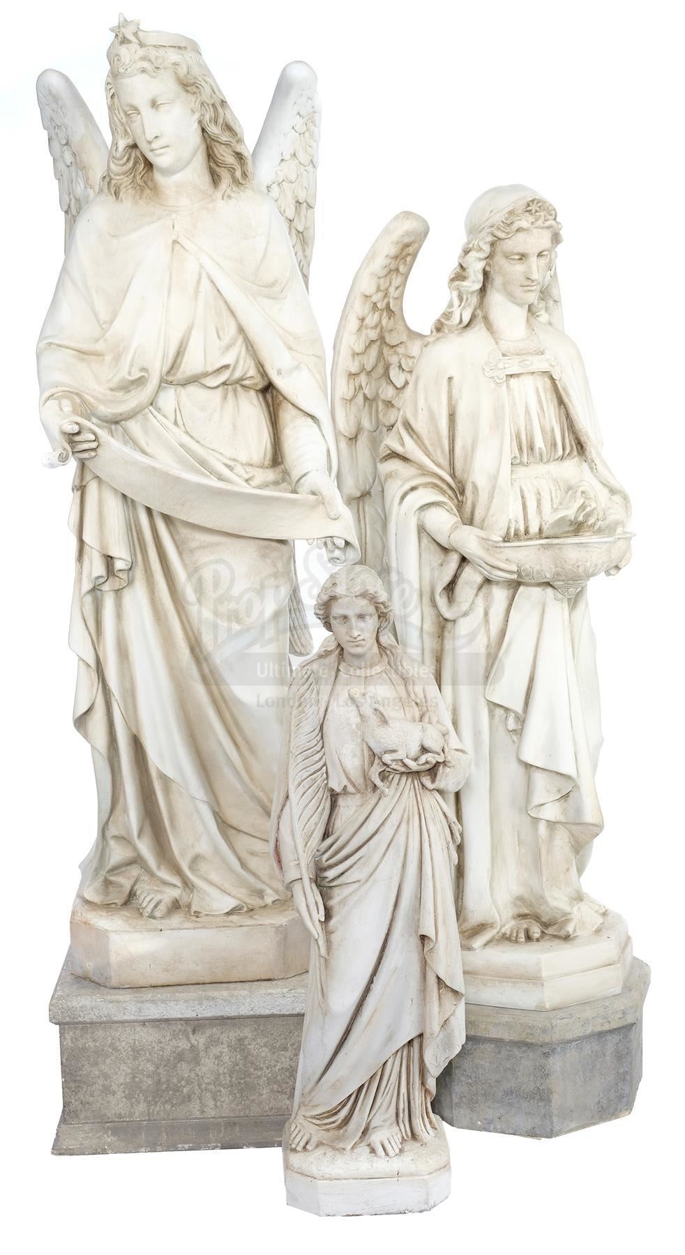 A set of three crypt statues from the episode 'Reunion' (311) of Marvel's Daredevil. In the episode, Matt Murdock and Karen Page hide from law enforcement in a church's basement crypt. These large gray resin statues, two of which feature angel's wings, are mounted to wooden bases. They are in good overall condition with signs of wear from production, including minor cracking to one of the bases. This is an oversize lot that requires special shipping.