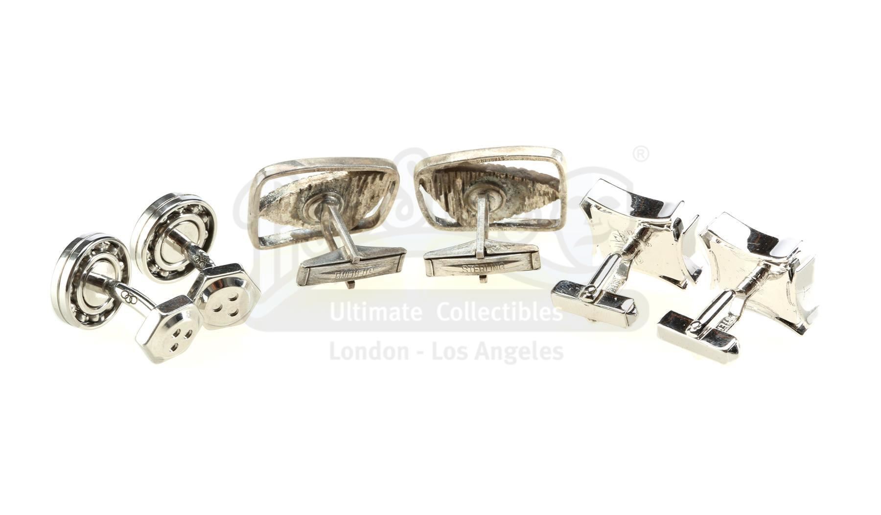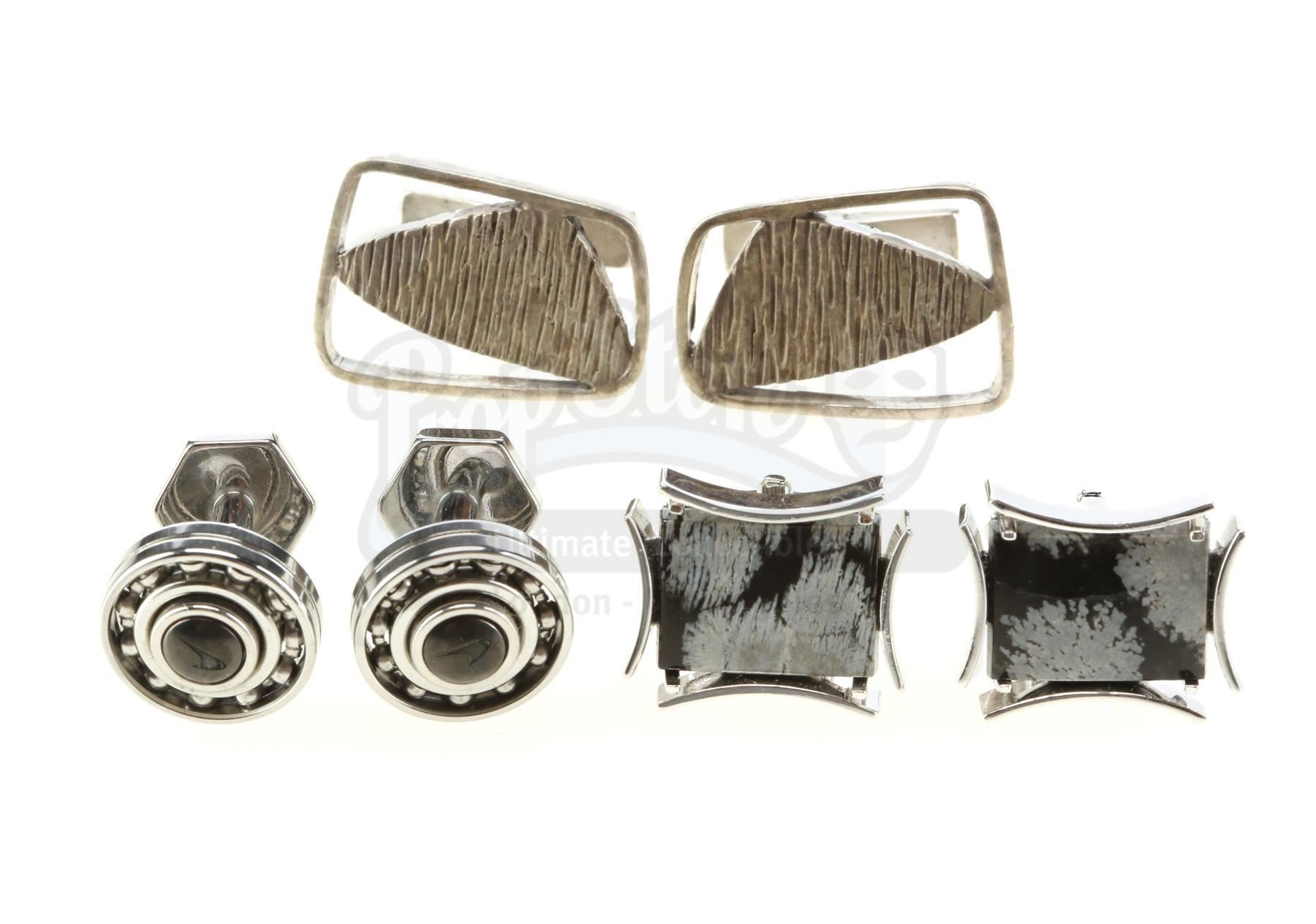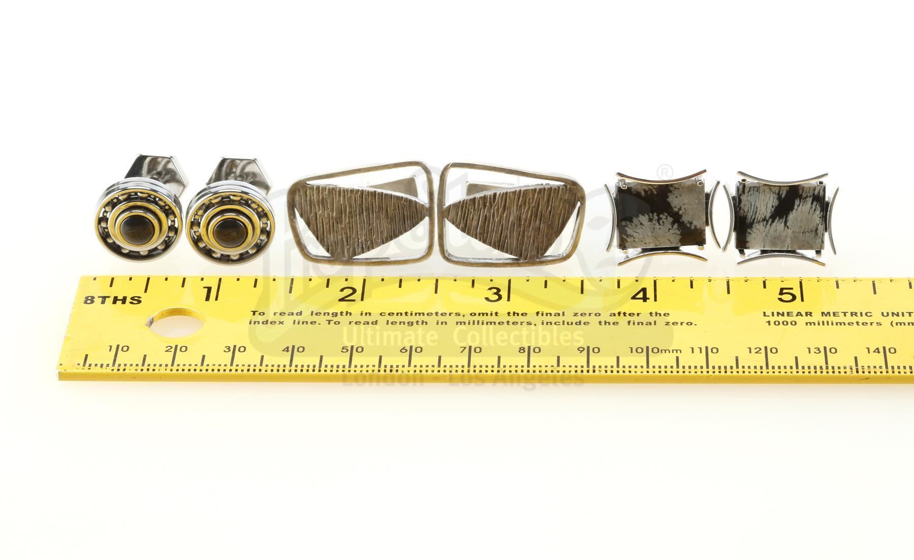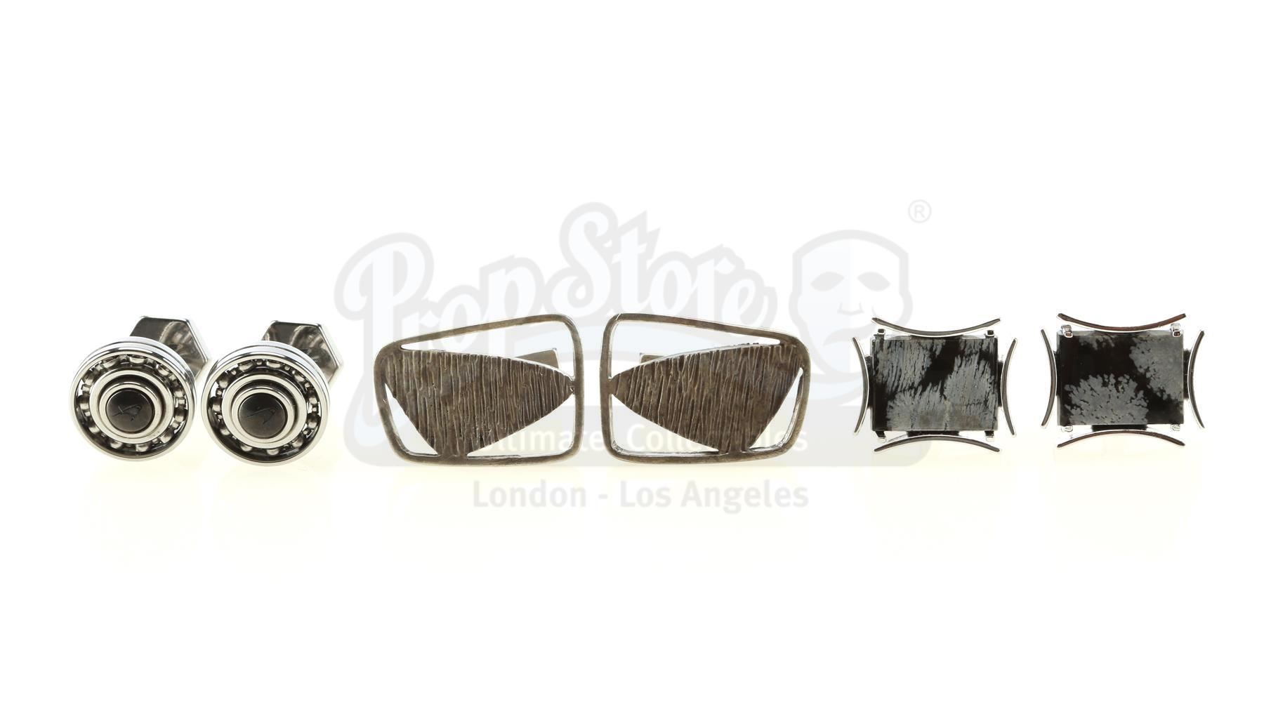 Three pairs of Wilson Fisk's cufflinks from the episode 'Shadows in the Glass' (108) of Marvel's Daredevil. In the episode, Fisk opens his cufflink cabinet to reveal a large collection of cufflinks before ultimately deciding on his father Bill's prized pair. This lot consists of a pair of unfinished silver-color metal Bill Fisk cufflinks and two additional metal pairs with distinct designs and unique faux gems inset. The lot is in excellent overall condition with minimal wear from production, and the Bill Fisk cufflinks are missing their onyx inserts.