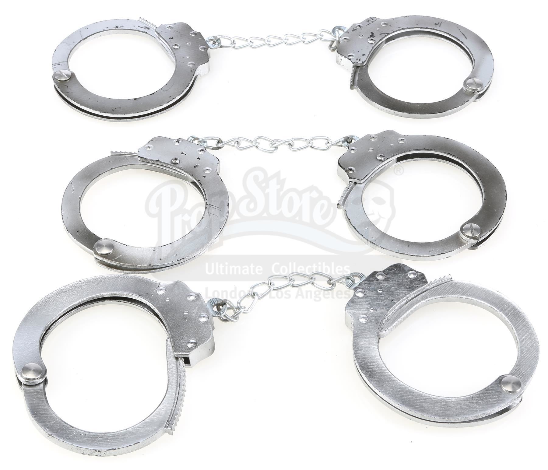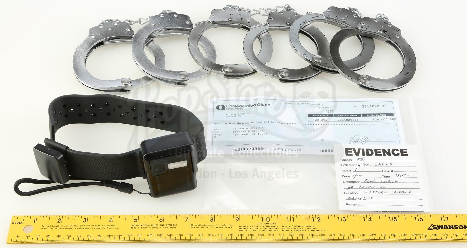 Wilson Fisk's handcuffs, ankle monitor, FBI files, and check from Season 3 of Marvel's Daredevil. In the episodes, Agent Rahul 'Ray' Nadeem brings the FBI's files on Fisk to a negotiation with the criminal kingpin, who is later transported from prison to his safehouse. Finally, Nadeem shows Karen Page a check to prove to her that she has also taken money from Fisk. This lot consists of a black metal and rubber electronic monitor with a spring-loaded locking mechanism and a rubber strap, three pairs of rubber and metal stunt handcuffs, and a paper check from Fisk's company Confederated Global to Nelson & Murdock in a plastic FBI evidence bag. The lot is in good overall condition with minor wear from production. This item contains electronic and mechanical components. While every effort is made to describe them accurately, no guarantee or warranty is made as to the functionality, lifespan or safety of those components. It is entirely incumbent on the new owner to satisfy themselves as to their safe use and maintenance.