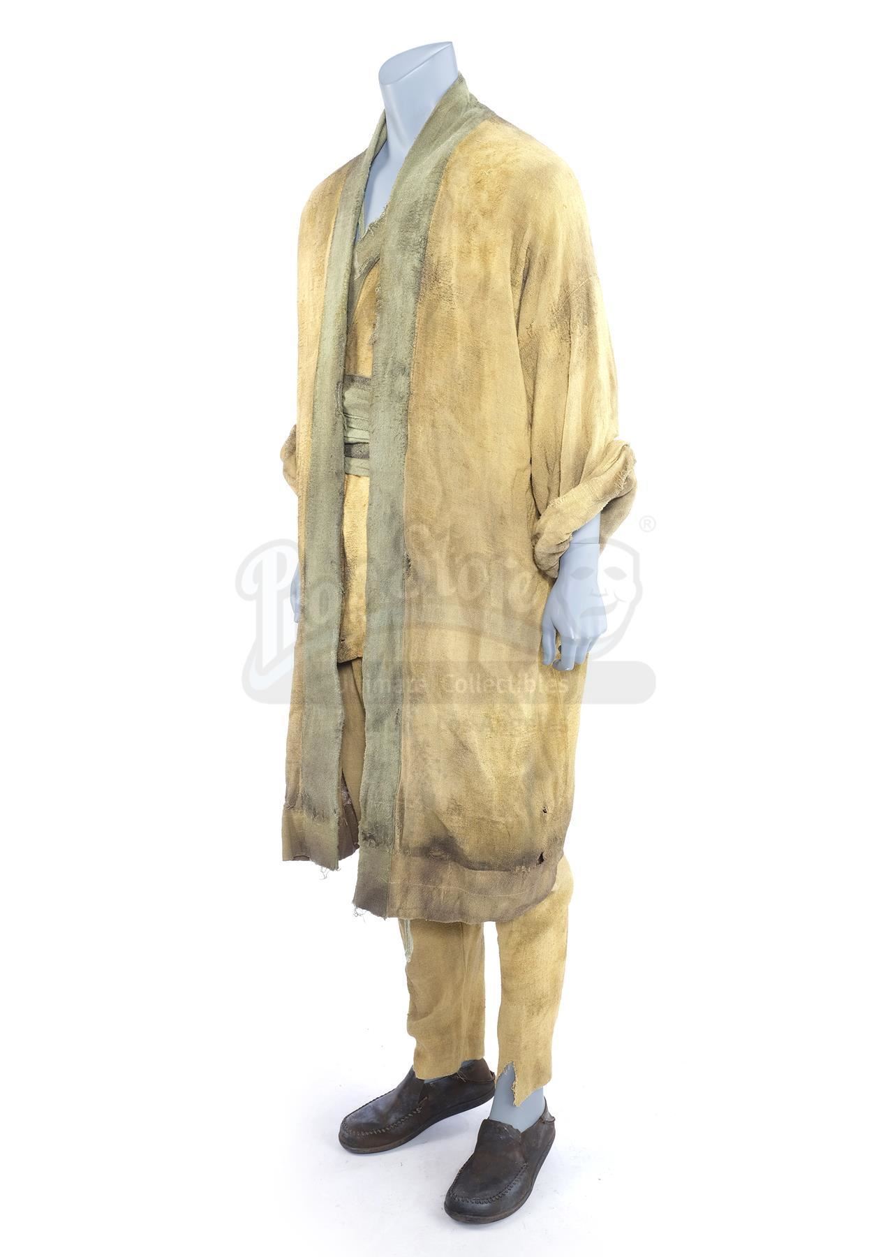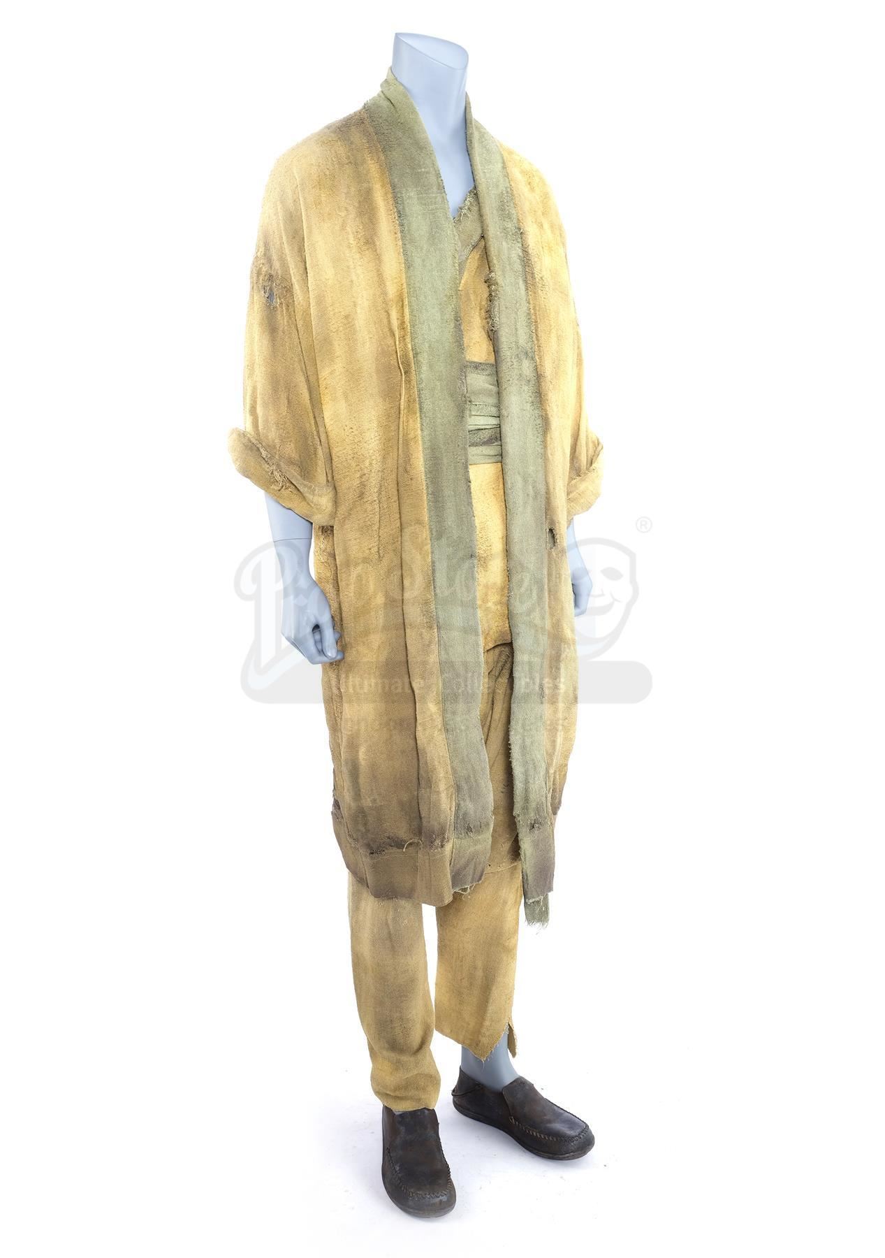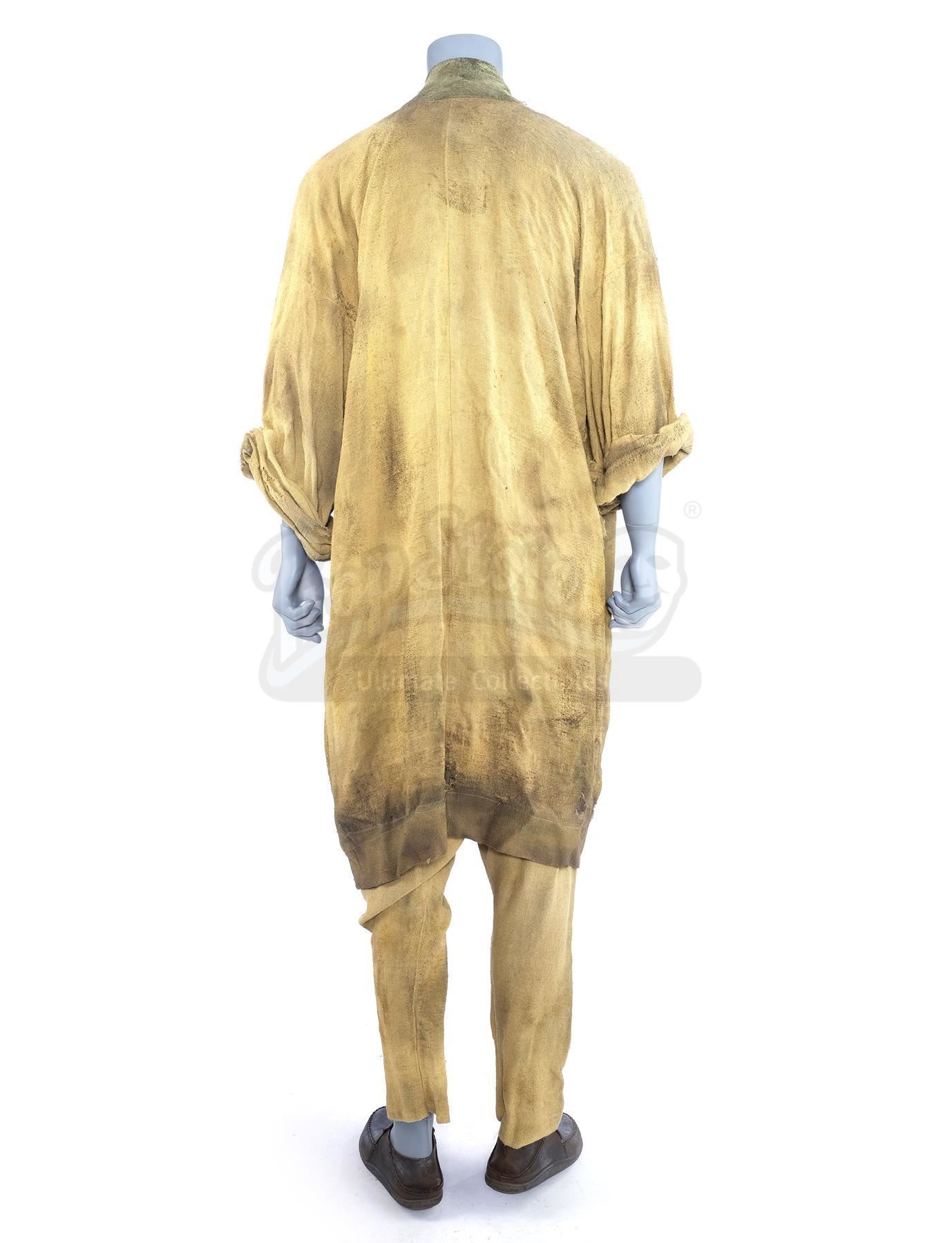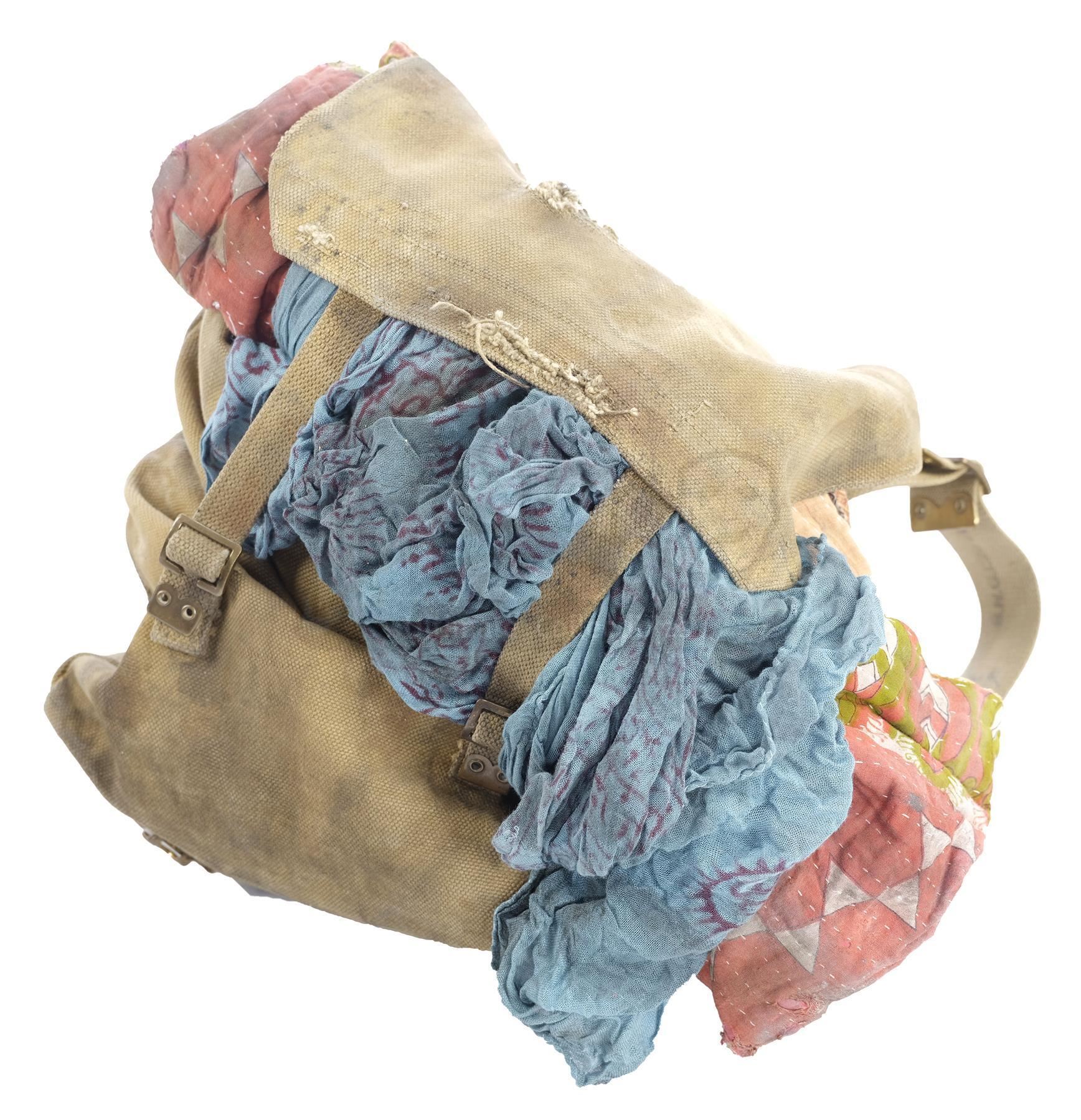 Davos' monk costume and Danny Rand's backpack from Seasons 1 and 2 of Marvel's Iron Fist. Rand carries a backpack when he first returns to New York City in Season 1, and Davos wears his monk costume throughout Season 2. This lot consists of a yellow and emerald green cotton blend outer robe and pants both marked 'DAVOS', a matching cotton shirt marked 'DAVOS', a matching belt, a pair of leather leg strips, a pair of brown slippers marked 'DAVOS', a pair of white cotton socks, and a beige polyester backpack containing a blanket, a scarf, rope, two smaller bags, and a towel. The lot is in good overall condition with the items intentionally distressed by production.