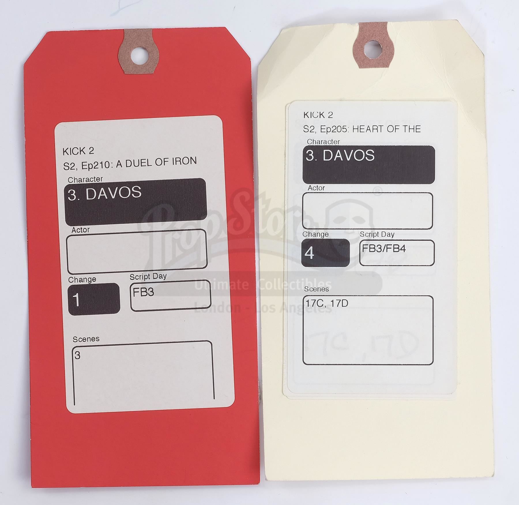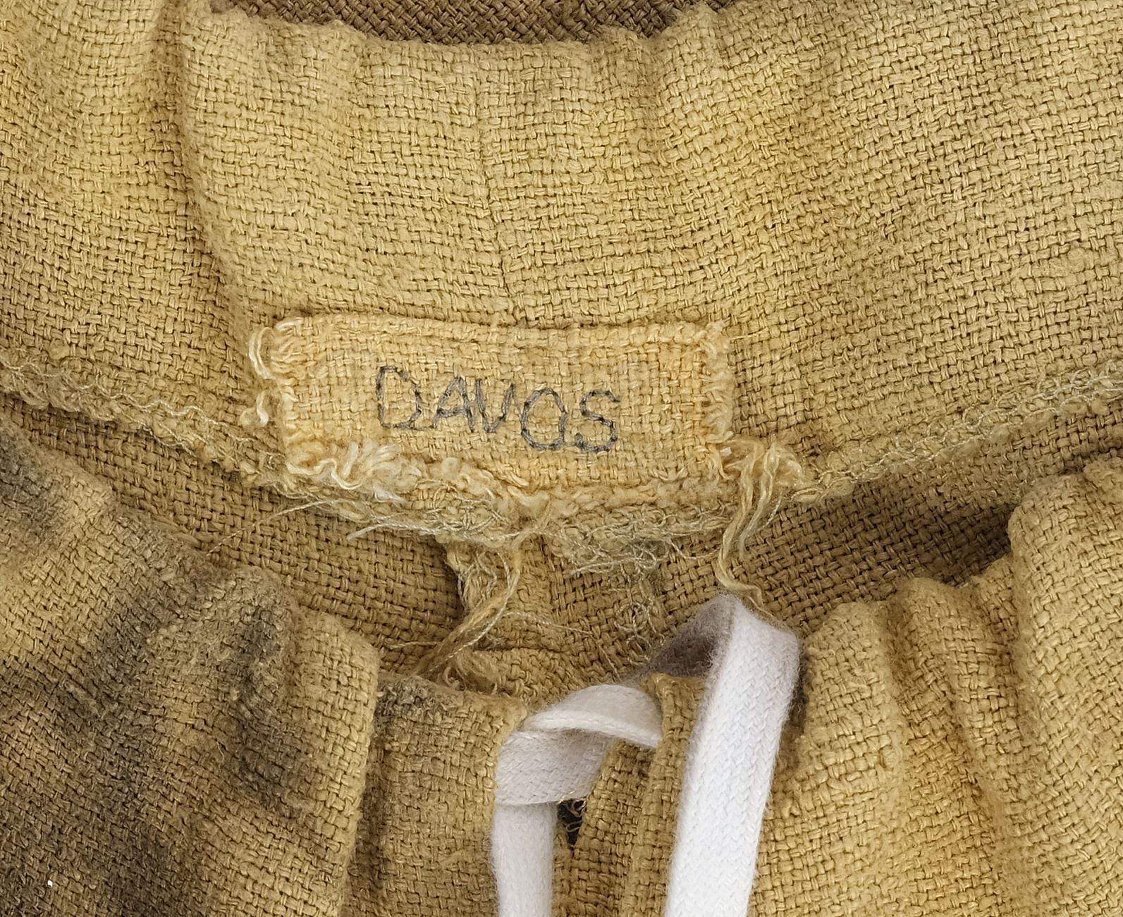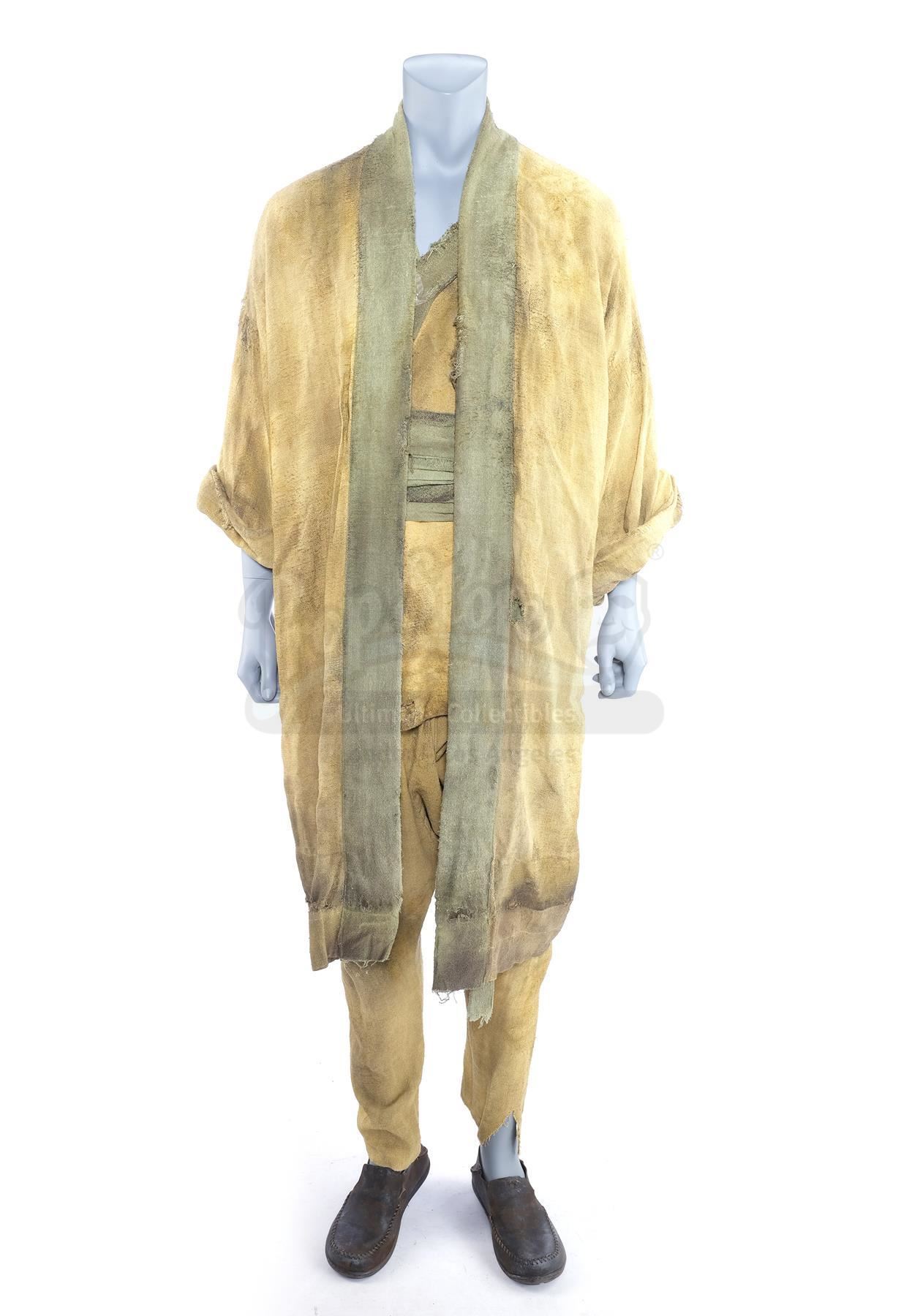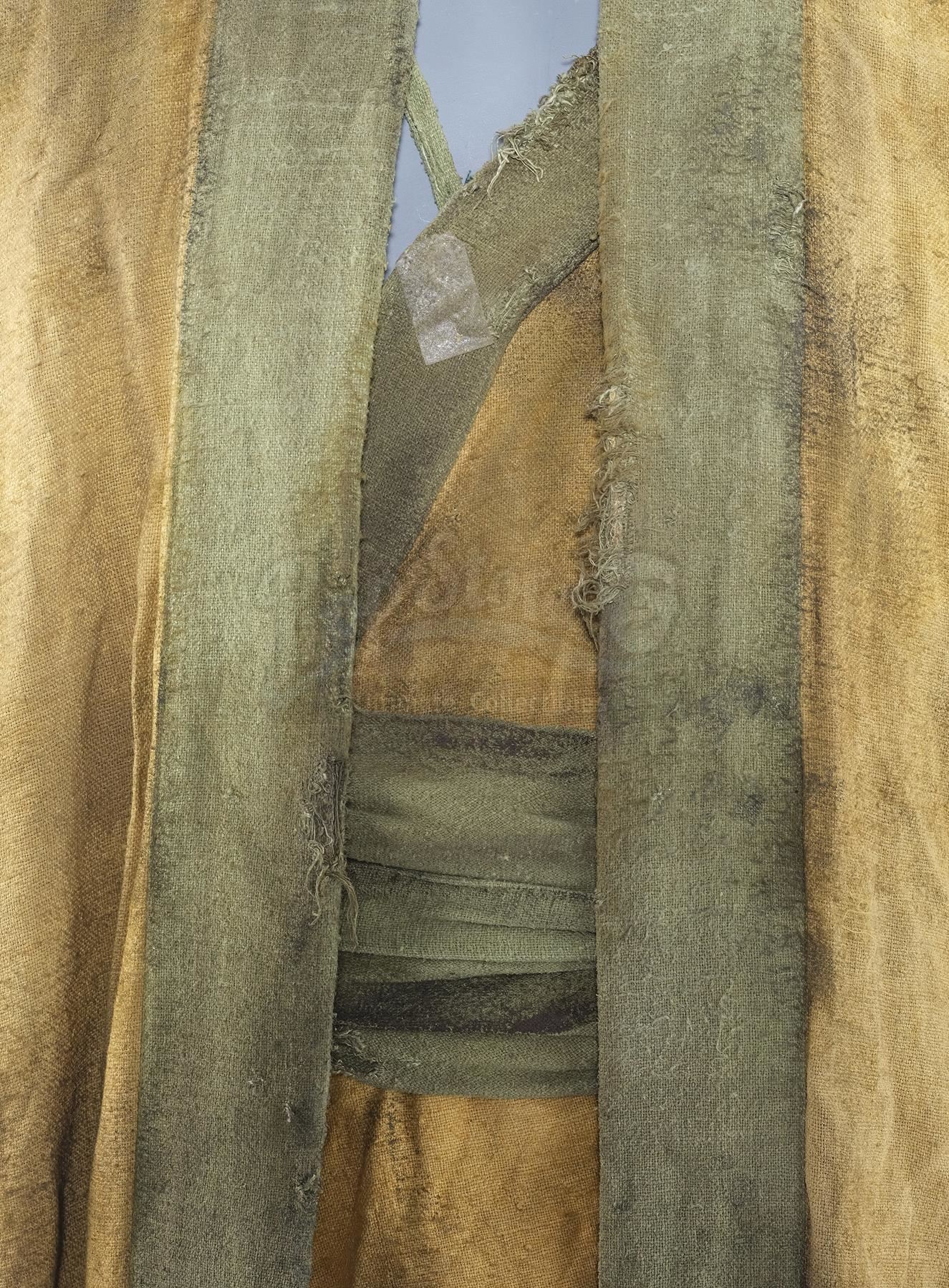 Davos' monk costume and Danny Rand's backpack from Seasons 1 and 2 of Marvel's Iron Fist. Rand carries a backpack when he first returns to New York City in Season 1, and Davos wears his monk costume throughout Season 2. This lot consists of a yellow and emerald green cotton blend outer robe and pants both marked 'DAVOS', a matching cotton shirt marked 'DAVOS', a matching belt, a pair of leather leg strips, a pair of brown slippers marked 'DAVOS', a pair of white cotton socks, and a beige polyester backpack containing a blanket, a scarf, rope, two smaller bags, and a towel. The lot is in good overall condition with the items intentionally distressed by production.