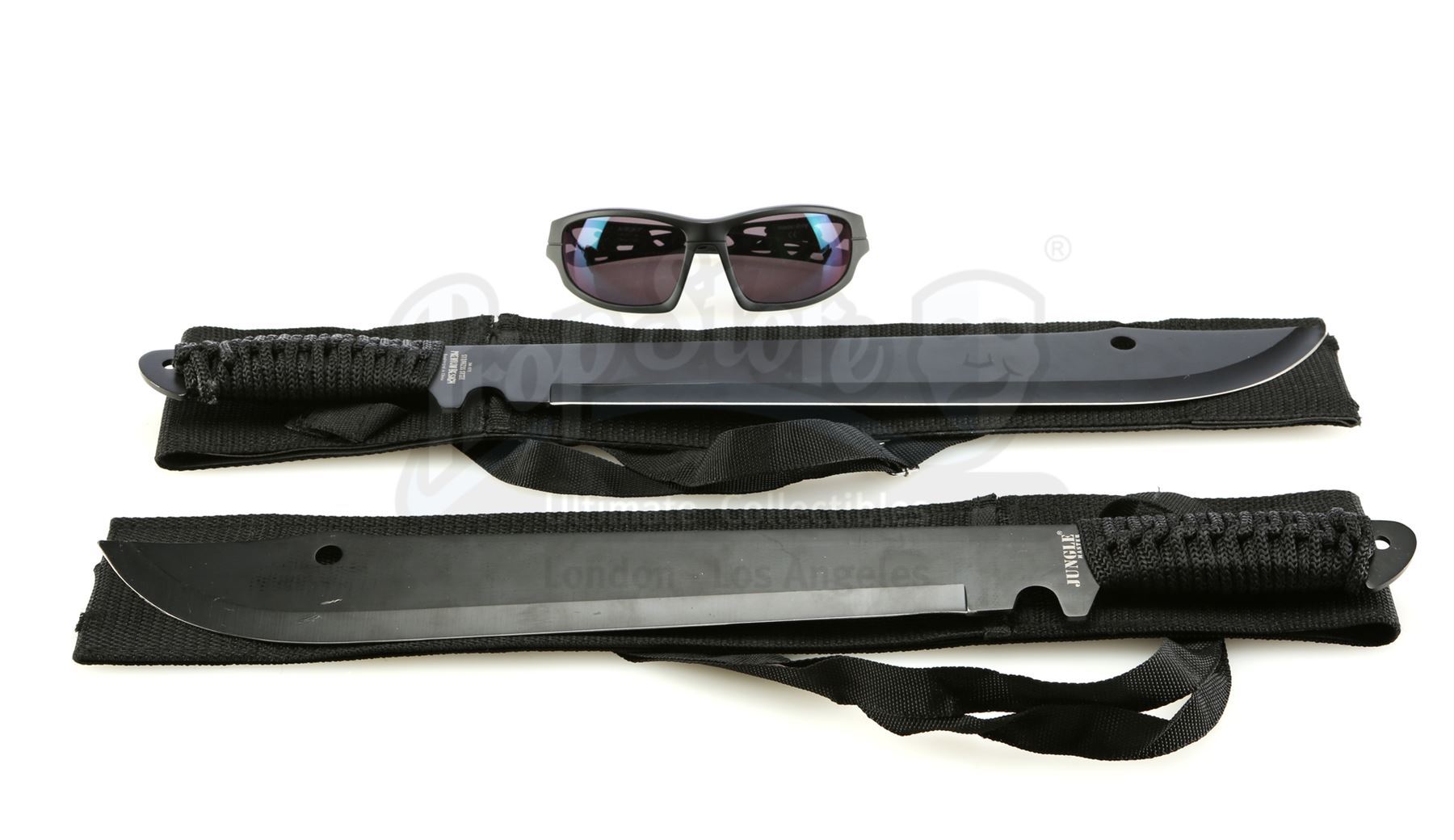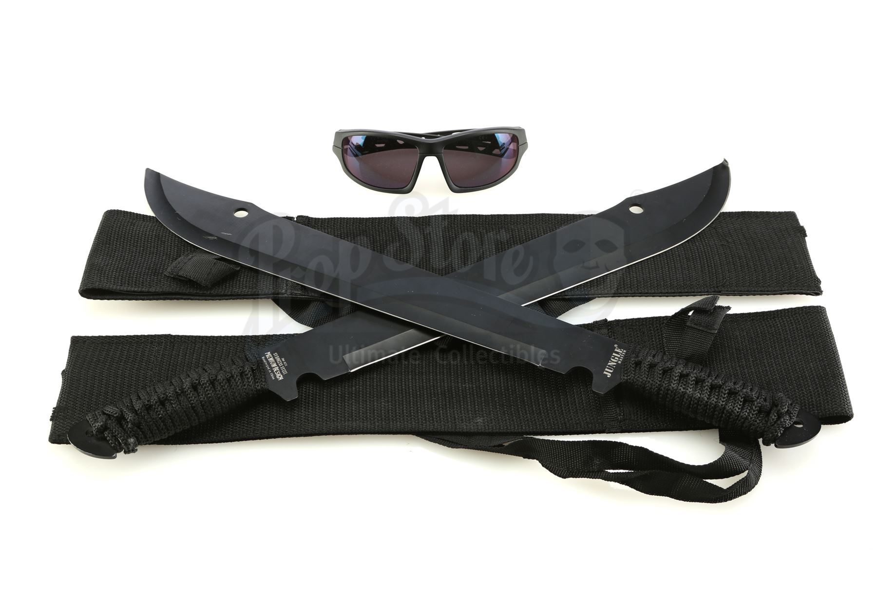 Mary Walker's dual machetes and sunglasses from Season 2 of Marvel's Iron Fist. Walker wields dual machetes throughout the season and wears sunglasses while purchasing weapons from Turk Barrett. This lot consists of a pair of dulled black metal machetes with rope handles and a pair of black nylon sheaths, as well as a pair of black sunglasses with a hard polymer case. The lot is in good overall condition with some marks on the blades and handles from production.