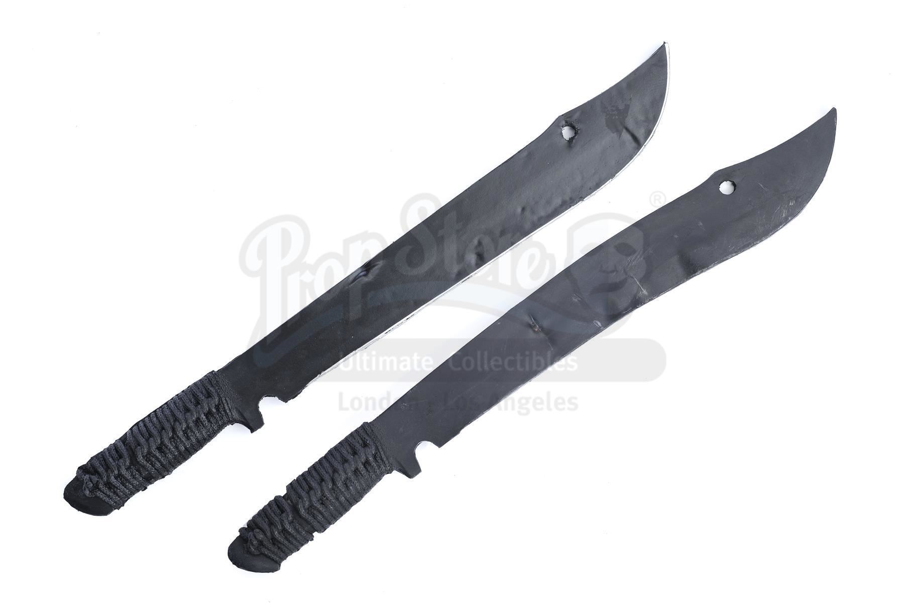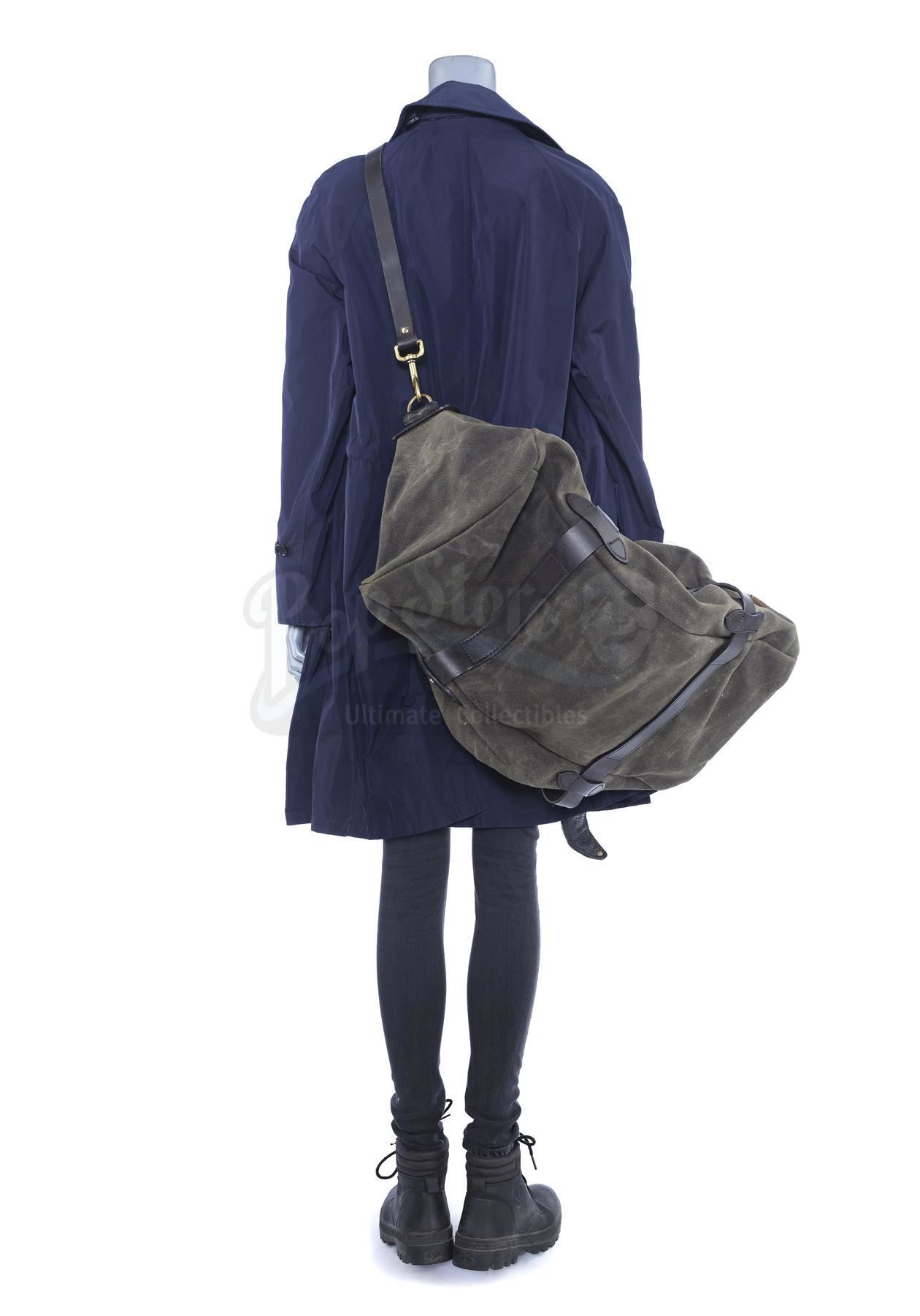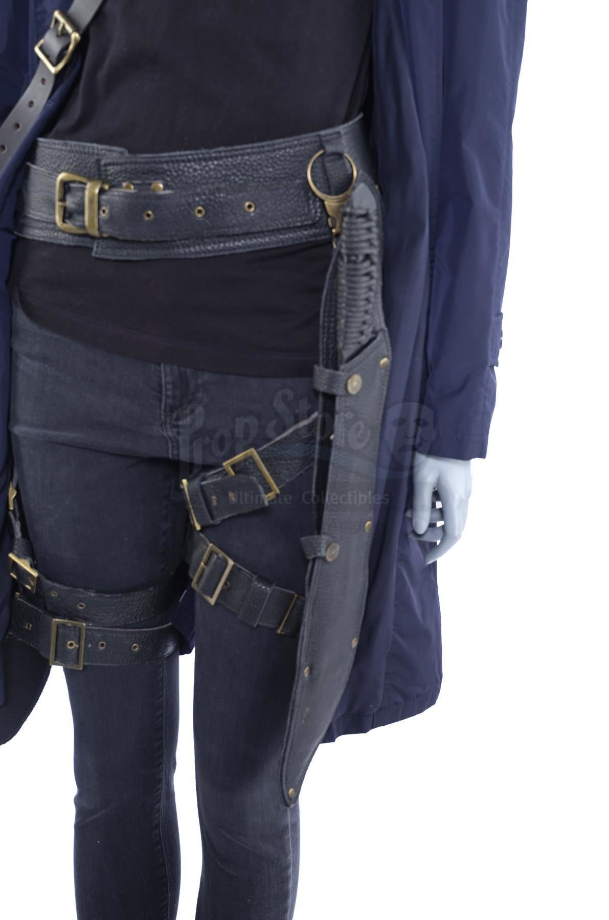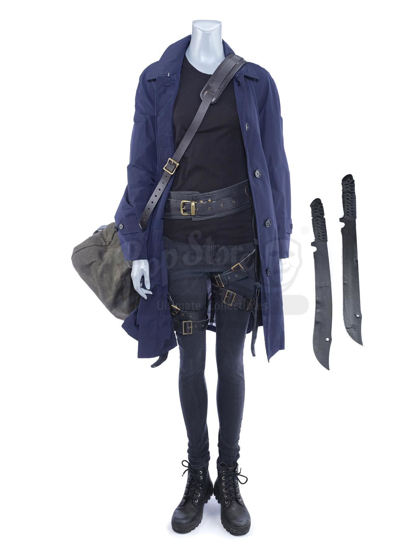 Mary Walker's warehouse costume with stunt machetes and a duffel bag from the episodes 'War Without End' (209) and 'A Duel of Iron' (210) of Marvel's Iron Fist. In the episodes, Walker wears her costume when she attempts to rescue Joy Meachum from Davos. This lot consists of a navy cotton raincoat, a black cashmere shirt, black denim jeans, a pair of black leather and rubber boots labeled 'Tanya' (Mary's pseudonym), a black leatherette belt featuring a pair of sheaths containing a pair of black urethane machetes with faux rope handles, and a canvas and leather duffel bag. The lot is in good overall condition with minor signs of wear from production throughout.
