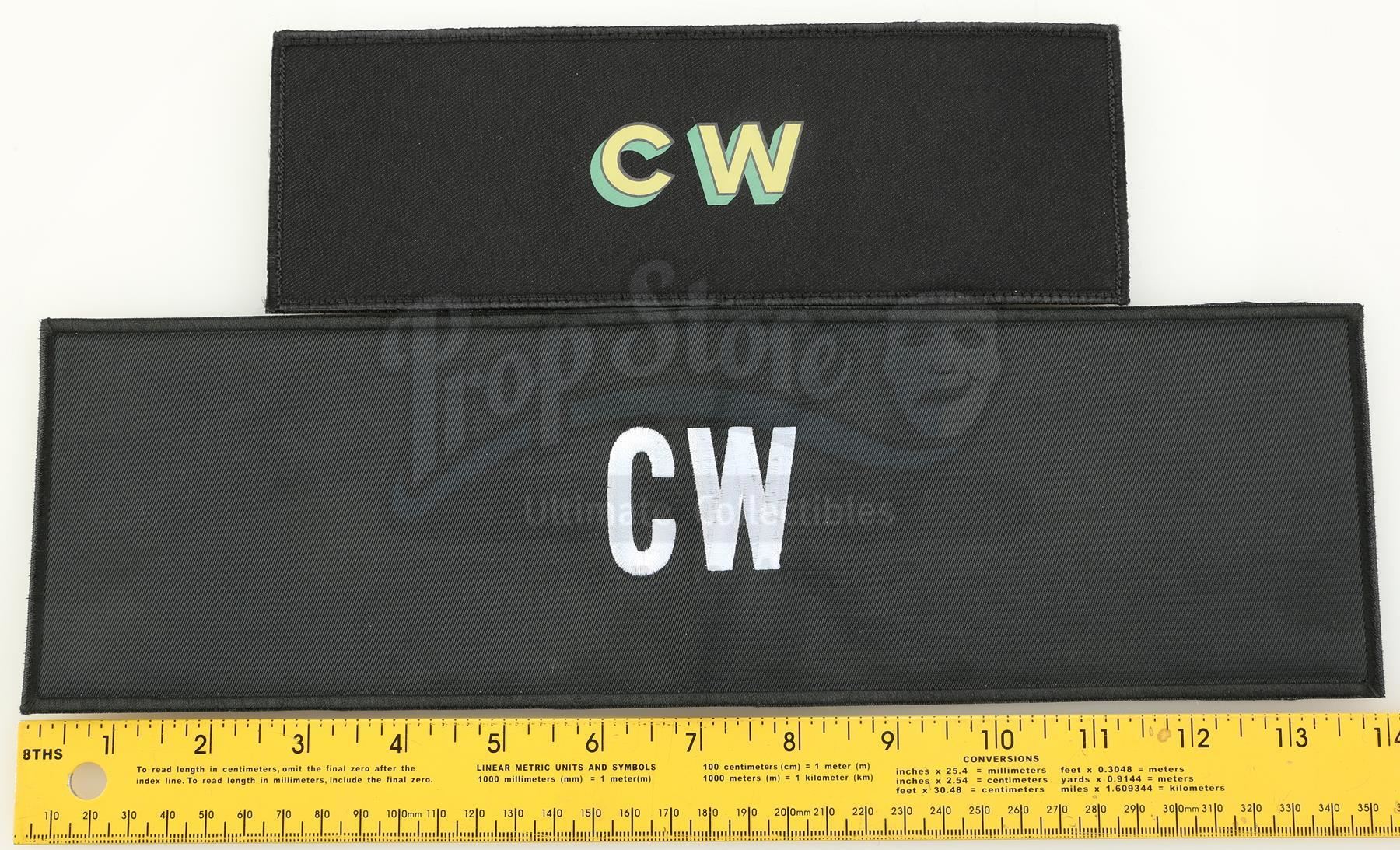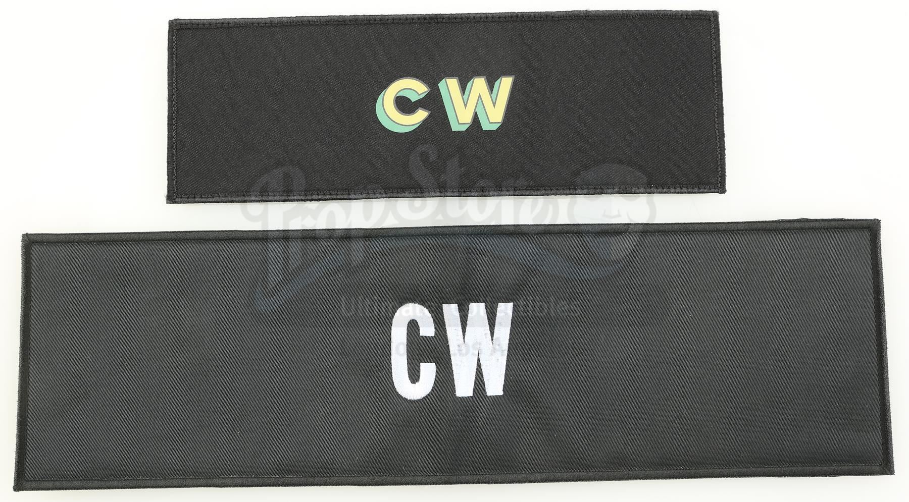 A pair of Colleen Wing's 'CW' chairback attachments from Seasons 1 and 2 of Marvel's Iron Fist. Wing, Danny Rand's closest ally, appears throughout the series. This lot consists of a pair of black canvas chairback attachments, one from Season 1 and the other from Season 2, with the initials 'CW' for Colleen Wing emblazoned on both. It is in good overall condition with minor wear from production.