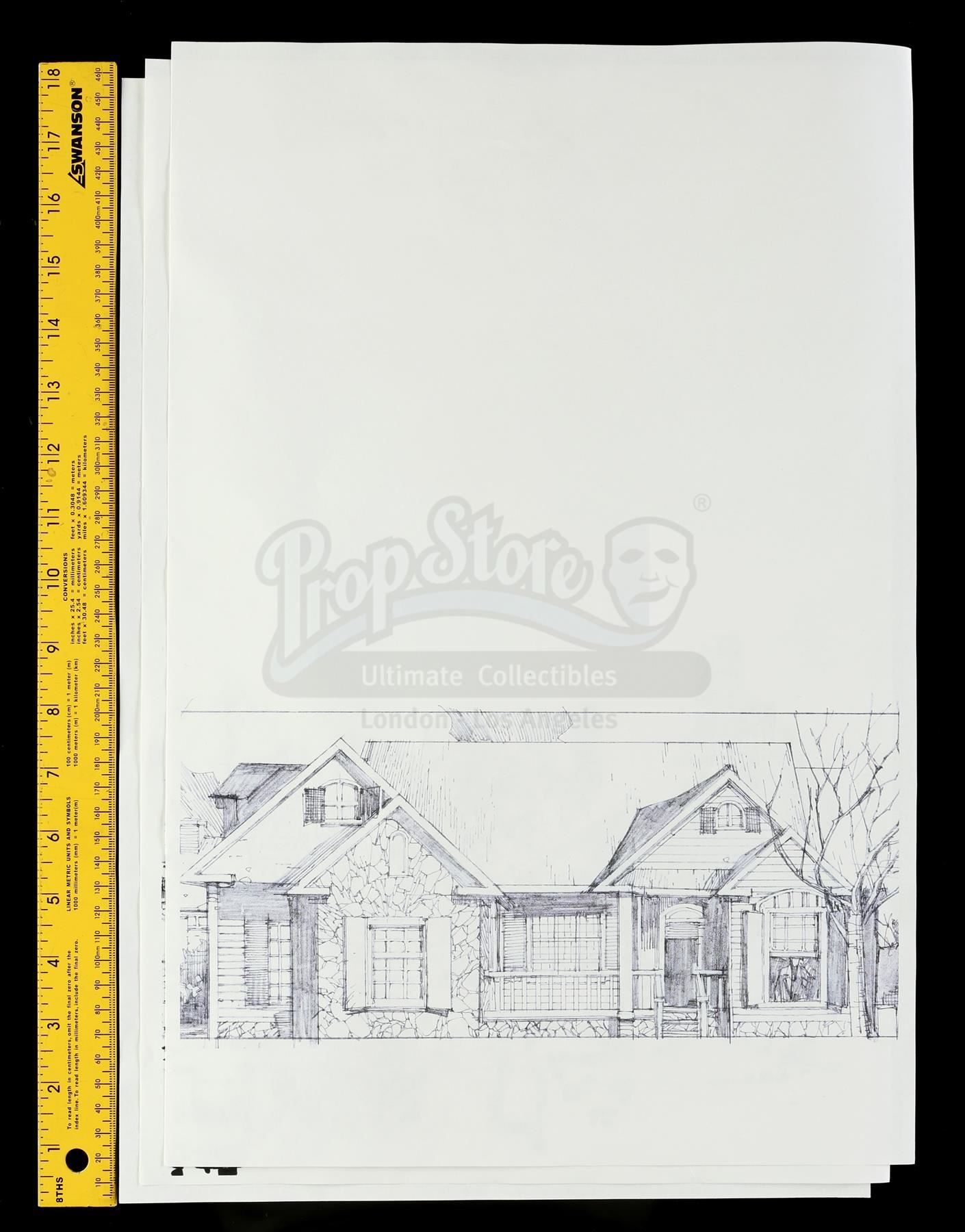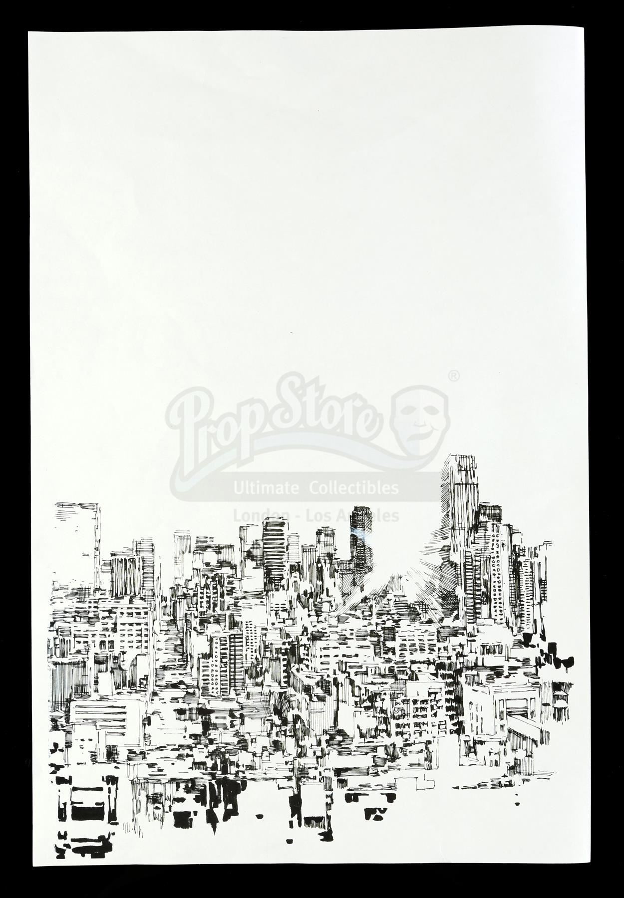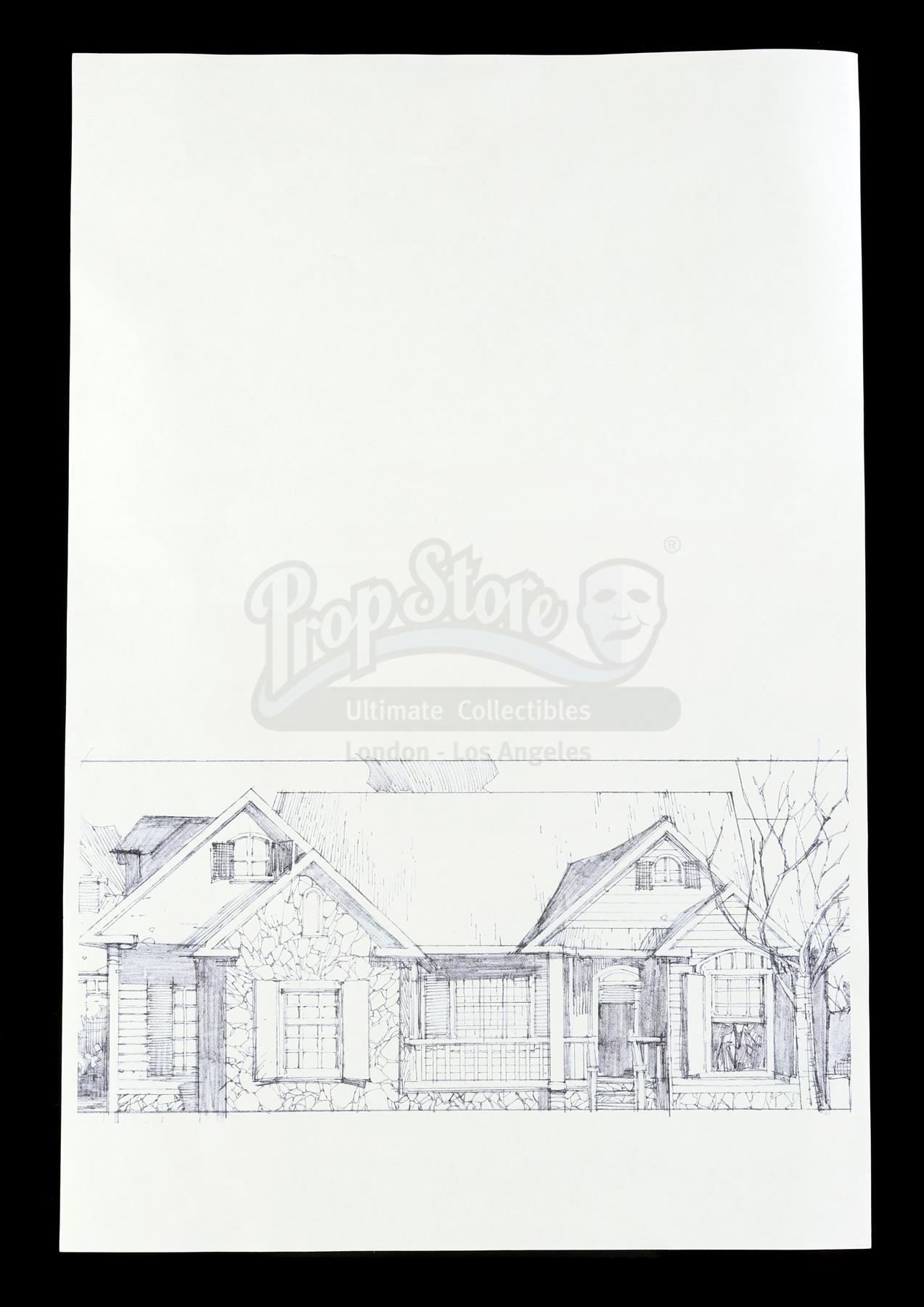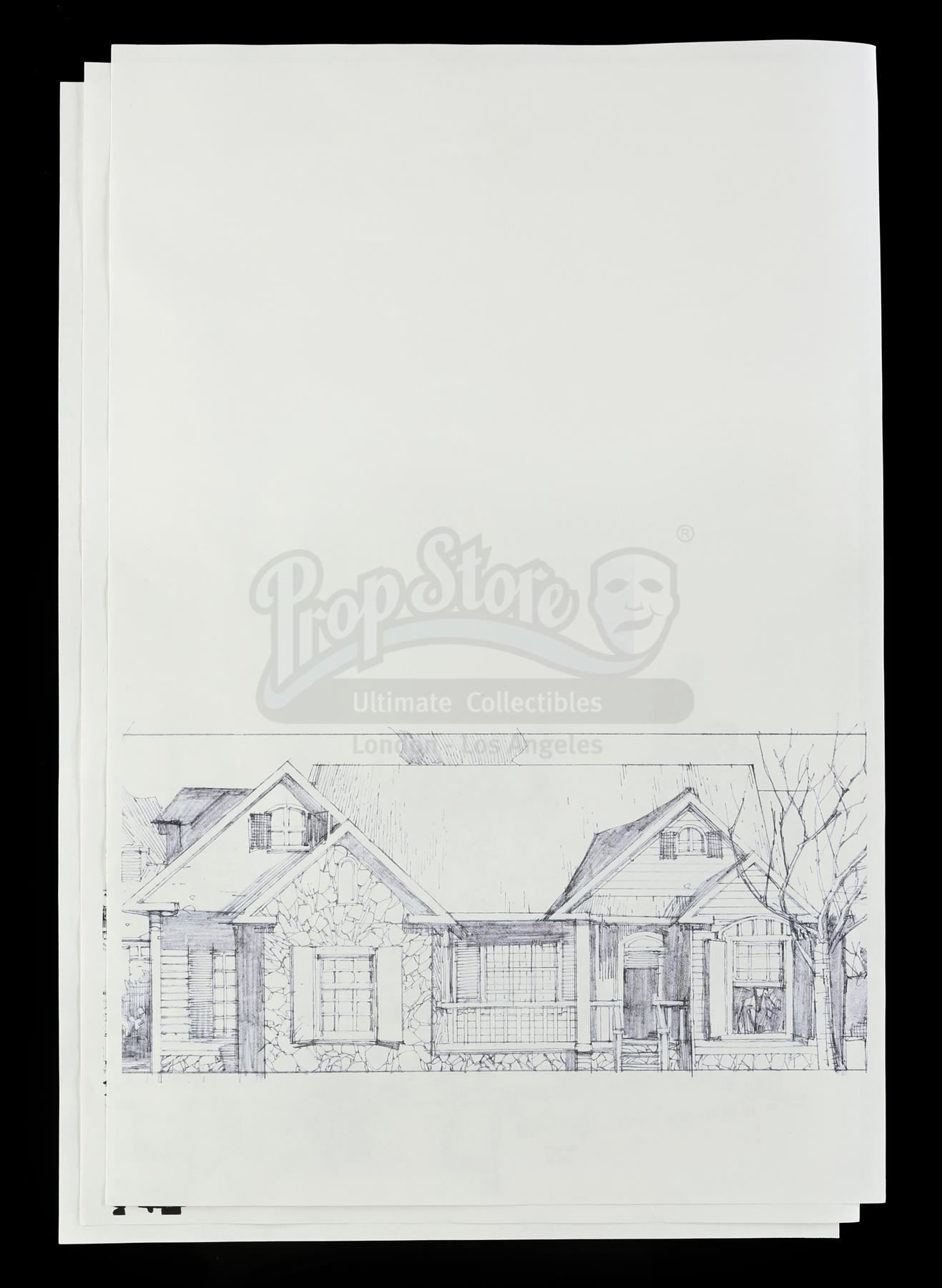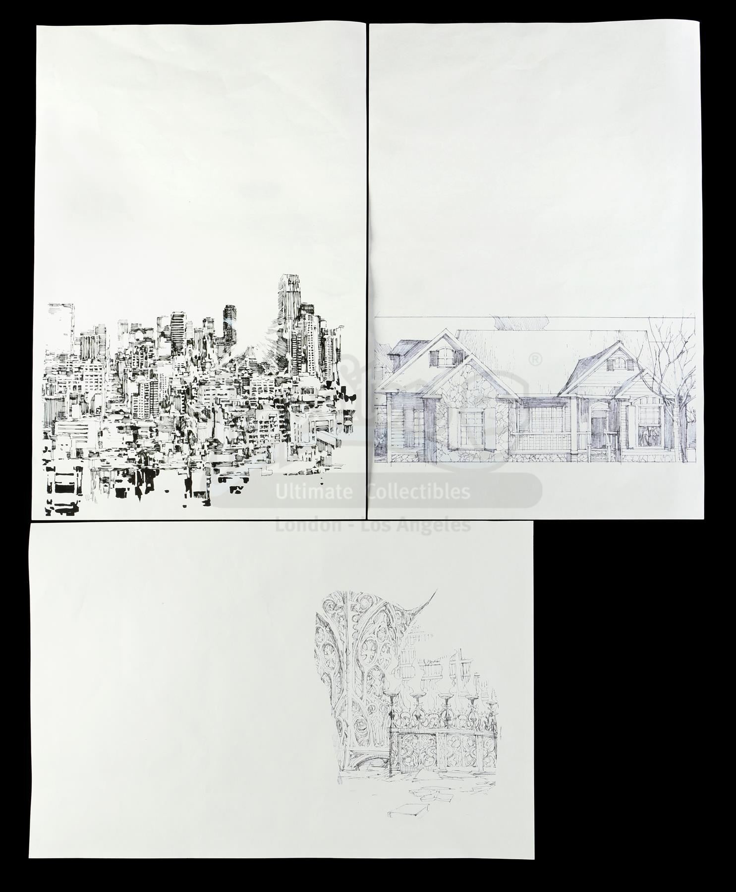 A set of three of Mary Walker's architectural drawings from Season 2 of Marvel's Iron Fist. Walker looks through sketchbooks full of her drawings, including renderings of various architecture, throughout the season. These printed paper illustrations depicting a cityscape, a house, and an architectural abstraction were designed by artist Leinil Yu. They are in good overall condition with minor signs of wear from production.
