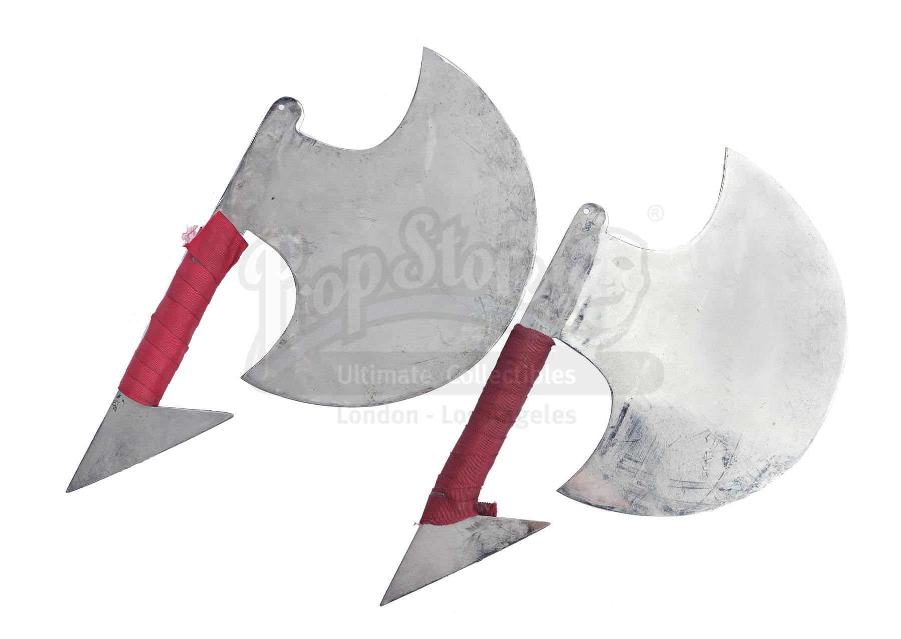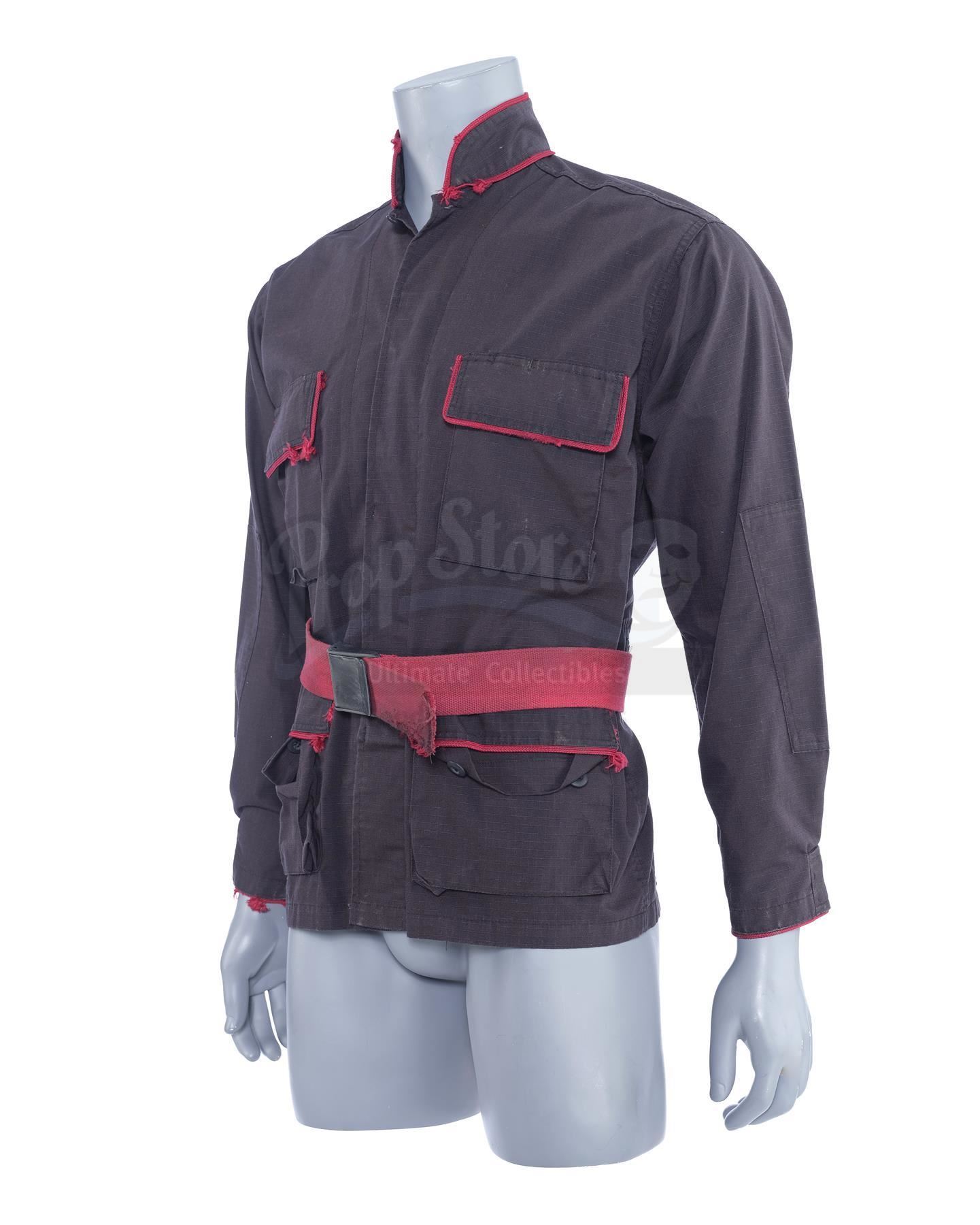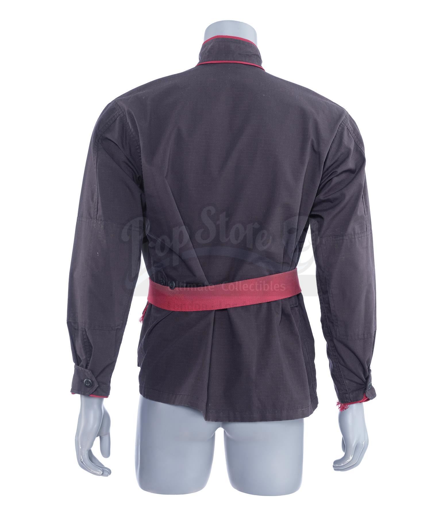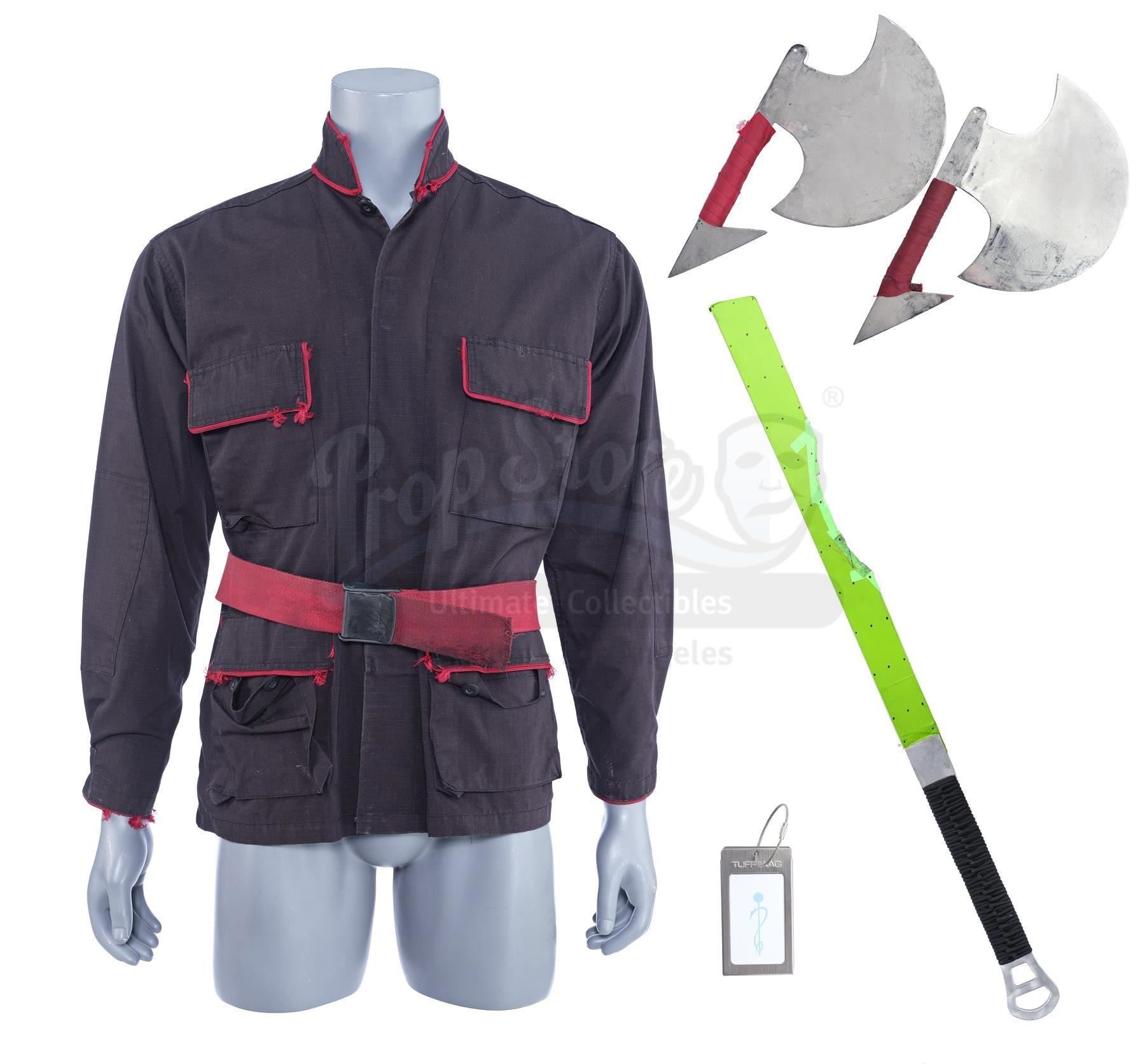 The Hand guard costume components and assorted weapons from Season 1 of Marvel's Iron Fist. Harold Meachum uses his sword to kill a man who attacked Joy Meachum, and Danny Rand encounters heroin-dealing agents of The Hand throughout the season. This lot consists of a black cotton jacket with red details and a red belt, a metal, plastic, and paper luggage tag, pair of metal and wooden blades with crimson ribbons bound to the handles, and a VFX stainless steel sword handle with a green tape-covered wooden blade. The lot is in good overall condition with various signs of wear from production throughout.