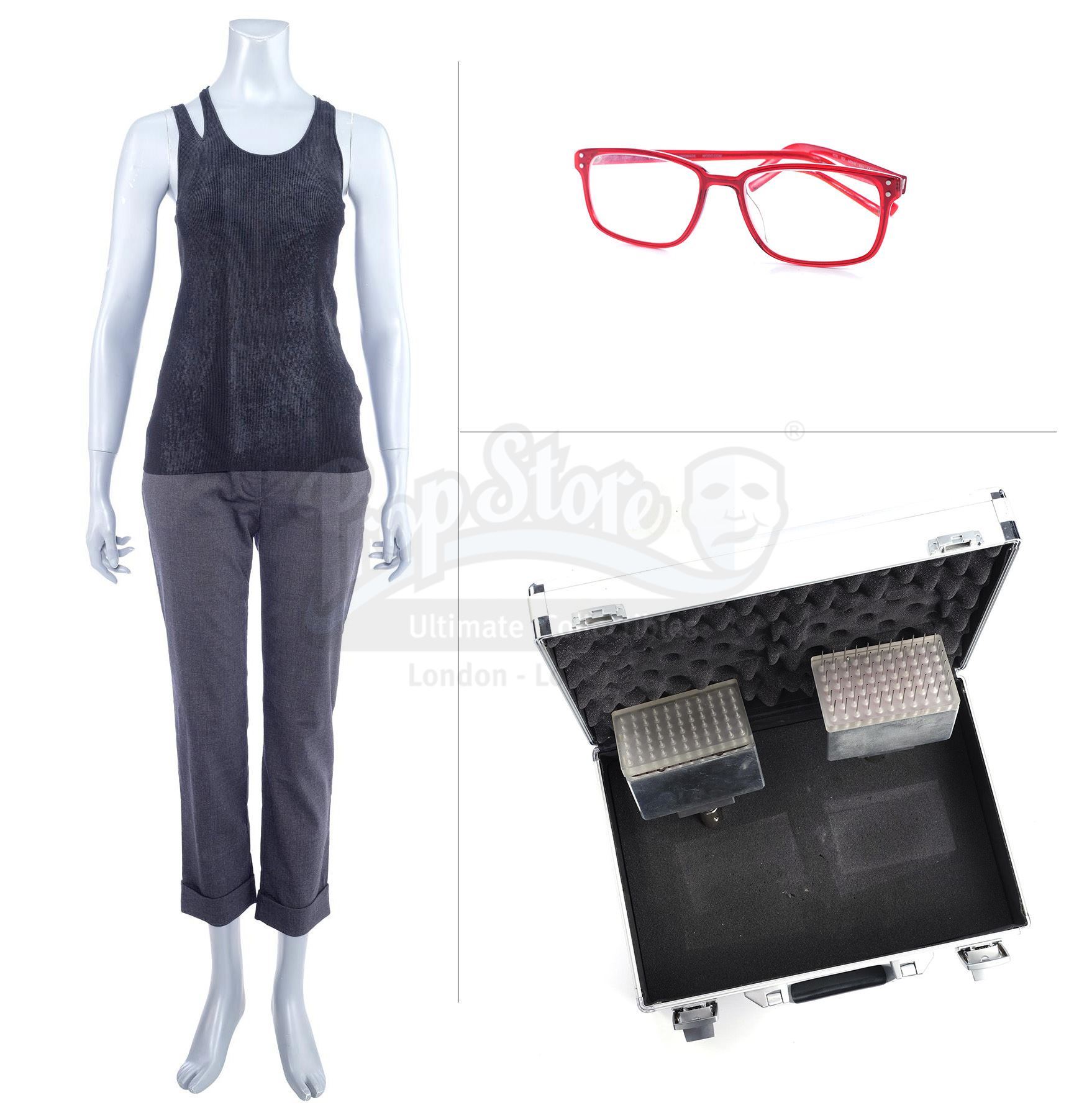 A set of Trish Walker and Karl Malus' genetic editing materials from the episode 'AKA Three Lives and Counting' (211) of Marvel's Jessica Jones. In the episode, Malus injects a desperate Walker with modified DNA in an attempt to give her superpowers. This lot consists of two metal block injectors with a resin injection plate, clear plastic tubes, and button-operated metal needles, as well as a pair of glasses with translucent crimson polymer frames, a black viscose and polyester stunt shirt, and a pair of black wool stunt pants. The lot is in good overall condition with some wear from production. This item contains mechanical components. While every effort is made to describe them accurately, no guarantee or warranty is made as to the functionality, lifespan or safety of those components. It is entirely incumbent on the new owner to satisfy themselves as to their safe use and maintenance.